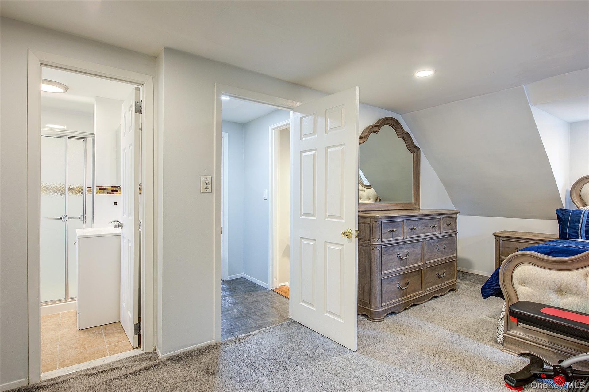 - Bedroom featuring light colored carpet, ensuite bath, vaulted ceiling, and recessed lighting