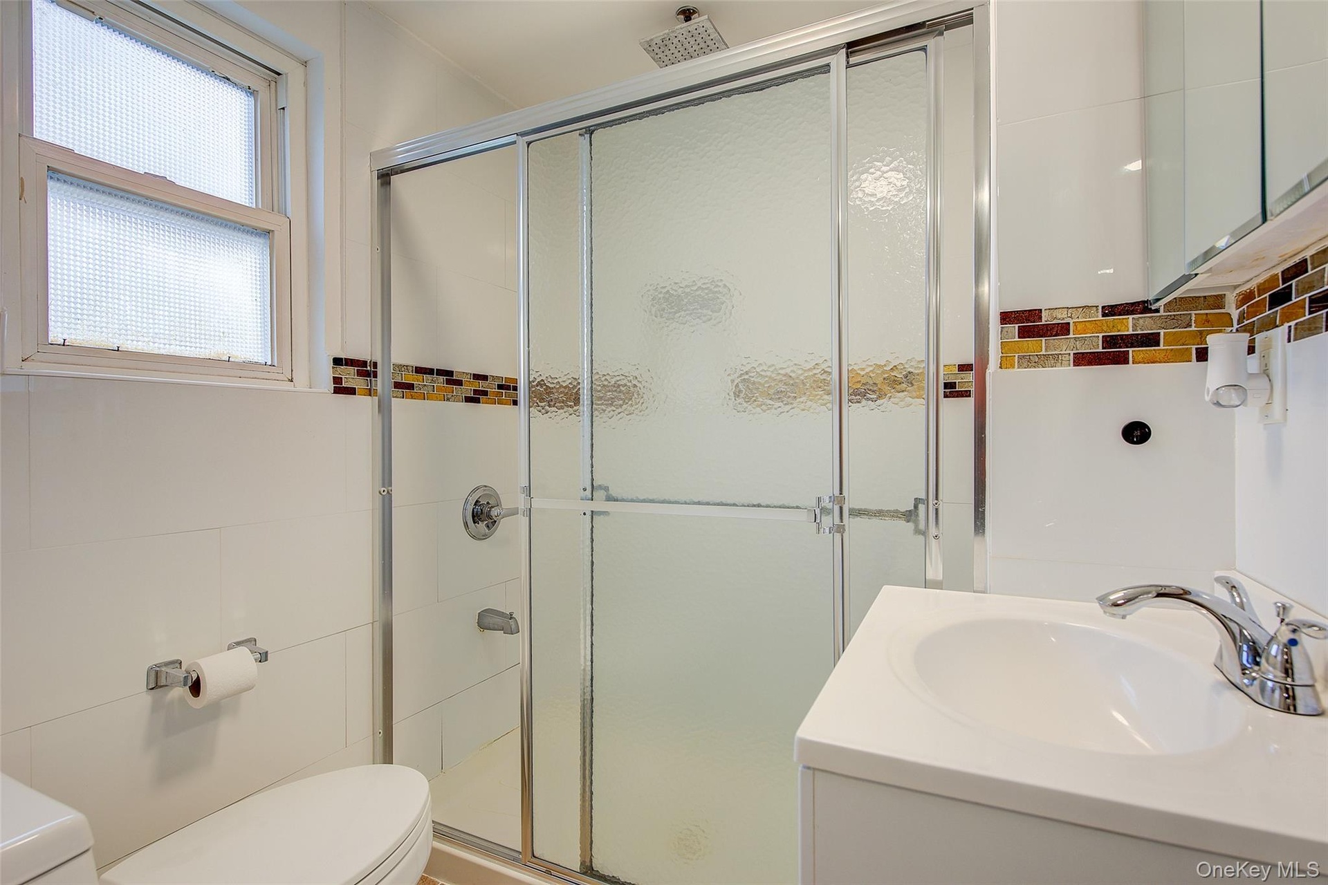 - Full bath featuring a shower stall, tile walls, and backsplash