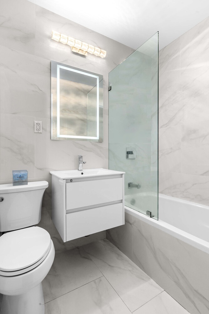 The windowed kitchen features sleek stainless-steel appliances and crisp white cabinetry, offering clean lines and modern utility. The bathroom has been reimagined with large-slab porcelain tile, a Grohe shower head, a recessed medicine cabinet, and a mirror with multiple lighting options, all anchored by a backlit vanity with ample storage.