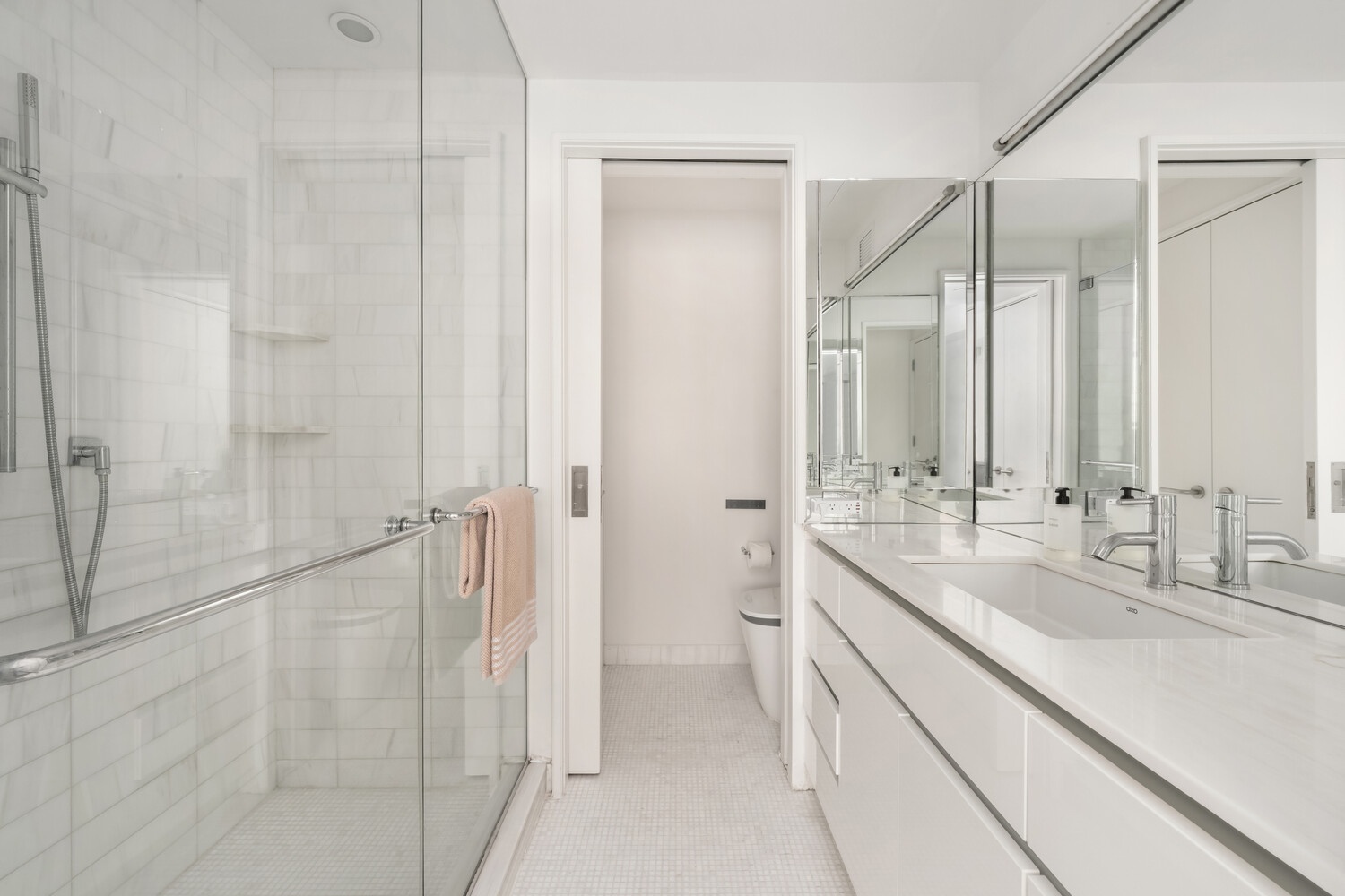 Both bedrooms offer oversized dual-pane windows, with the primary suite featuring a well-considered layout, a generous walk-in closet, and space to comfortably accommodate a king-size bed. The spa-inspired bathrooms are outfitted with Hansgrohe rain showers, Thassos stone finishes, lacquer cabinetry, and Woodbridge smart bidet toilets, creating a luxurious and tranquil retreat.