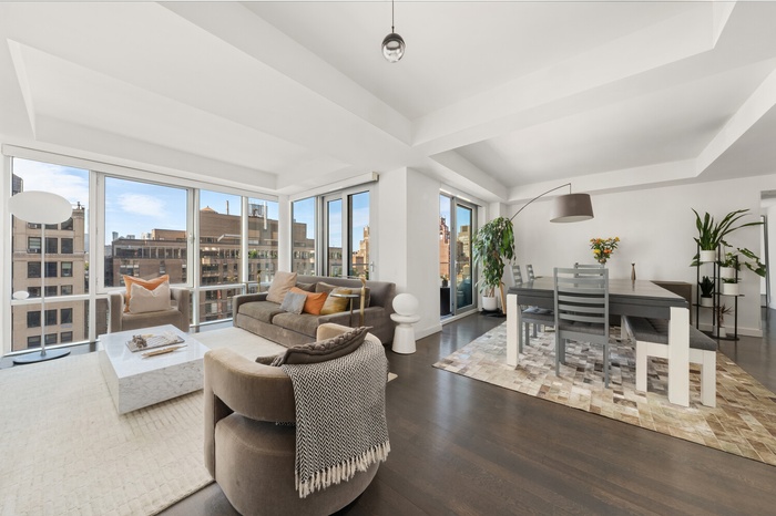 This stunning penthouse at 14 West 14th Street presents a rare opportunity to live at the intersection of Greenwich Village, Flatiron, Union Square, and Chelsea. Perfectly situated in the heart of everything that defines downtown Manhattan, this expansive two-bedroom, two-bathroom corner residence offers a seamless blend of refined interior living and extraordinary private outdoor space.