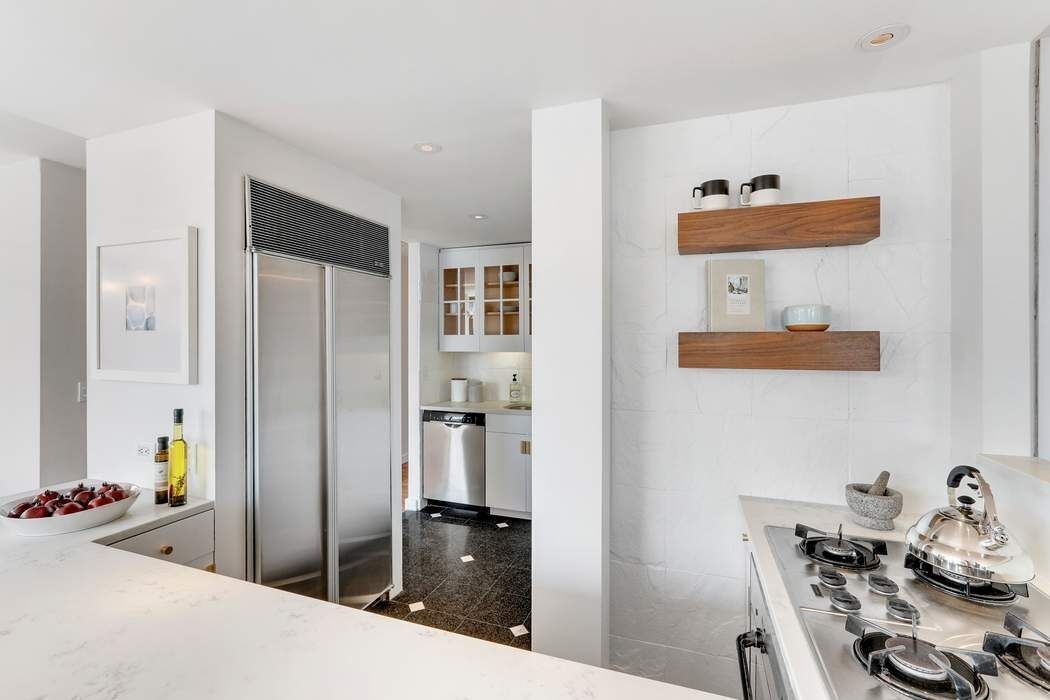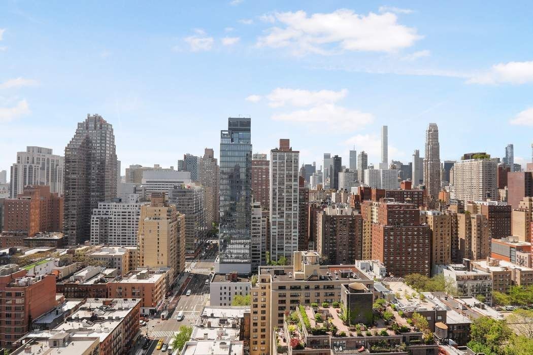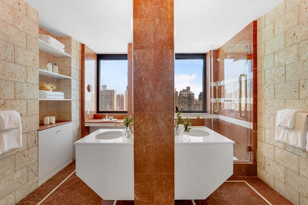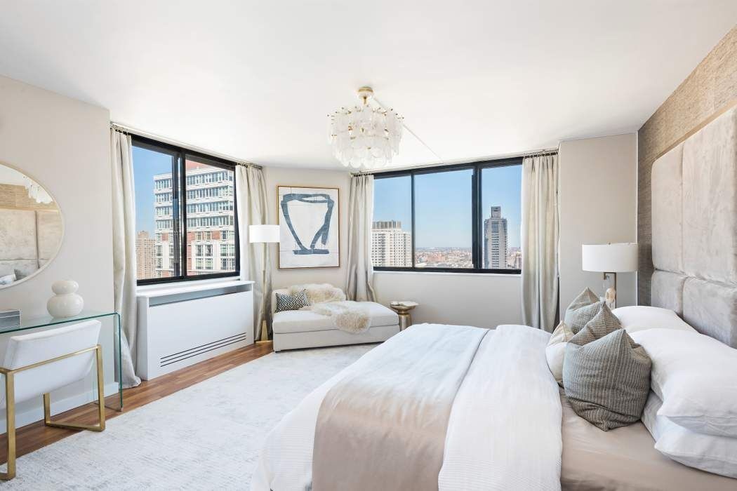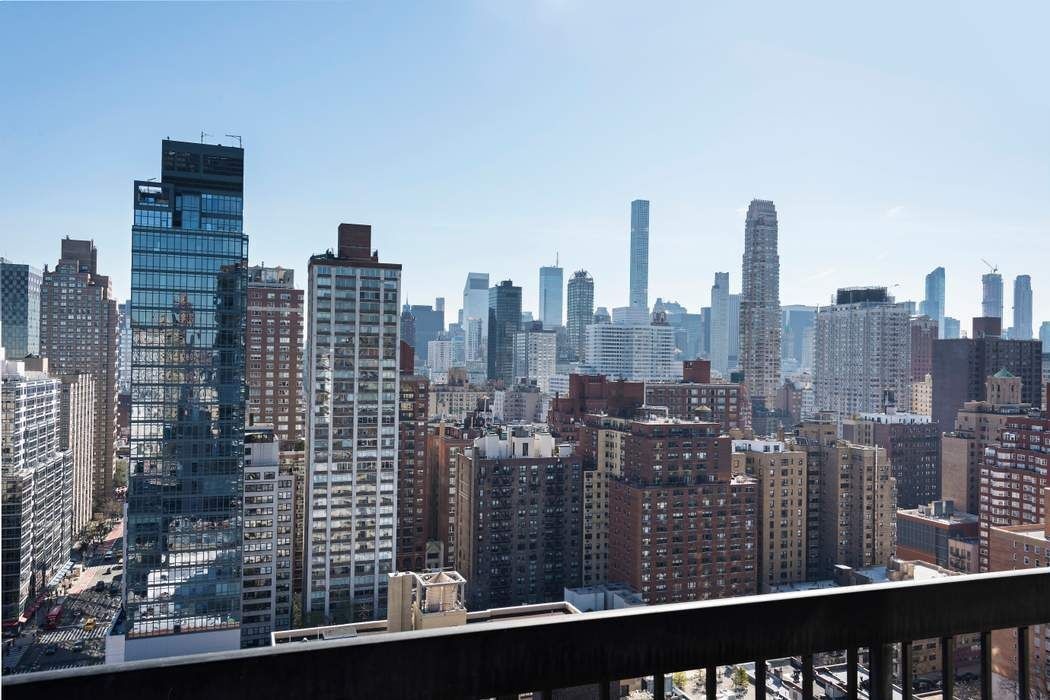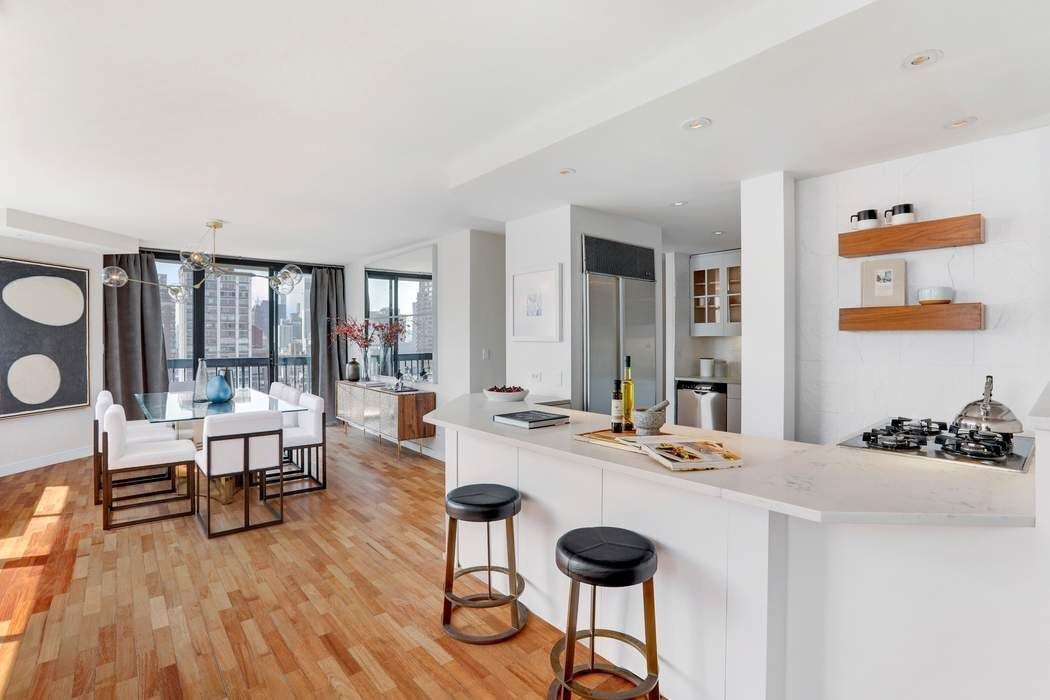 This approximately 2,400 +/- sq. ft. home in the sky features a flexible layout including a private home office, a large corner living room and formal dining room with dramatic views to the East and South, two private terraces and a washer/dryer. The master bedroom wing features a windowed walk-in closet/dressing room, en-suite spa bathroom, and views to the North and East. The recently updated open kitchen boasts white Caesarstone countertops and a breakfast bar for more informal dining. The guest suite is massive and bright featuring and en-suite windowed bath, open city views to the South and enough space to accommodate a king size bed and seating area.