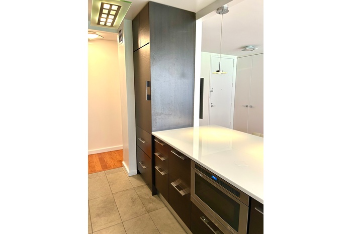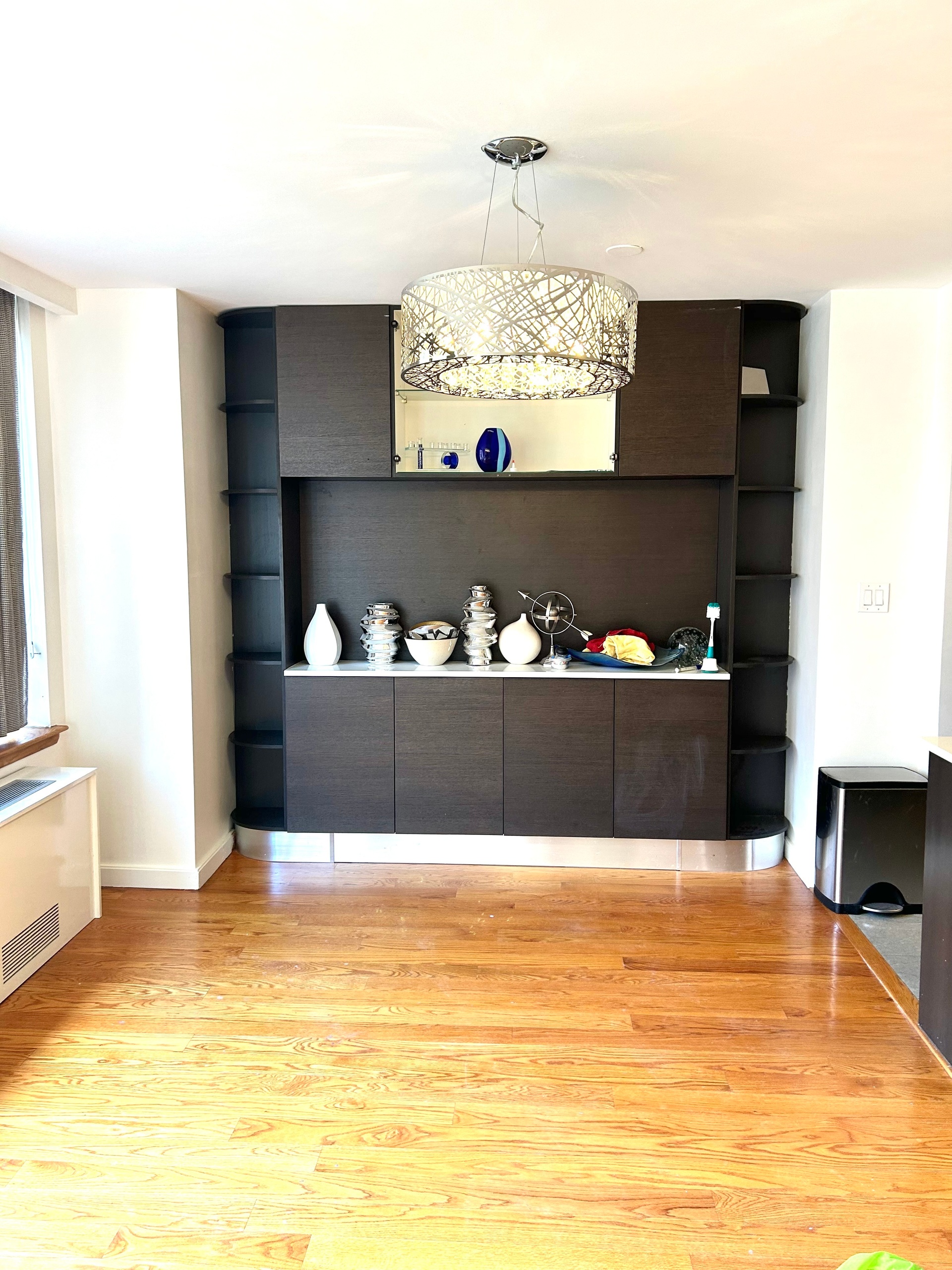 Entering the unit, you notice the beautiful plank wood floors throughout, along with the bright view from the wall of windows overlooking tree-tops and the charming prewar architecture across Broadway. The beautifully renovated kitchen features a huge island/breakfast bar, high-end stainless appliances, double stainless sink, and gorgeous backsplash. The pass-through layout allows for easy-access and comfortable living. The additional dining area has a built-in buffet/bar area with storage and shelving for displaying art/decor. Designer light fixtures add to the upscale look and feel of the space.