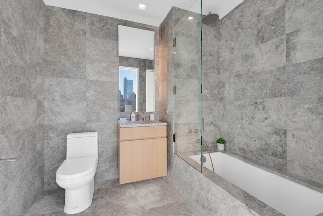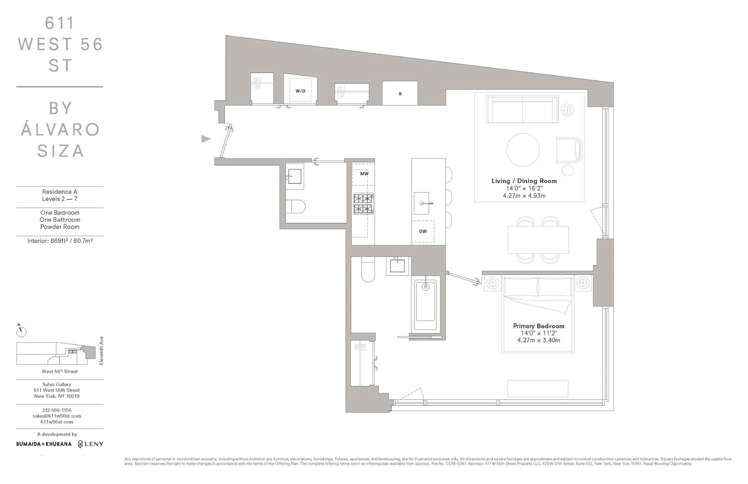 Presenting 1 BED 1 1/2 Baths residence 7A at 611 West 56th Street. This one-of-a-kind southeast-facing corner one-bedroom, one-and-a-half-bath residence spans an impressive 868 square feet, offering refined elegance, abundant natural light, and contemporary sophistication. The coveted A-line layout is bathed in sunlight through oversized corner windows, complemented by wide-plank white oak flooring and a serene neutral palette. A discreet powder room near the entryway adds a touch of privacy for guests while entertaining.