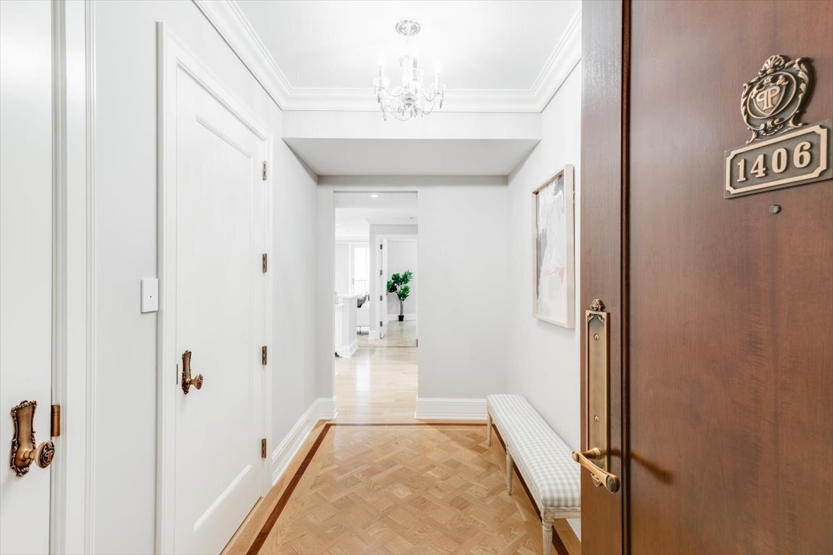 Enter through the building’s private, resident-only entrance and grand attended lobby. A gracious foyer and classic herringbone floors set the tone, leading to a spacious living area and a beautifully appointed, windowed chef’s kitchen. Outfitted with top-of-the-line Viking and Miele appliances, Nero Marquina stone countertops, and Calacatta marble mosaic backsplash, the kitchen is designed to impress.