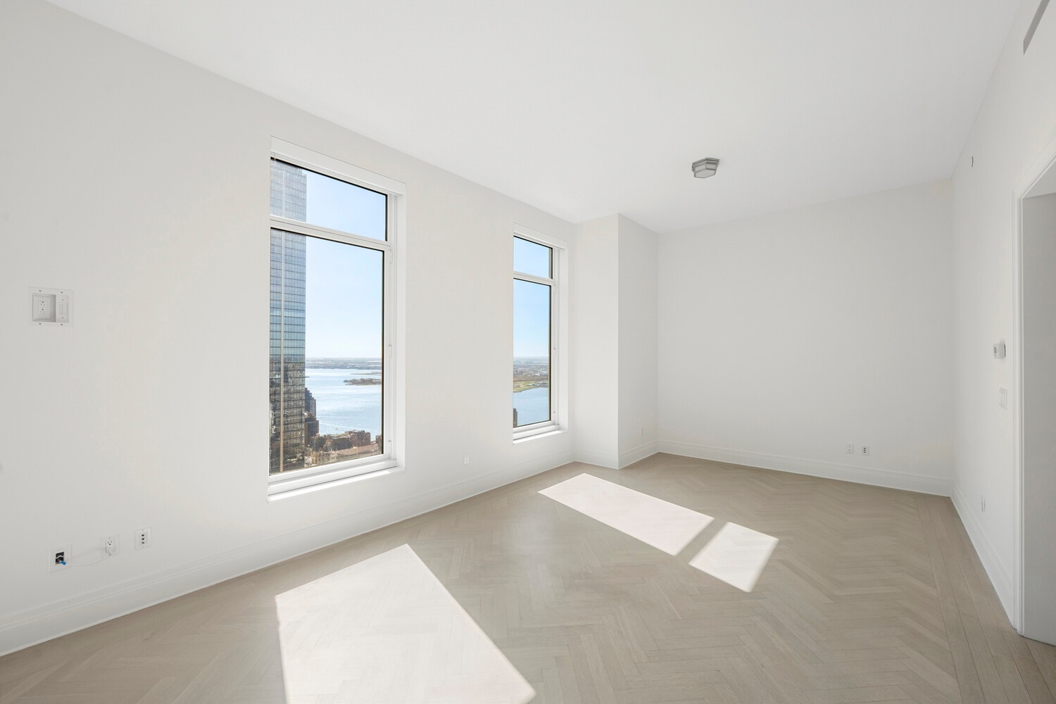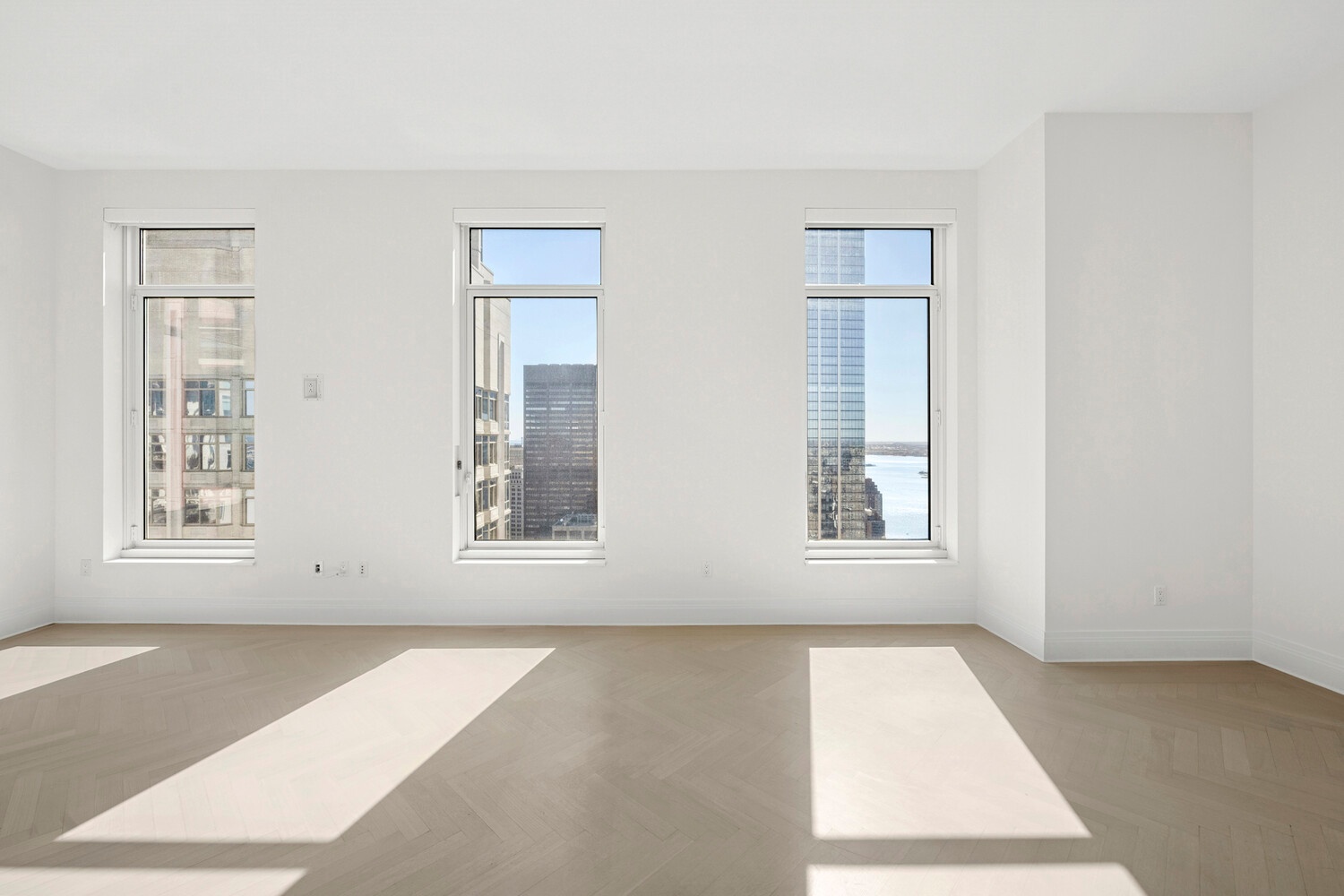 This palatial palace in the sky is perched on top of the ultra luxurious Four Season Hotel and features stunning southeast views of the New York Harbor, WoolWorth Tower, the East River river and the Brooklyn skyline. Gaze at epic sunrises, sail boats, and seaplanes from almost every corner of the unit from the oversized bay windows. The master bedroom is contained within it's own wing of the apartment for total privacy with a walk in closet and separate shower and tub in the ensuite Chinchilla Mink marble bath. The warm interior finishes include solid oak wood flooring with herringbone pattern in the formal rooms, Bilotta rift-cut oak kitchen cabinetry, Gaggenau appliances, marble bathrooms with Robert A.M. Stern custom-designed vanities.