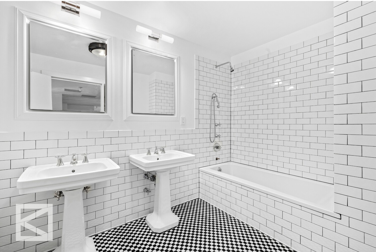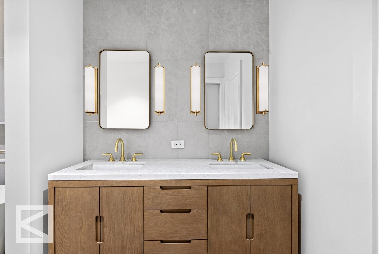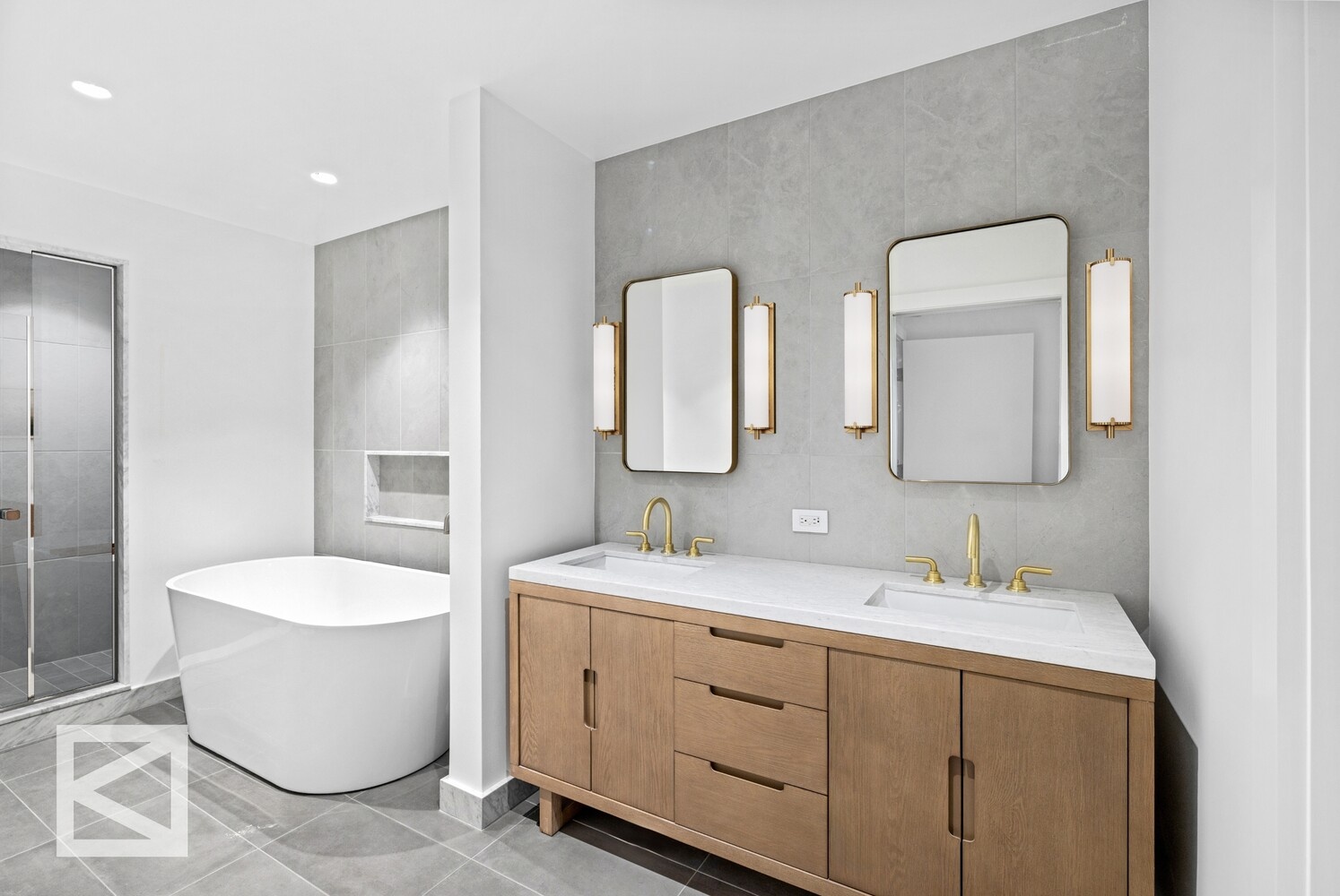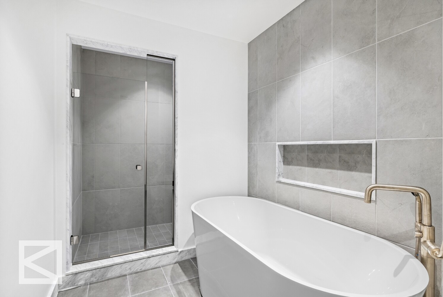 Revel in the opulence of a freshly gut-renovated, spa-level walk-in bathroom featuring a five-piece set, including a lavish en-suite bath meticulously designed with thick slab-cut marble finishes, a freestanding soaking tub, and high-end California Faucets fixtures.