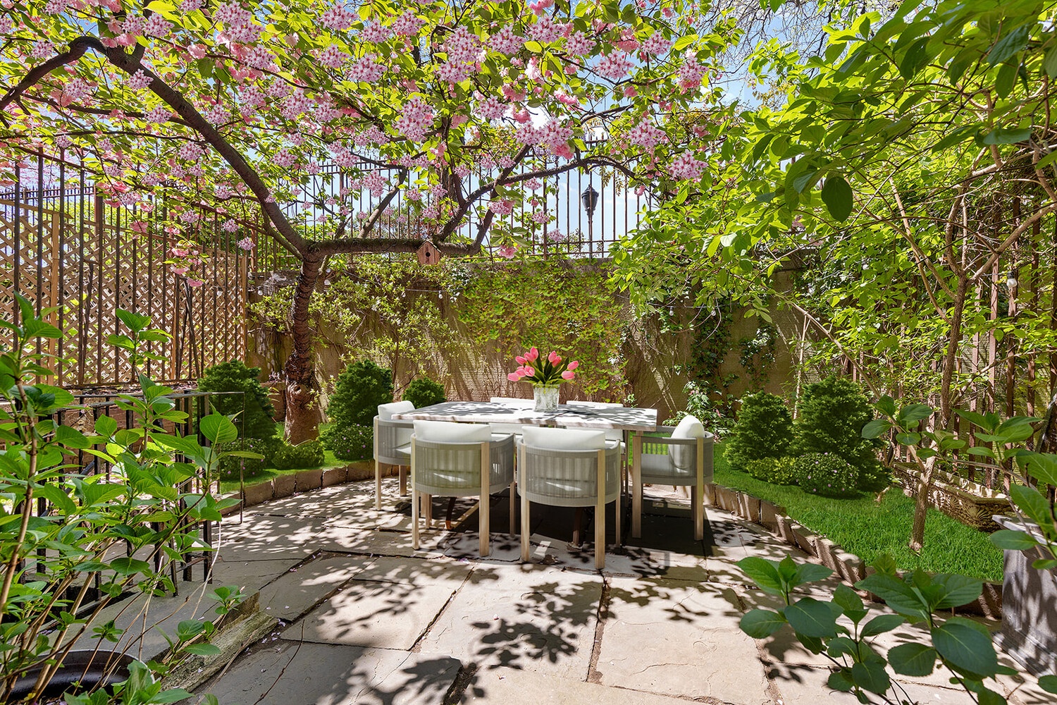 Originally built in 1860, this beautifully restored co-op spans two levels and opens directly to a lush, private garden oasis that borders the Brooklyn Heights Promenade. Framed by blooming trees and vine-covered walls, the outdoor space offers a tranquil escape with views that stretch toward the waterfront.