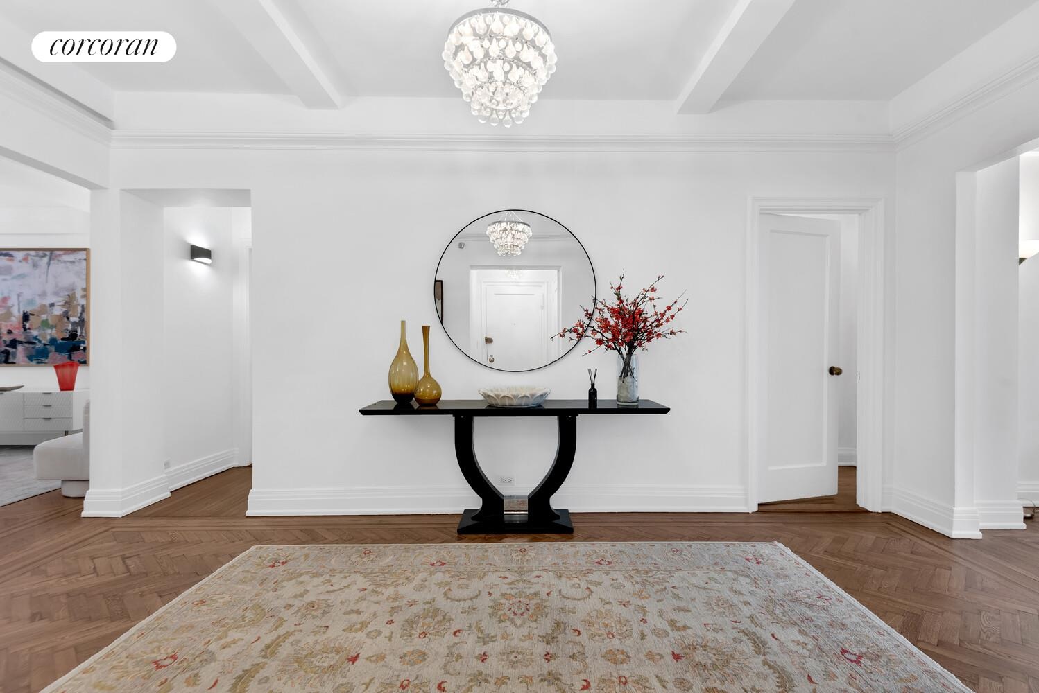 Superbly positioned across from Central Park in one of the Upper West Side's premier full-service buildings, Apartment 4A at The Ardsley is an expansive, sun-filled 7-room Park view corner home. Beautifully renovated with plentiful modern comforts complemented by the elegance, scale and detail of the original prewar architecture. The well-planned layout is currently configured as a three-bedroom plus guest bedroom (original staff room) and two-and-a-half bathrooms. Three exposures (east, west, and north), two corner rooms, and oversized windows fill the entire home with gorgeous natural light. The green trees of Central Park fill the windows of both the living room and primary suite, showcasing the splendor of the city's most beautiful oasis throughout the seasons.