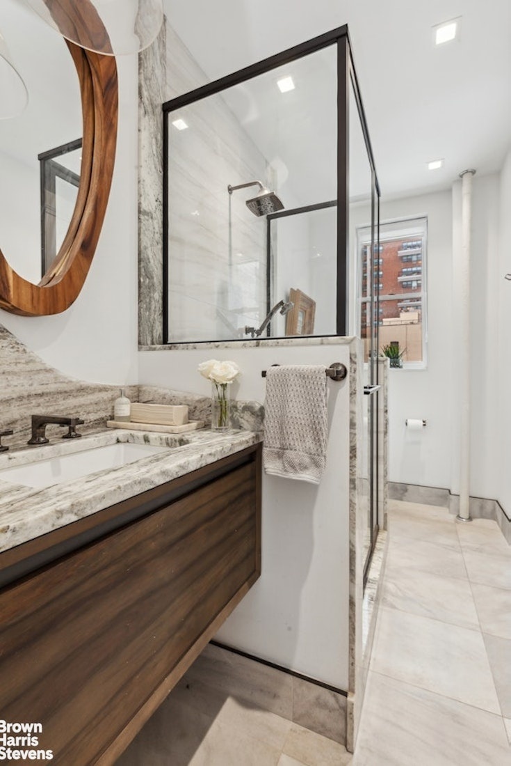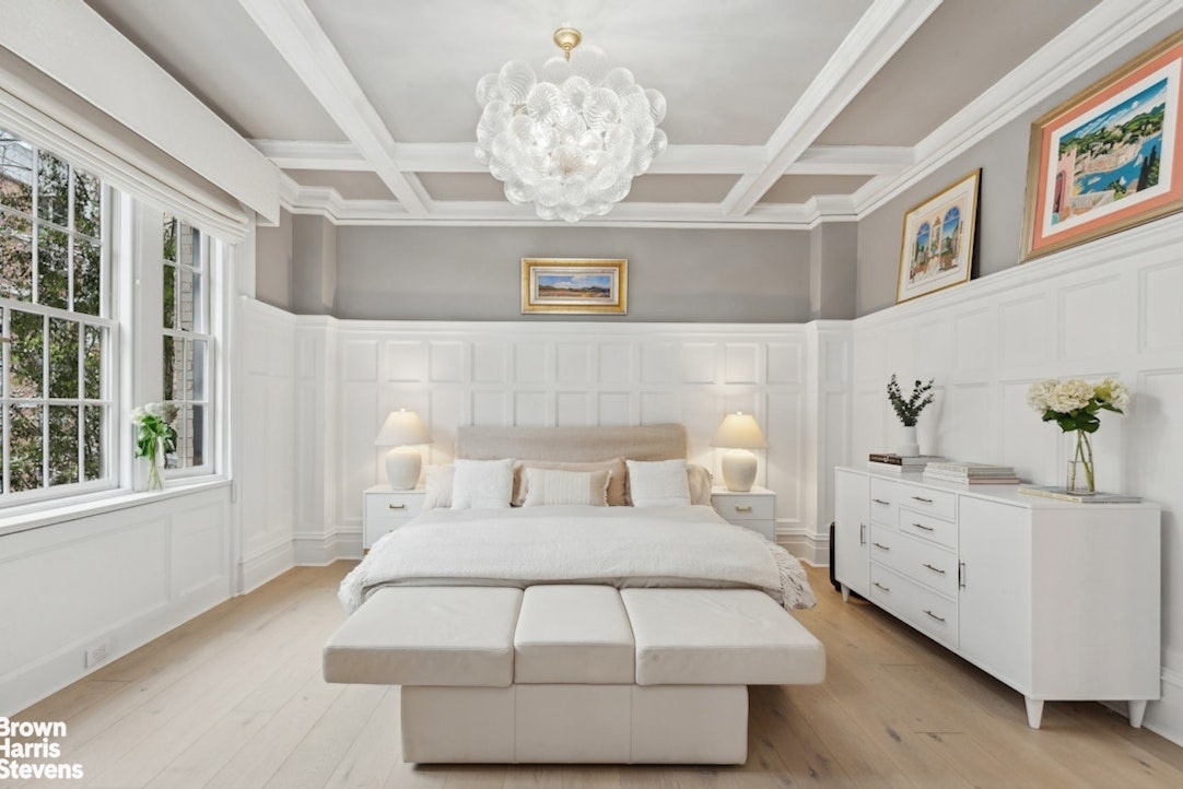 Downstairs, the private bedroom wing serves as a serene retreat. The south-facing primary suite includes a spacious sitting room and a beautifully appointed bedroom, cleverly separated by bi-fold French doors to allow for flexible use. Oversized windows, a Juliet balcony, and a charming bay window bathe the space in natural light. The primary bath is a work of art, featuring a custom-designed black-and-white origami-inspired glass mosaic, dolomite and emperador marble, satin brass fixtures by Brizo, a porcelain double-wide sink by Lacava, a custom wood vanity, a rain shower fixture, and a privacy glass-enclosed Toto toilet. Two more bedrooms add comfort to this level, while a third flexible bedroom or office provides further versatility. A full windowed guest bath boasts decorative tiling, polished high-gloss onyx fixtures by Brizo, swooping marble countertops, a custom wood vanity, a Toto toilet, and an oversized shower, exuding understated luxury. A third windowed full bath features black-and-white pebble tiles, Nero Marquina marble, Rubinit fixtures, and another oversized shower, ensuring every detail of this residence is designed for comfort and style. This masterfully gut-renovated home was designed by Suzanne Cook, one of the Upper West Side's premier interior designers.