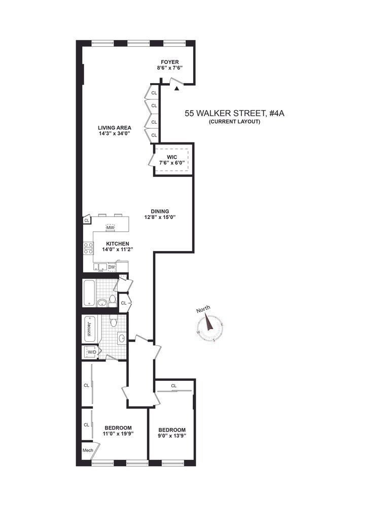 Room to roam in this expansive loft on Tribeca's pre-eminent gallery block. Experience the grand proportions of this 2-bedroom, 2-bathroom loft plus den with 11.5 high ceilings and a 34' long living room. Three over-sized windows facing north light the spacious living and dining areas, and three south-facing windows offer excellent light in the bedrooms. The kitchen is well designed, with a pass-through breakfast bar, marble counter tops, Sub-Zero refrigerator, Bosch dishwasher, and a lovely mosaic tile back splash. The expansive dining alcove is perfectly situated next to the kitchen and can also serve as a den or media room. This voluminous home has a place for everything, with a large walk-in closet and two standard closets serving the entry and living room, and an additional utility closet adjacent to the second full bathroom. The sunny & quiet primary bedroom is lined with floor-to-ceiling closets, and the en-suite renovated bathroom features marble floors, a Jacuzzi bathtub, a Nu-Rest Toto commode, and a stacking washer/dryer. The bright second bedroom also comes equipped with a floor-to-ceiling closet for maximal storage. A generous gallery leads from the north end of the apartment to the south end, creating privacy between the living area and bedrooms. This home is located in an historic Tribeca loft building designed in 1868 by John B. Snook, the architect for Grand Central Depot. With very few structural elements, this loft can be appreciated as is or reconfigured according to your vision and needs. This elevator co-op building is very conveniently located near public transportation, art galleries, Gourmet Garage, and the shops and restaurants of Soho, Chinatown & Tribeca. Some photos are virtually staged. Subletting allowed with approval.