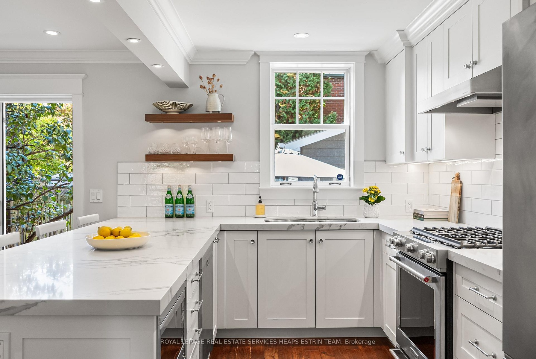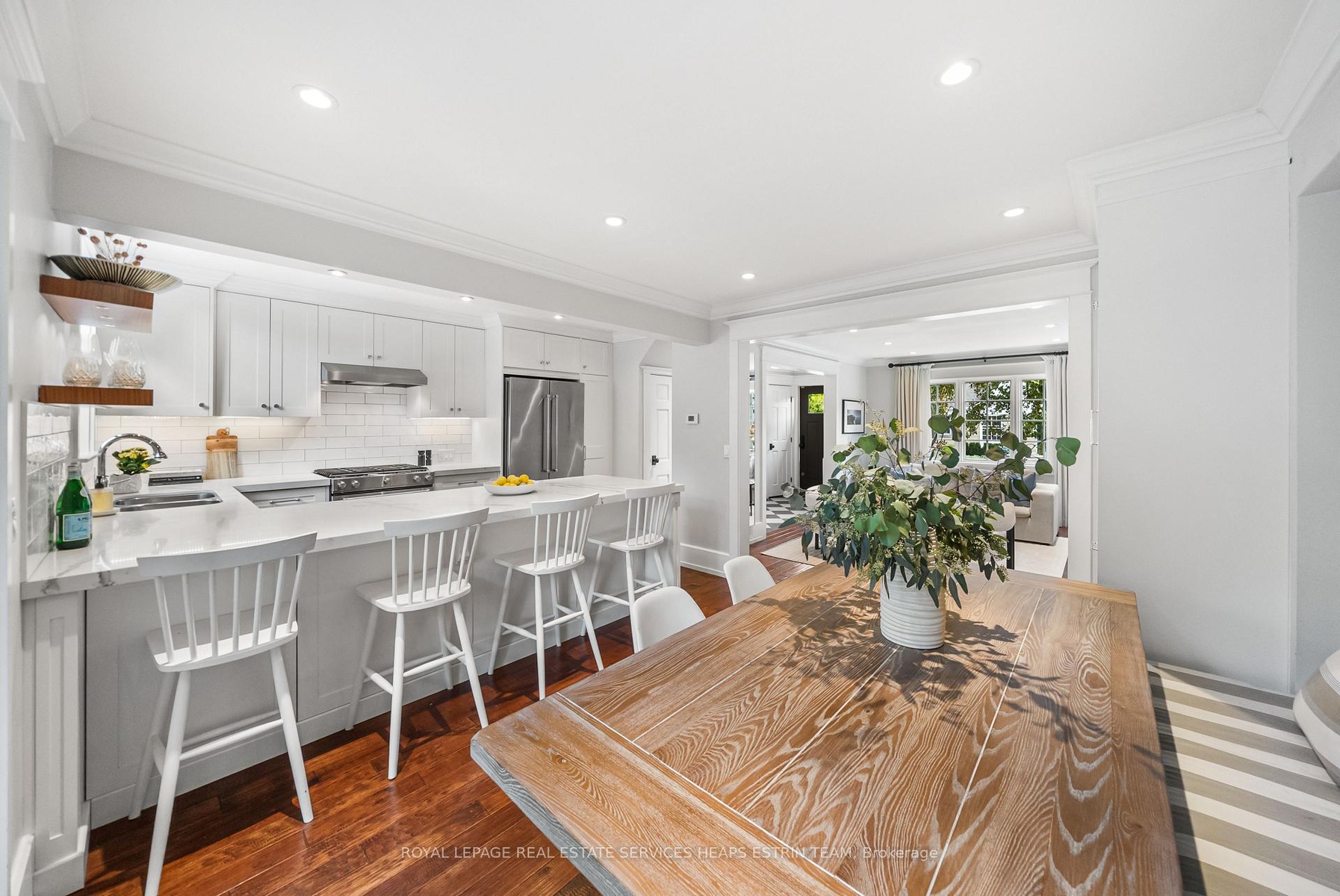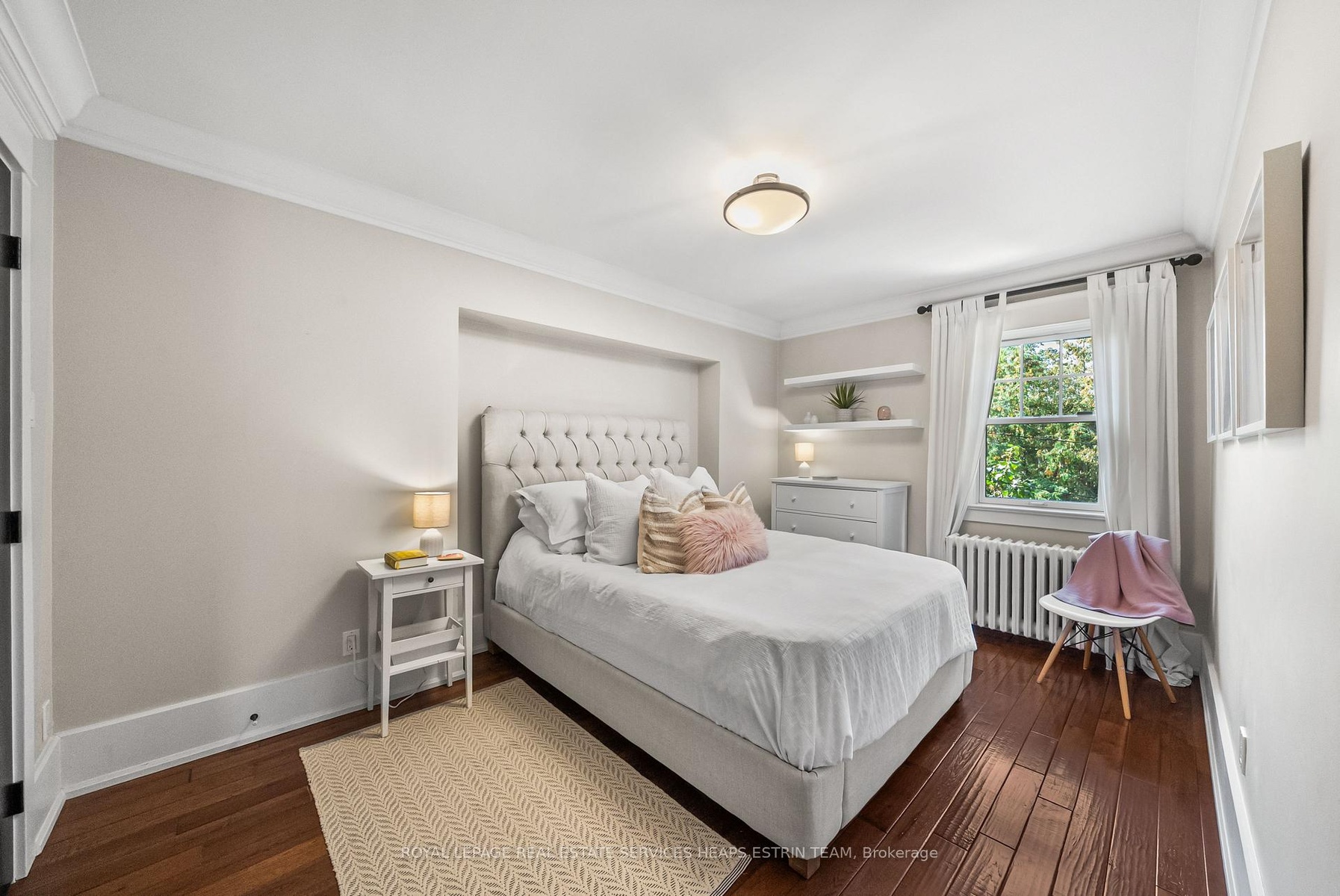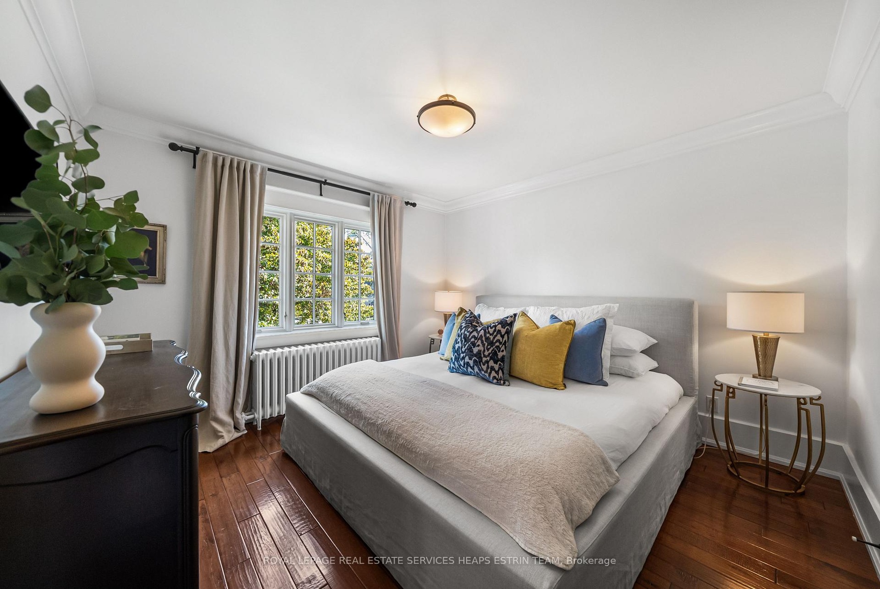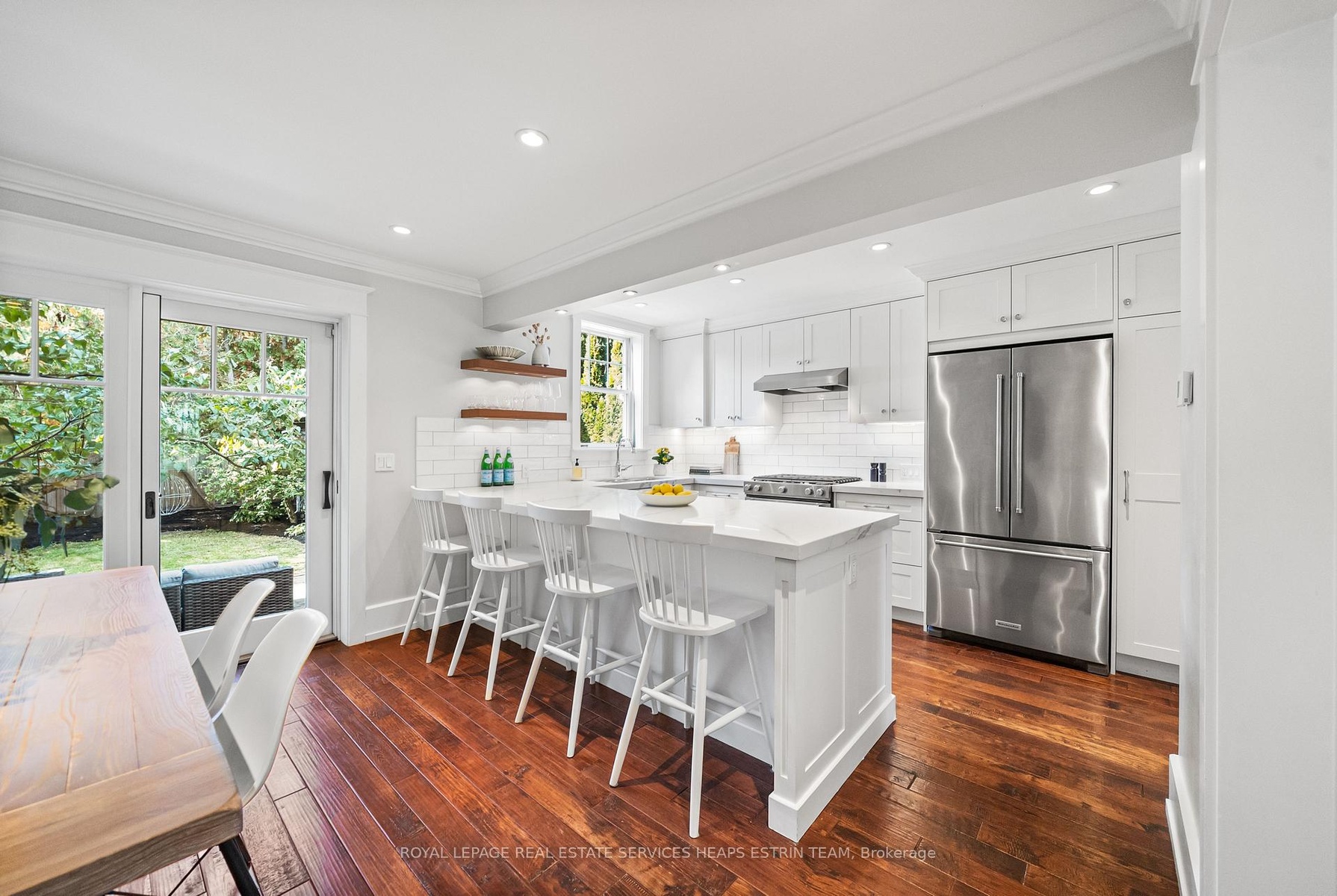 Welcome to 256 Rumsey Road - a classic red brick beauty in South Leaside, fully renovated and full of charm! Every detail radiates warmth, quality and style - from the open-concept main floor to the private garden and rare detached garage. A perfect blend of tradition and modern living in the Bessborough School District.This home features a stunning custom kitchen by Olympic Kitchens with quartz counters, high end appliances and a large breakfast bar that opens to the dining area. A built-in banquette with storage and a gorgeous custom coffee station elevate the living experience, and the sunny west exposure brightens the entire space. The second floor features three well-proportioned bedrooms with hardwood floors and good closet space, including a large primary bedroom with room for a king-size bed. The gorgeous marble-clad four-piece bathroom features heated floors and custom cabinetry. Downstairs, the lower level offers a spacious recreation room with pot lights, an additional bedroom currently setup as an office, and a renovated three-piece bath with heated floors. Laundry and storage are located here as well, plus a convenient separate side door entrance. Enjoy privacy and relaxation in the peaceful backyard, fully fenced in with space to lounge, dine and play. The oversized detached garage is a bonus, outfitted with built-in shelves and a heating system of its own. In district for the coveted Bessborough Elementary School and Leaside High School, and within close proximity to private schools, the shops of Bayview Avenue, the ravine, bike trails, Evergreen Brick Works, TTC and downtown, this turnkey gem awaits!