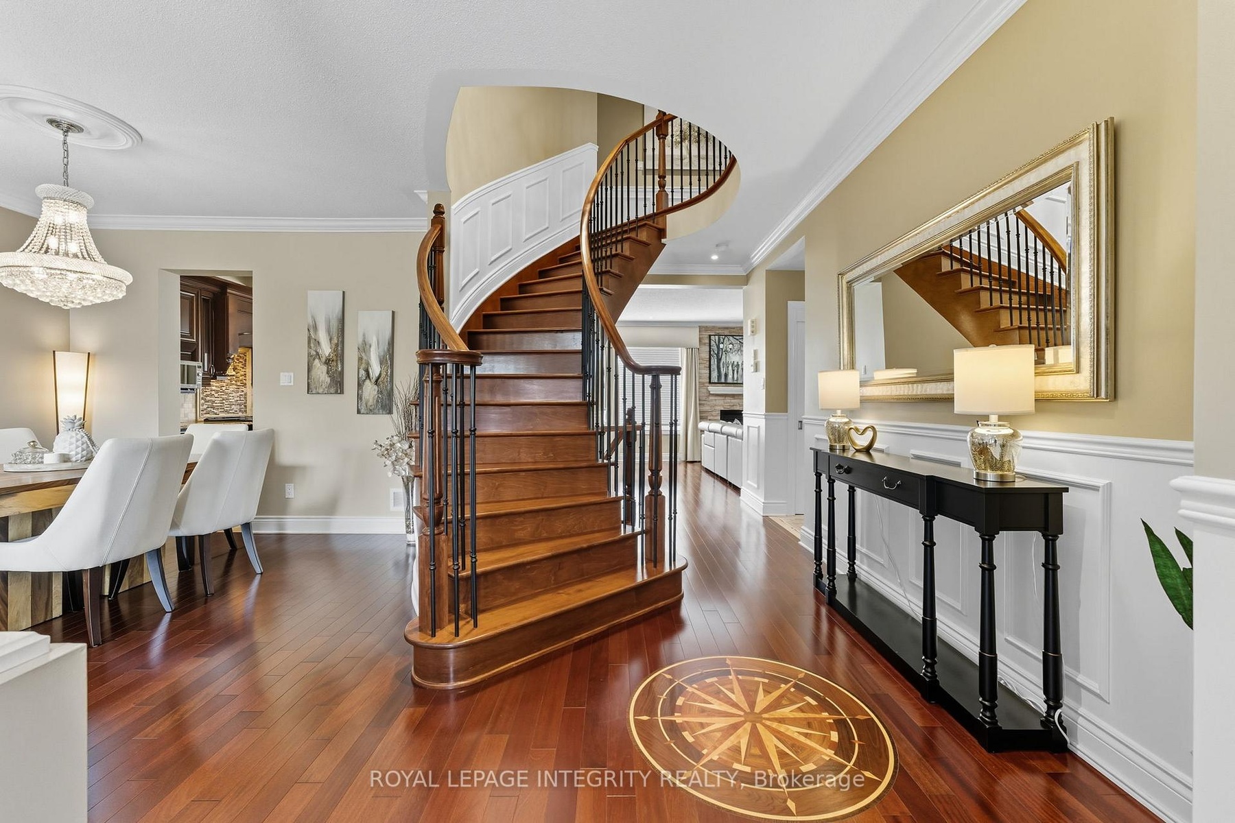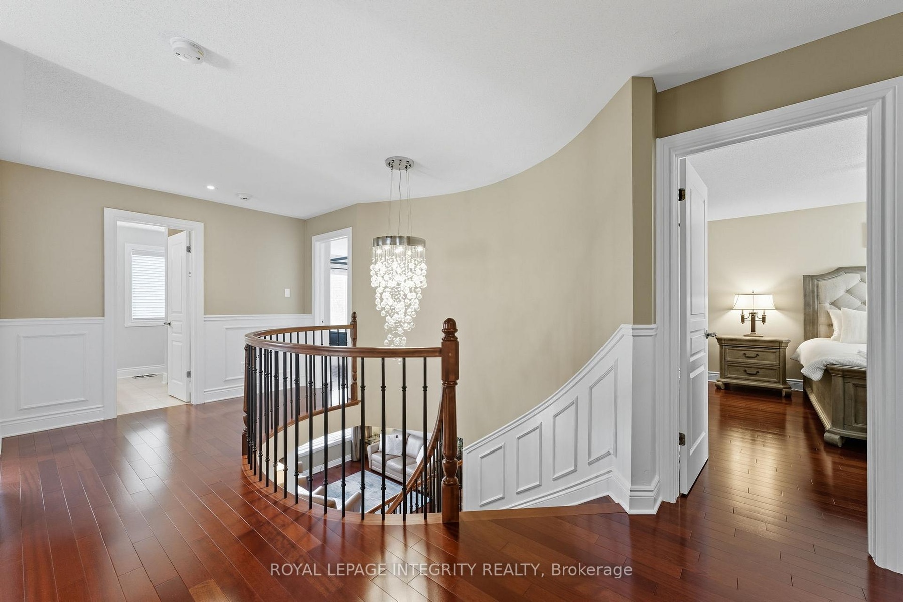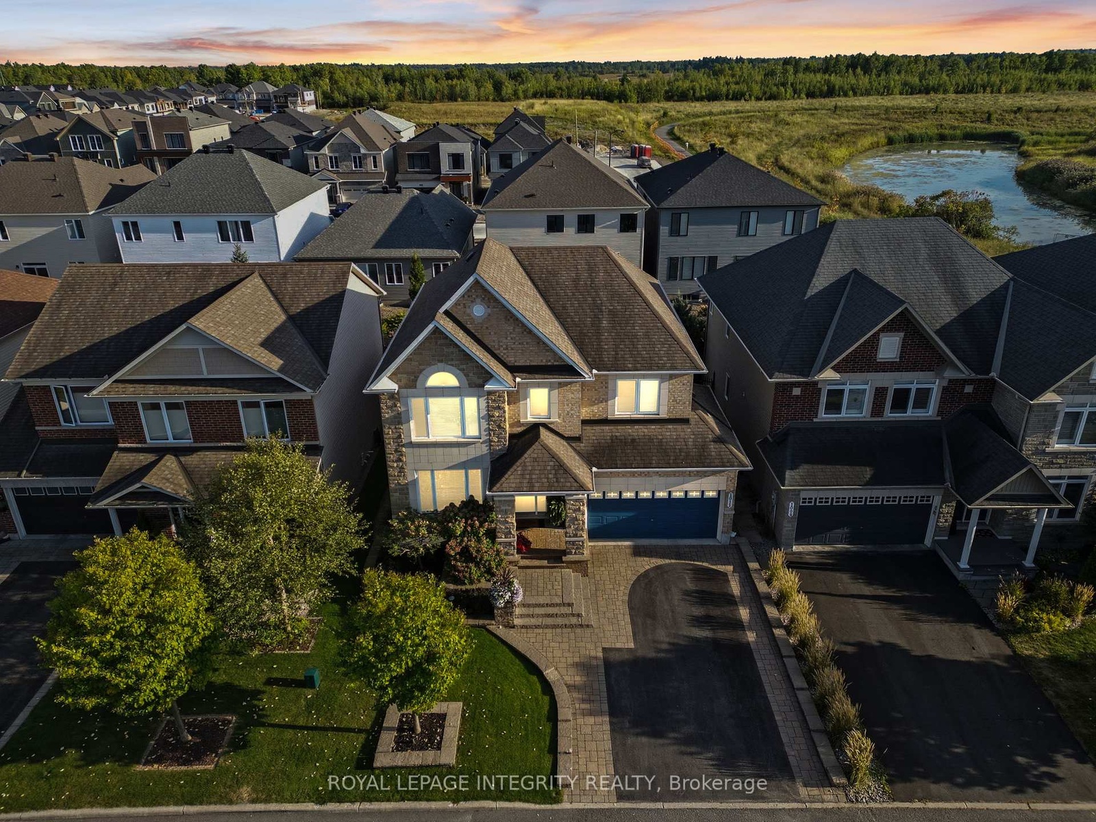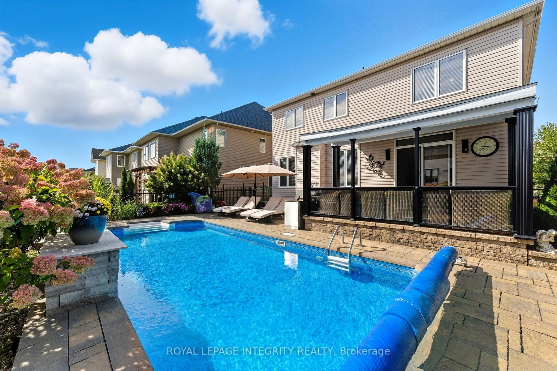 Exceptional 4-bedroom, 4-bath home with over $250k in upgrades offers over 2,900 sq ft of thoughtfully designed living space, combining elegance, comfort, and sophisticated craftsmanship at every turn. Beautiful front landscaping sets the stage from the moment you arrive, leading to an interior with a spiral staircase crowned by a crystal chandelier. 9 ft ceilings, rich Brazilian cherry hardwood floors, granite surfaces, custom millwork including wainscoting and crown moulding, and a built-in sound system create an atmosphere of elevated living, complemented by abundant potlights throughout. The family room, anchored by a gas fireplace with cultured stone surround, flows seamlessly into the kitchen, featuring a coffered ceiling, large granite island, and solid wood cabinetry - a perfect space for entertaining or daily family life. The primary bedroom is a private retreat, offering a walk-in closet and a spa-inspired 5-piece ensuite with a glass shower, soaker tub, and double sinks. Three additional bedrooms are spacious and bright, while the upper-level laundry with cabinetry adds convenience. The fully finished lower level with 9-foot ceilings unveils a grand entertaining haven, showcasing a custom granite and cultured stone bar, private gym, full bathroom with a large glass shower, workshop area, and extensive storage. Step outside to a sun-filled, resort-style backyard. A heated saltwater pool sits at the heart of the space, framed by custom interlocking stonework, with an expansive pavilion-style covered patio providing the perfect setting for summer gatherings. Southern exposure and lush landscaping envelop the property in warmth and serenity, creating a luxurious private oasis. Additional features include an irrigation system and celebright soffit lighting, showcasing the care and attention to detail evident throughout this remarkable property. Located steps from scenic walking trails surrounding a large pond. 24hr irrevocable on all offers.
