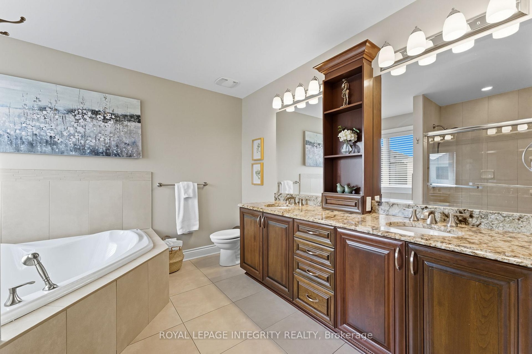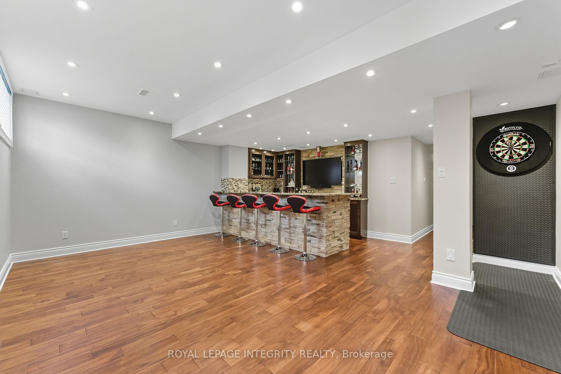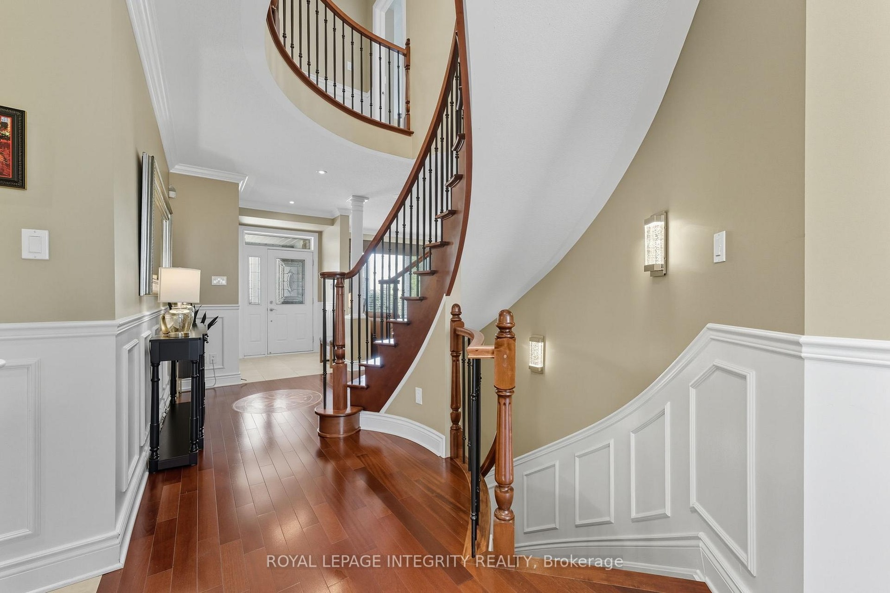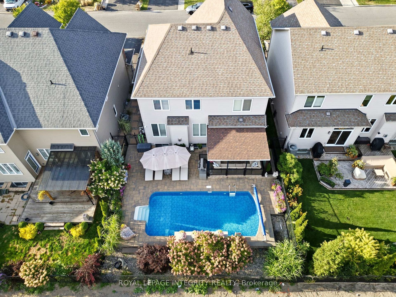 Exceptional 4-bedroom, 4-bath home with over $250k in upgrades offers over 2,900 sq ft of thoughtfully designed living space, combining elegance, comfort, and sophisticated craftsmanship at every turn. Beautiful front landscaping sets the stage from the moment you arrive, leading to an interior with a spiral staircase crowned by a crystal chandelier. 9 ft ceilings, rich Brazilian cherry hardwood floors, granite surfaces, custom millwork including wainscoting and crown moulding, and a built-in sound system create an atmosphere of elevated living, complemented by abundant potlights throughout. The family room, anchored by a gas fireplace with cultured stone surround, flows seamlessly into the kitchen, featuring a coffered ceiling, large granite island, and solid wood cabinetry - a perfect space for entertaining or daily family life. The primary bedroom is a private retreat, offering a walk-in closet and a spa-inspired 5-piece ensuite with a glass shower, soaker tub, and double sinks. Three additional bedrooms are spacious and bright, while the upper-level laundry with cabinetry adds convenience. The fully finished lower level with 9-foot ceilings unveils a grand entertaining haven, showcasing a custom granite and cultured stone bar, private gym, full bathroom with a large glass shower, workshop area, and extensive storage. Step outside to a sun-filled, resort-style backyard. A heated saltwater pool sits at the heart of the space, framed by custom interlocking stonework, with an expansive pavilion-style covered patio providing the perfect setting for summer gatherings. Southern exposure and lush landscaping envelop the property in warmth and serenity, creating a luxurious private oasis. Additional features include an irrigation system and celebright soffit lighting, showcasing the care and attention to detail evident throughout this remarkable property. Located steps from scenic walking trails surrounding a large pond. 24hr irrevocable on all offers.