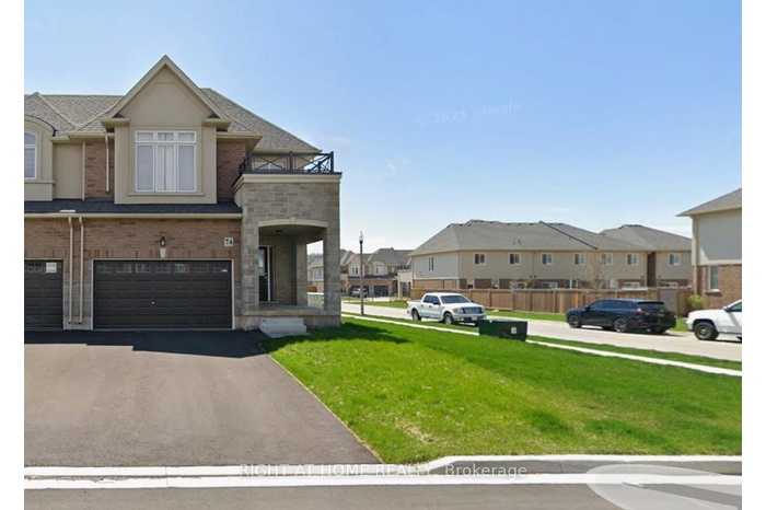 5 years new corner lot 2 story townhouse just like a semi. This lovely home features 3 bedrooms 2.5 washrooms and a total space of 1610 sq.ft. above grade.Located in the heart of Fruit land minutes from QEW, Costco plaza, parks and school. Enter into main level that boosts a 9' ceiling, open concept living/dining room with fireplace, modern kitchen with upgraded cabinets, a large island, equipped with new appliances with gas stove. Then follow the elegant oak stares to the upper level that has 3 spacious bedrooms including a master with 3 pieces ensuite and large walk-in closet and 2nd floor laundry. Oversize 1.5 garage with access to home and a double car driveway. **Currently tenanted, more photos and showing slots to be added letter.**