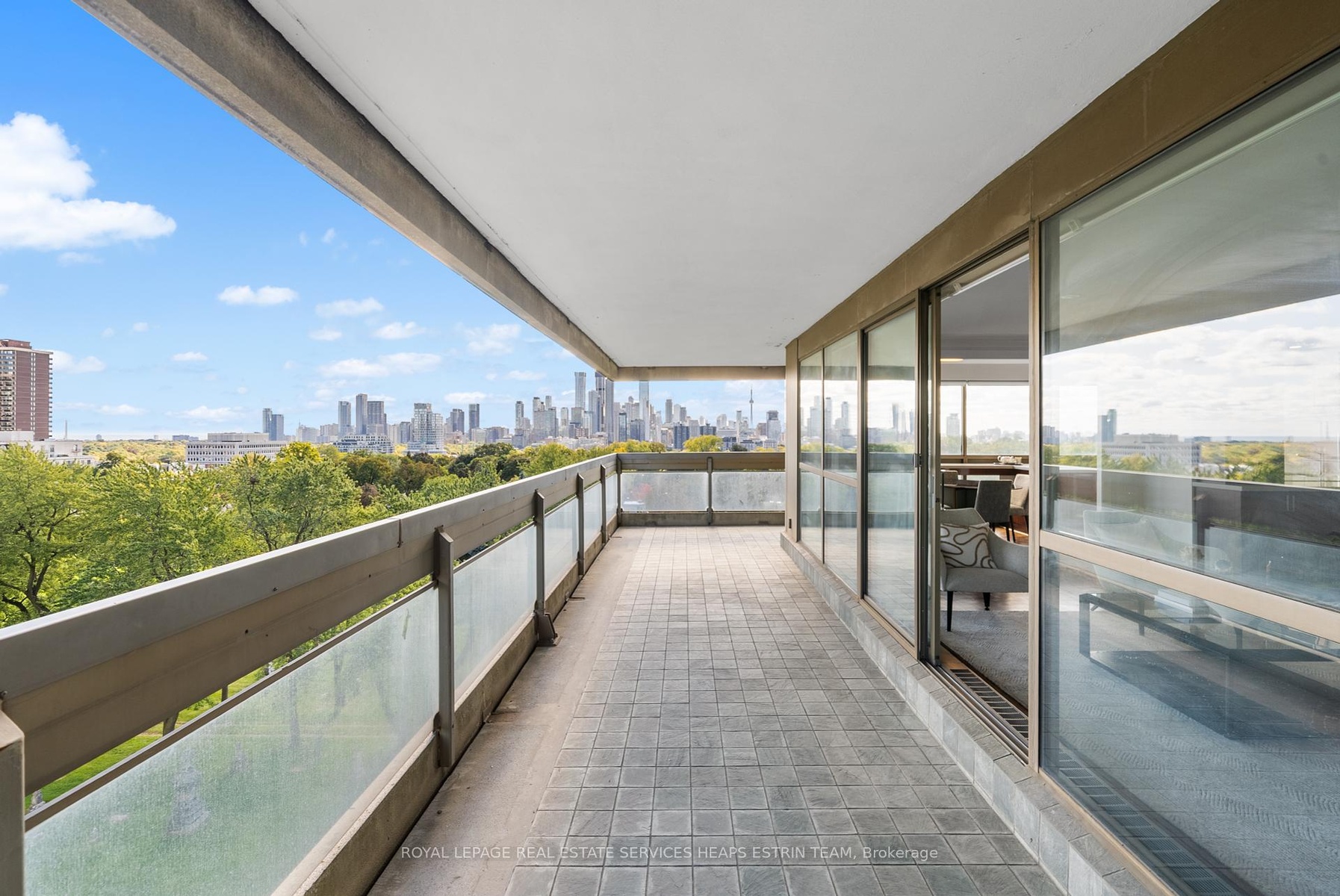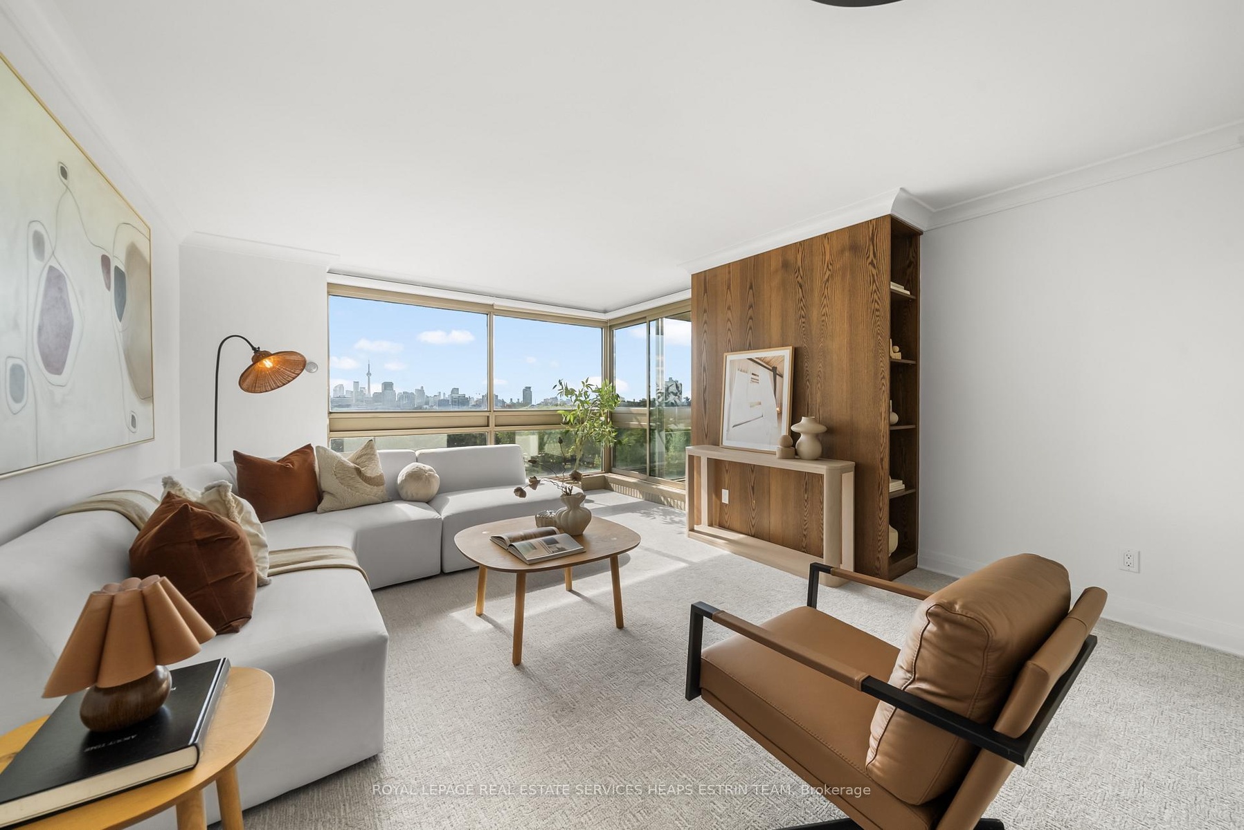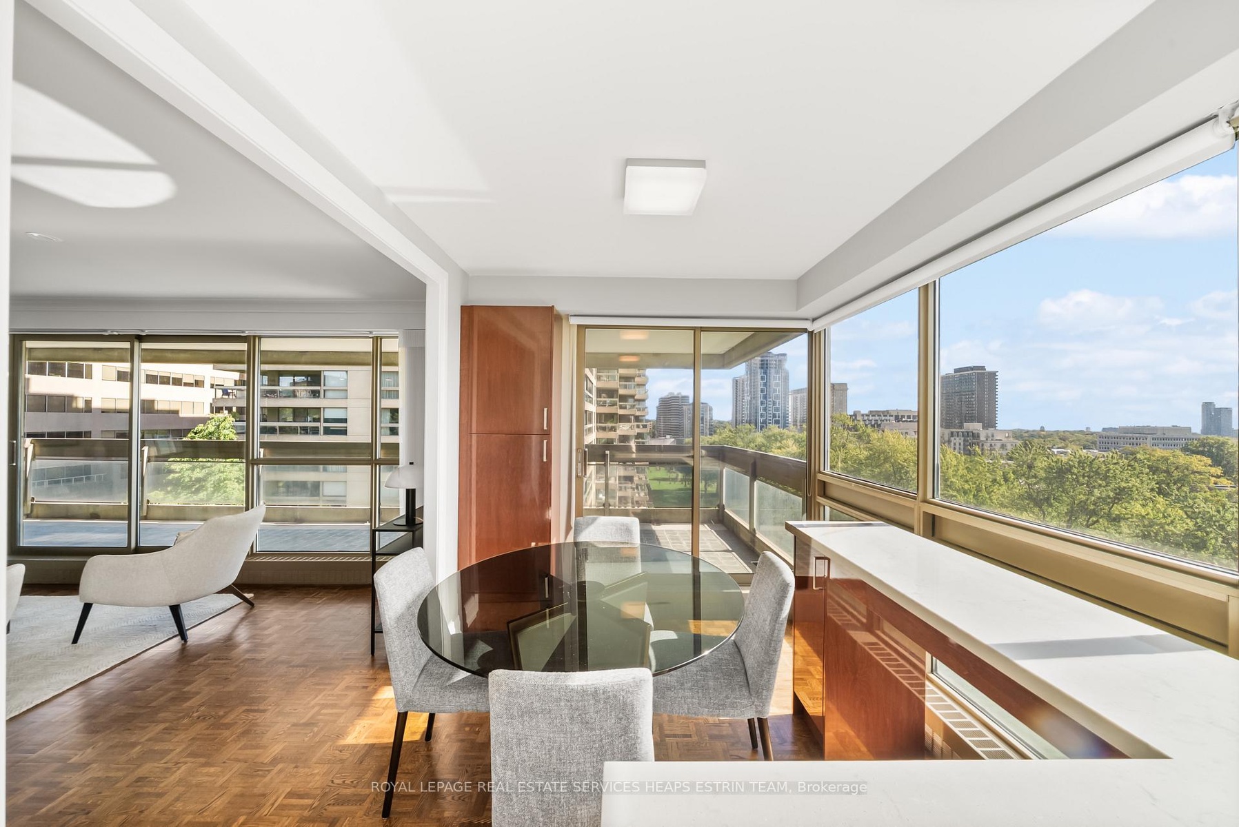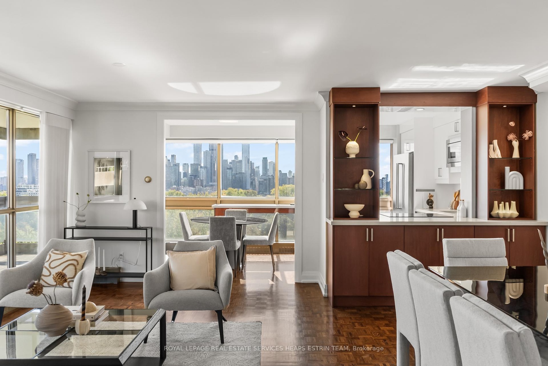 Welcome to Suite 907/908 at Granite Place, an expansive, light-filled southeast-facing corner suite offering stunning skyline and treetop views in one of midtown Torontos most prestigious buildings. With over 2,100 square feet of thoughtfully designed space, this beautifully upgraded three-bedroom residence blends elegance, comfort, and convenience in a location that defines walkable city living.From the moment you enter, hardwood floors and crown moulding guide you through a generous floor plan that effortlessly balances formal and informal living. The open-concept living and dining area offers a seamless flow for entertaining, with walk-out access to a private 200 sq.ft terrace showcasing breathtaking south-facing views of the city. The separate oversized family room, drenched in natural light, provides a versatile retreat for relaxing, reading, or hosting guests. An updated four piece bathroom adds convenience to the main living space.The renovated kitchen features clean contemporary lines, stainless steel appliances, and ample storage, perfect for daily function or hosting with ease. The homes three bedrooms are each generously scaled, including two potential primary retreats, both offering ensuite bathrooms and excellent closet space for modern comfort. The third bedroom adds versatility for a home office with built-ins, a den or guest bedroom.Residents of Granite Place enjoy a host of premium, resort-style amenities, including an indoor saltwater pool and whirlpool, well-equipped exercise room, yoga studio, saunas, and a multi-purpose room with a catering kitchen and walk-out patio. A beautifully landscaped garden creates a quiet, green setback from St. Clair, while attentive 24-hour concierge service and welcoming building staff elevate everyday comfort and security. The suite also includes two parking spaces and two oversized lockers.
