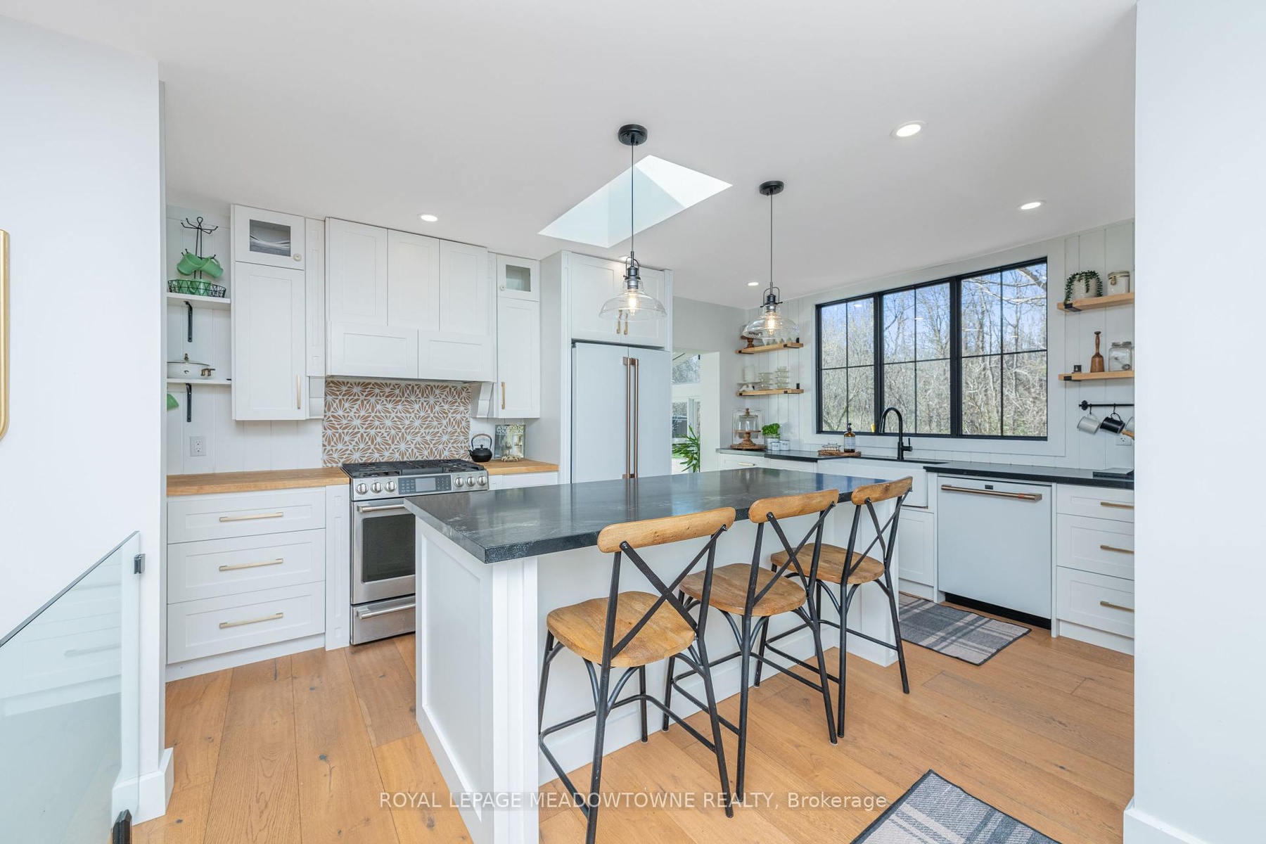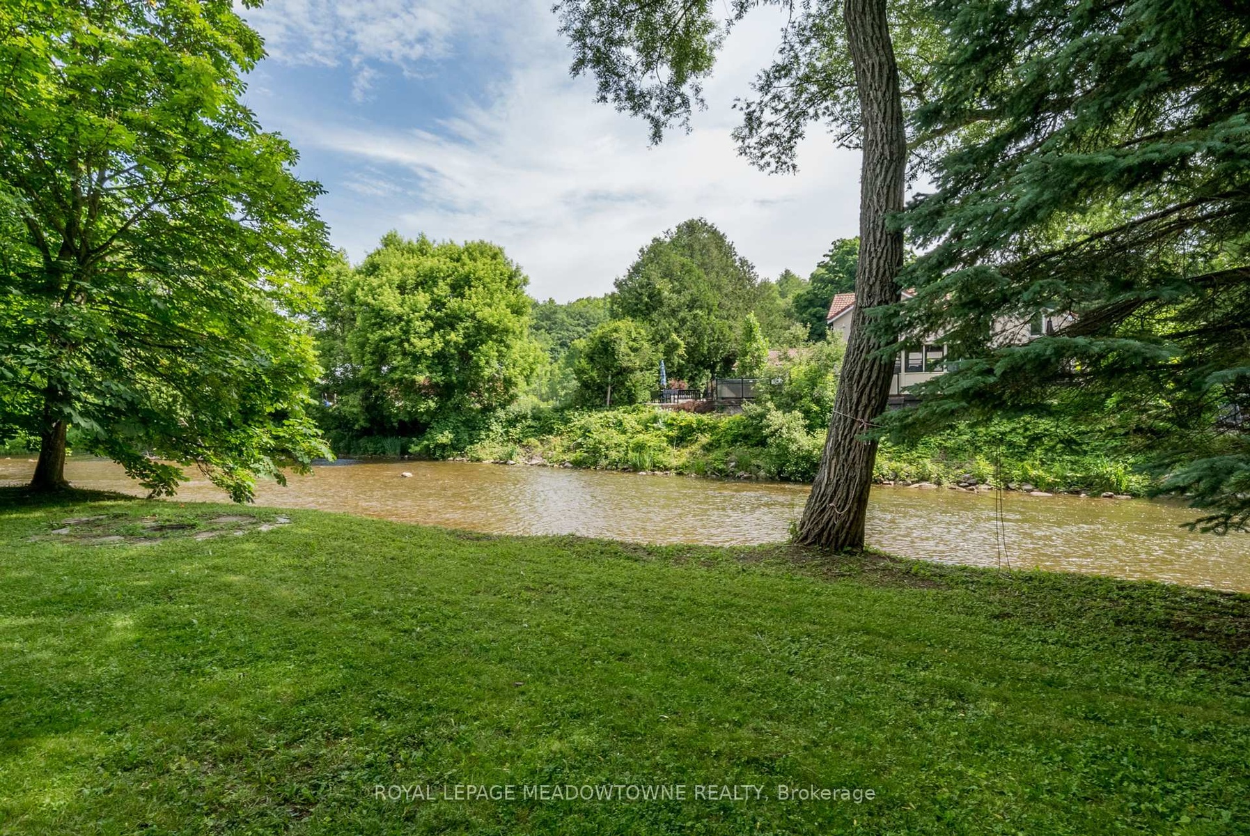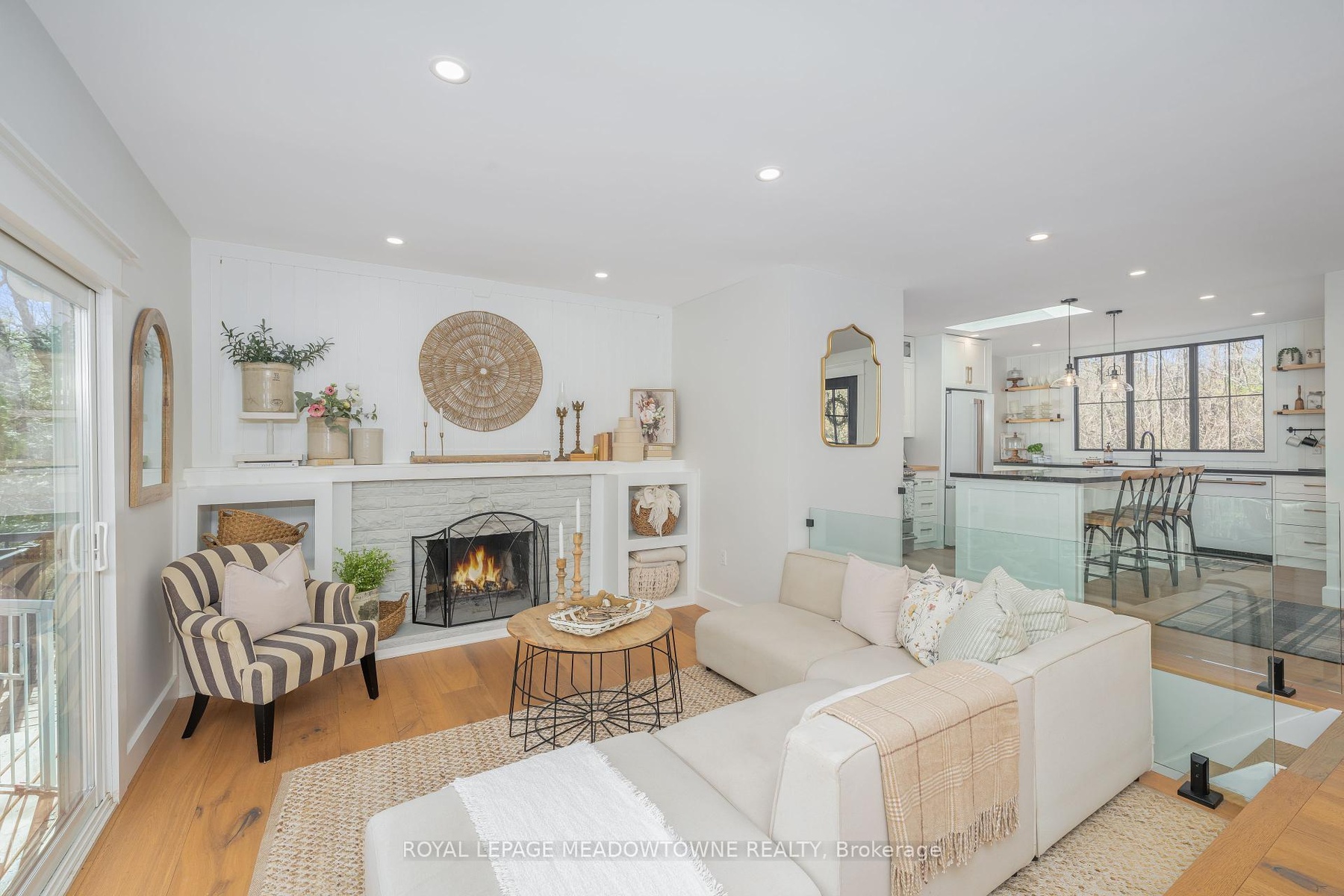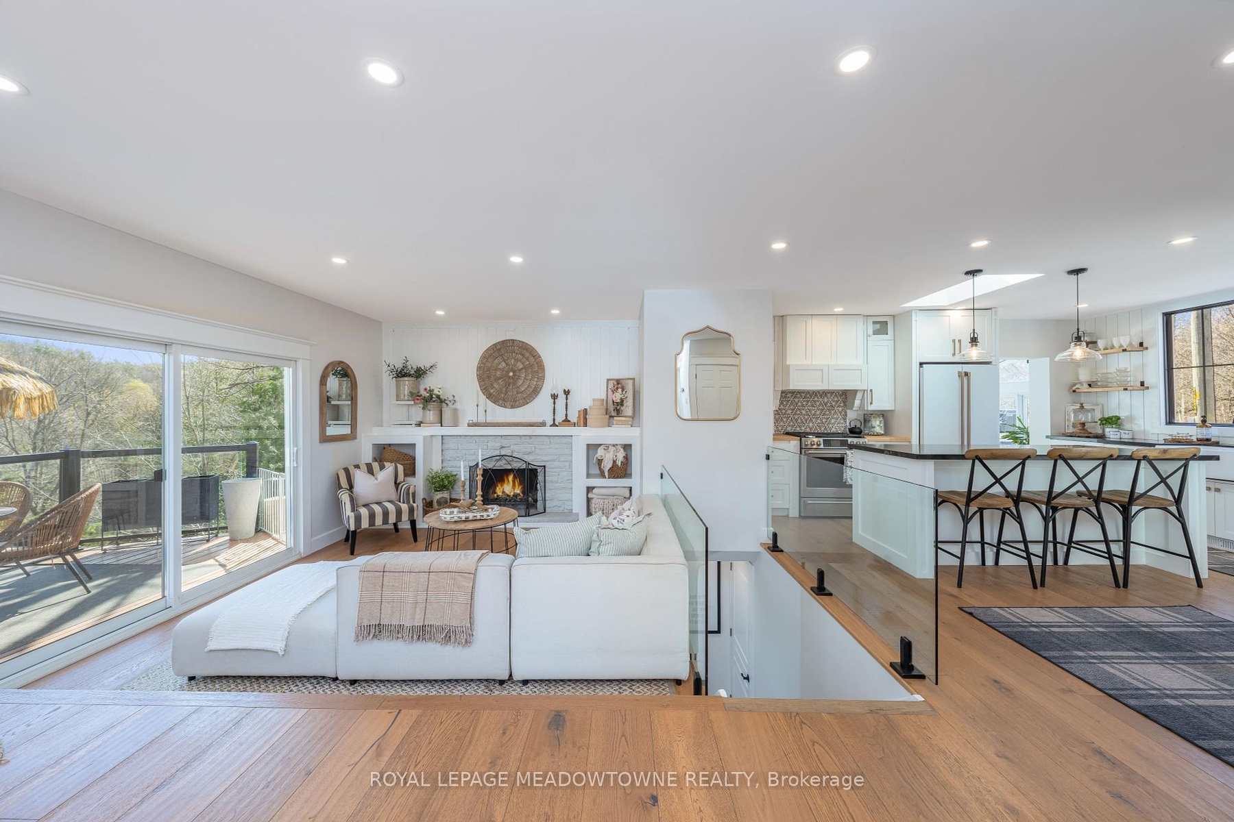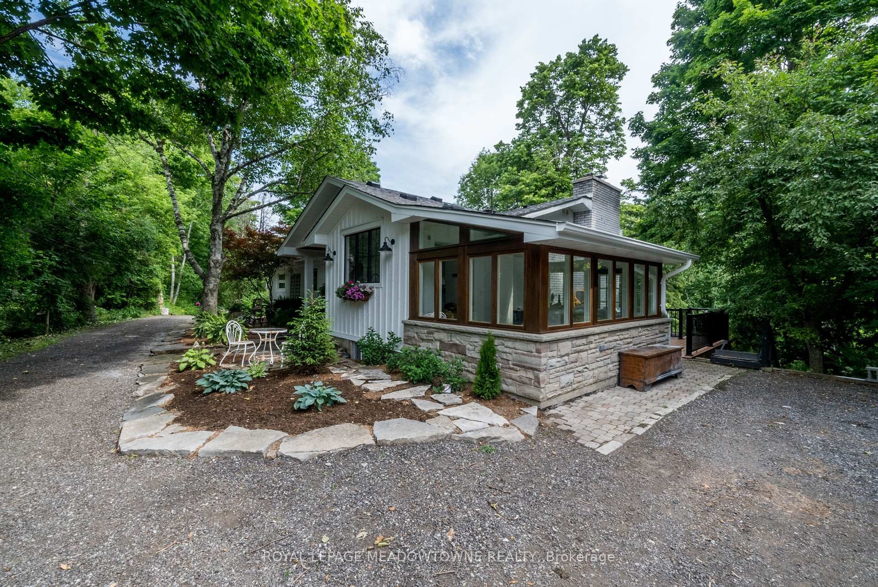 Welcome to this beautifully reimagined 4-bedroom home, privately nestled along a quiet gravel lane in the scenic village of Glen Williams. Set on nearly an acre with uninterrupted, year-round views of the Credit River, this property offers a rare fusion of peaceful nature and modern elegance. Step into the inviting sunroom -- bathed in natural light, its the perfect space to welcome guests, set up a creative home office, or simply relax with a good book. Inside, the main floor features stunning white oak floors and a breezy, open-concept layout that effortlessly connects the kitchen, dining, and living areas -- ideal for both everyday life and memorable entertaining. At the heart of the home, the chef-inspired kitchen combines functionality with elevated design. It boasts top-of-the-line Café appliances, ample cabinetry, and a striking picture window above the sink, framing views of the surrounding landscape. Upstairs, the serene primary suite offers a generous retreat, complete with a contemporary ensuite and space to unwind. Glass railings lead to the fully finished walkout basement, where abundant natural light and luxury vinyl plank flooring create a warm, open ambiance. This level includes a spacious family room, an additional bedroom and full bathroom, plus a versatile workshop area that could easily serve as a guest suite or creative studio. Outside, expansive decks provide a front-row seat to the river's beauty -- perfect for morning coffee, weekend lounging, or evenings under the stars. Offering the best of both worlds, this secluded escape is just seven minutes from the Georgetown GO Station, putting city access within easy reach while enjoying the charm and tranquility of Glen Williams.
