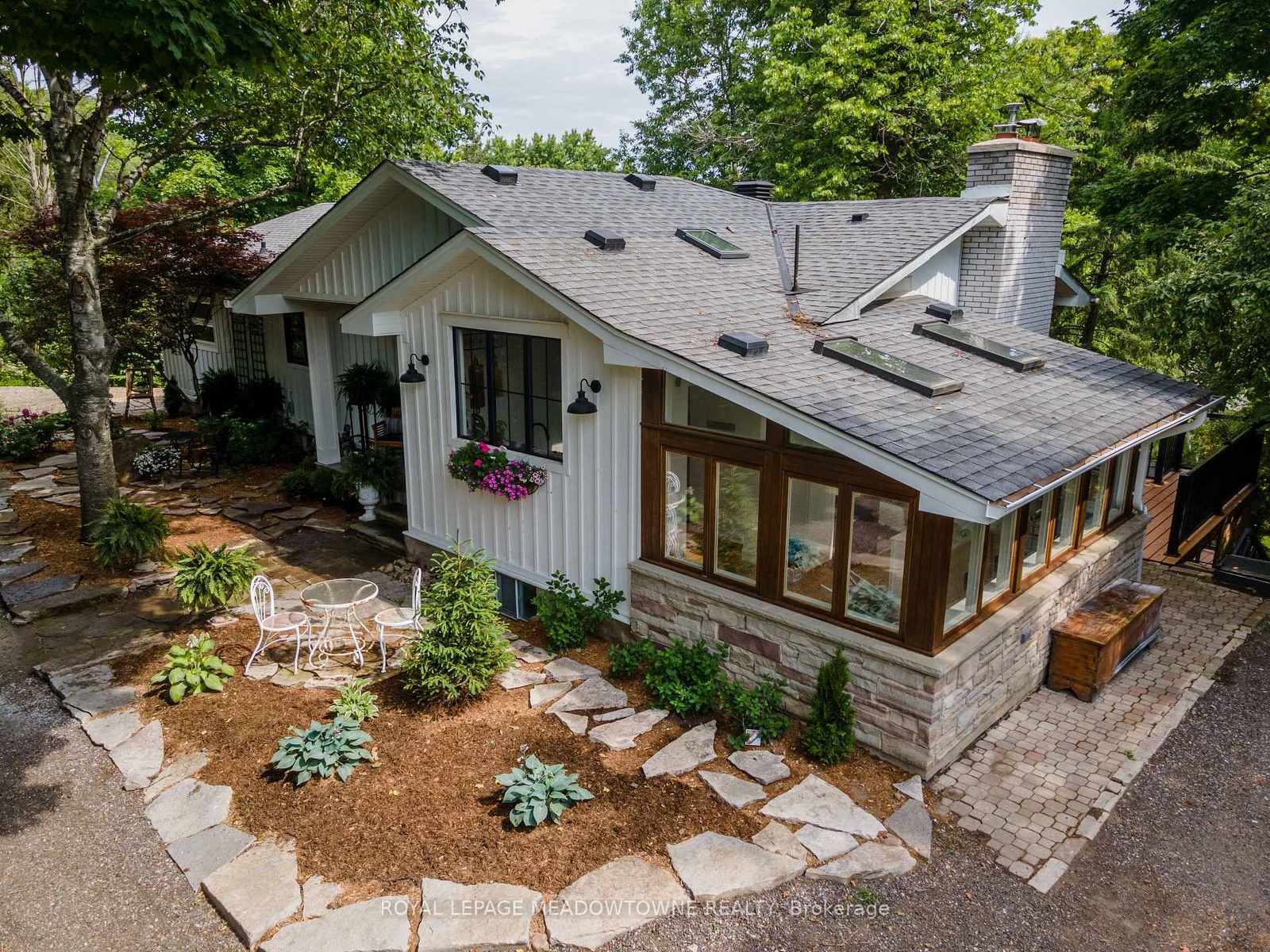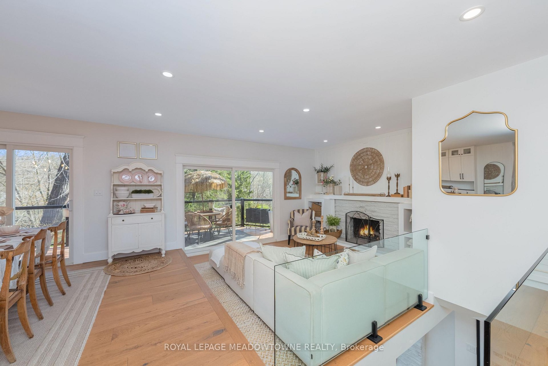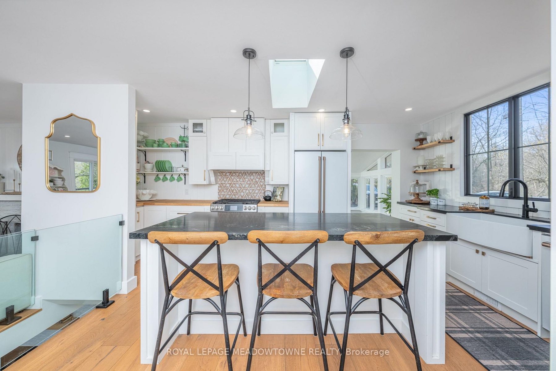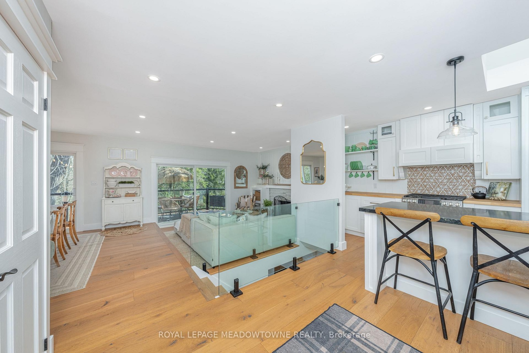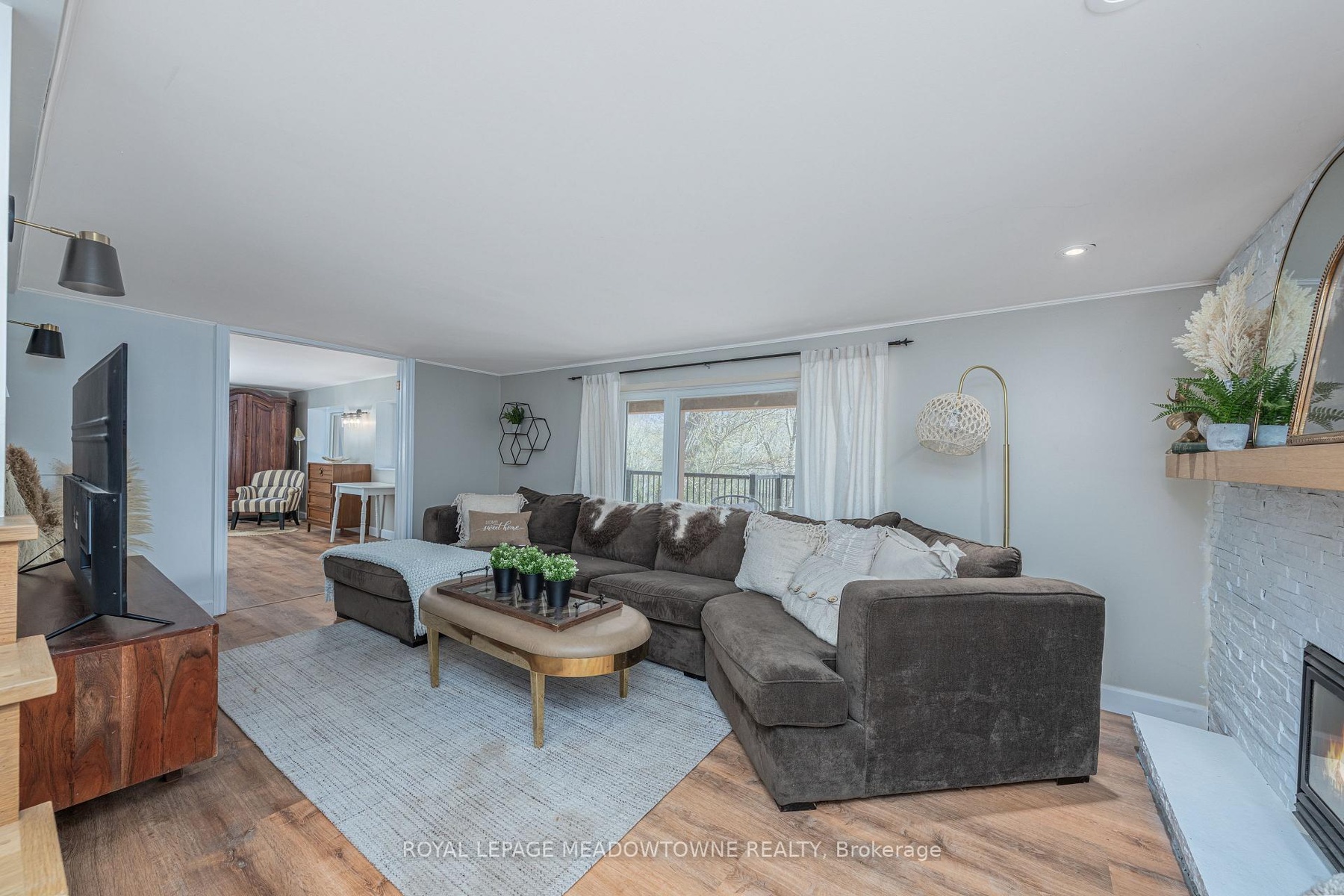 Welcome to this beautifully reimagined 4-bedroom home, privately nestled along a quiet gravel lane in the scenic village of Glen Williams. Set on nearly an acre with uninterrupted, year-round views of the Credit River, this property offers a rare fusion of peaceful nature and modern elegance. Step into the inviting sunroom -- bathed in natural light, its the perfect space to welcome guests, set up a creative home office, or simply relax with a good book. Inside, the main floor features stunning white oak floors and a breezy, open-concept layout that effortlessly connects the kitchen, dining, and living areas -- ideal for both everyday life and memorable entertaining. At the heart of the home, the chef-inspired kitchen combines functionality with elevated design. It boasts top-of-the-line Café appliances, ample cabinetry, and a striking picture window above the sink, framing views of the surrounding landscape. Upstairs, the serene primary suite offers a generous retreat, complete with a contemporary ensuite and space to unwind. Glass railings lead to the fully finished walkout basement, where abundant natural light and luxury vinyl plank flooring create a warm, open ambiance. This level includes a spacious family room, an additional bedroom and full bathroom, plus a versatile workshop area that could easily serve as a guest suite or creative studio. Outside, expansive decks provide a front-row seat to the river's beauty -- perfect for morning coffee, weekend lounging, or evenings under the stars. Offering the best of both worlds, this secluded escape is just seven minutes from the Georgetown GO Station, putting city access within easy reach while enjoying the charm and tranquility of Glen Williams.