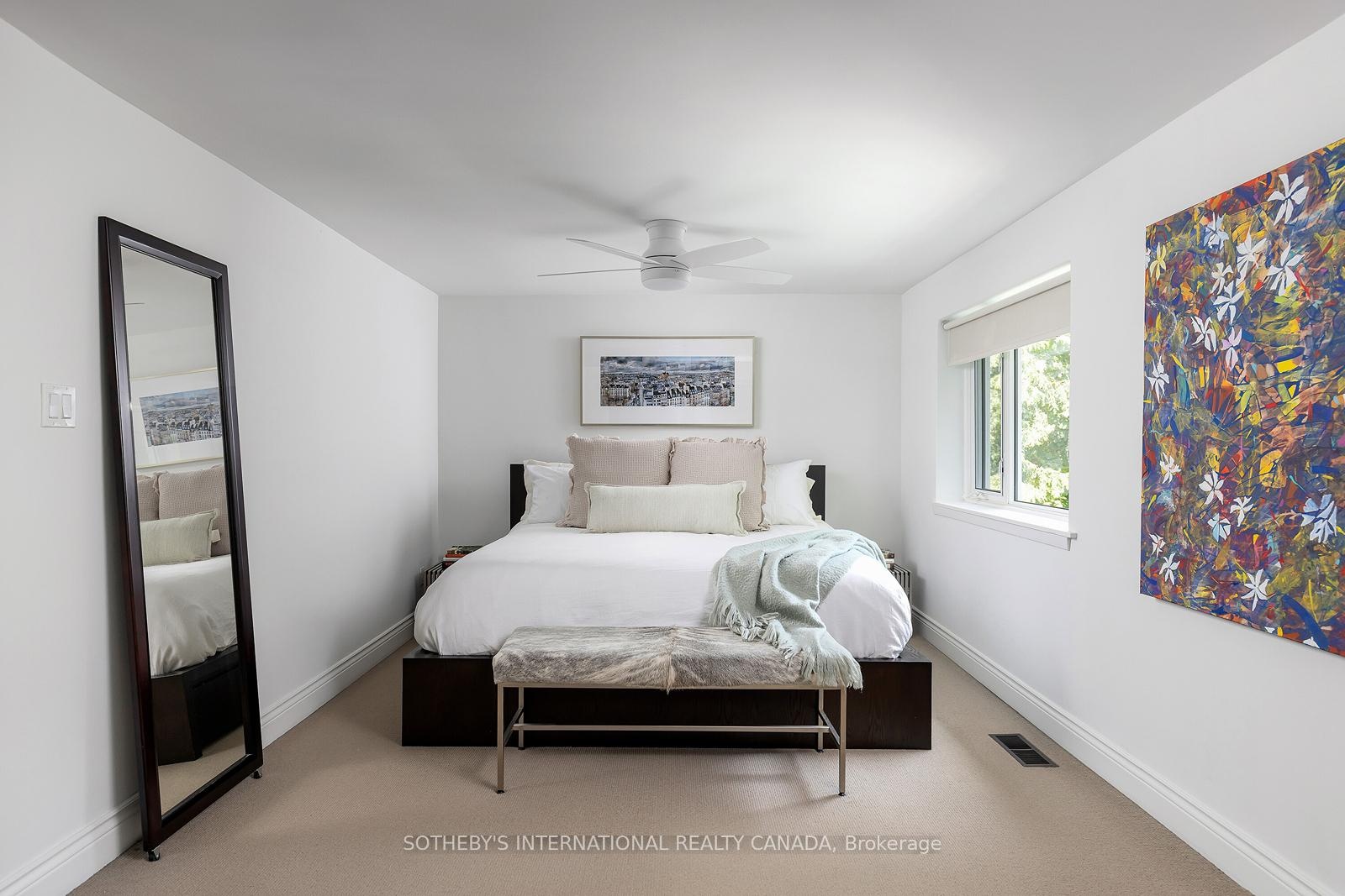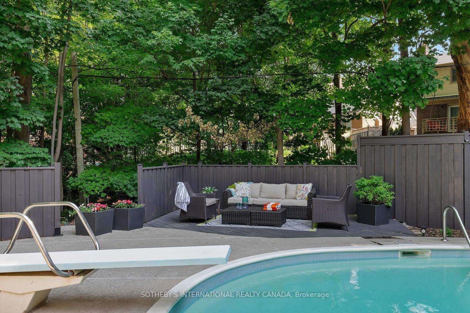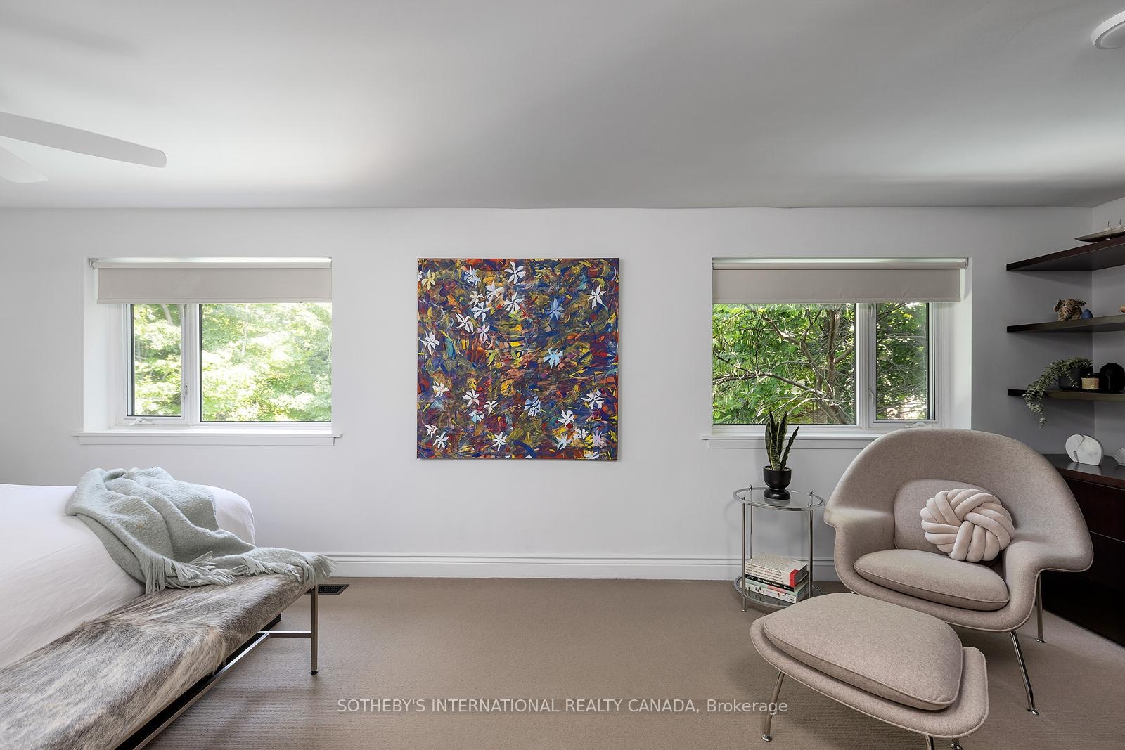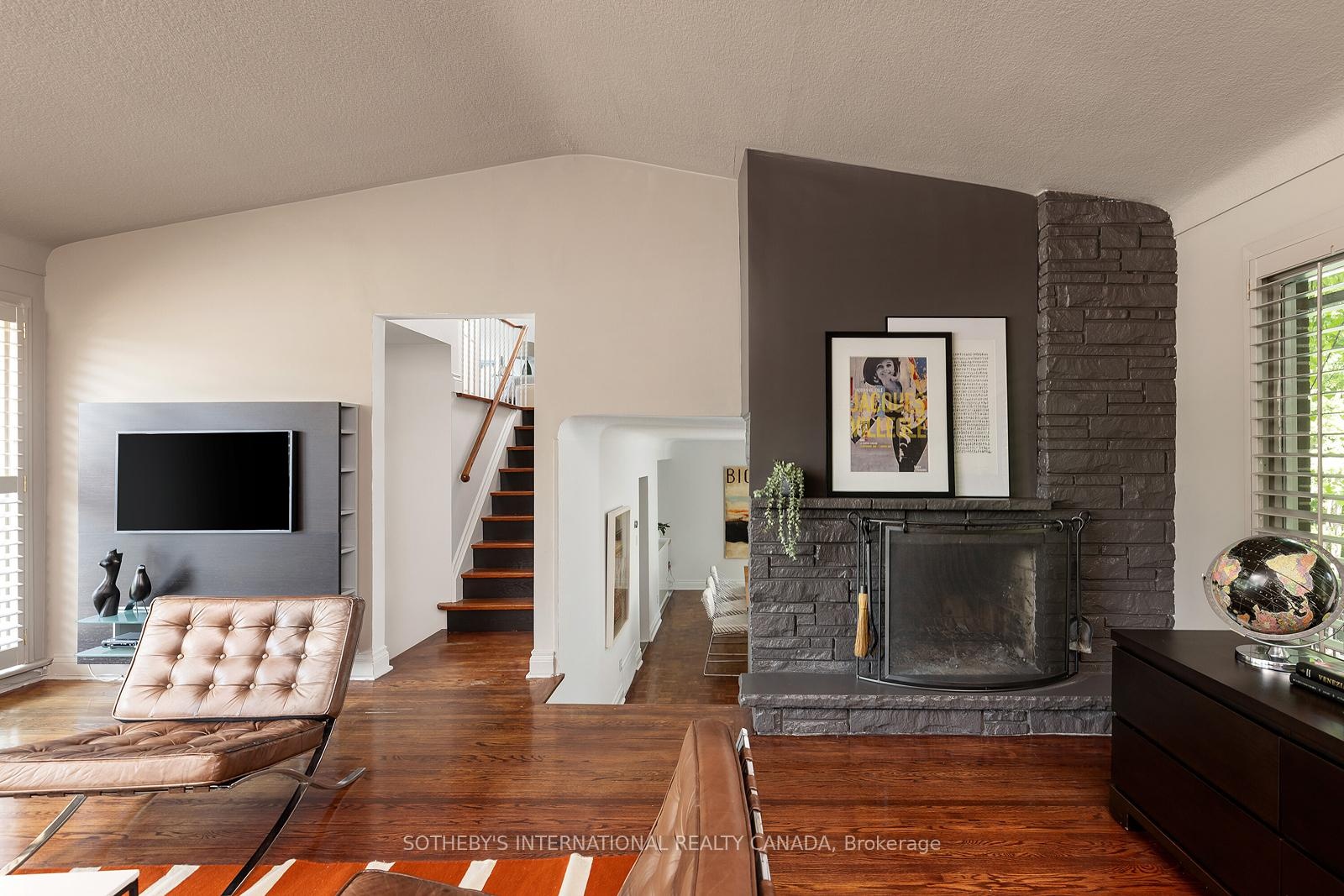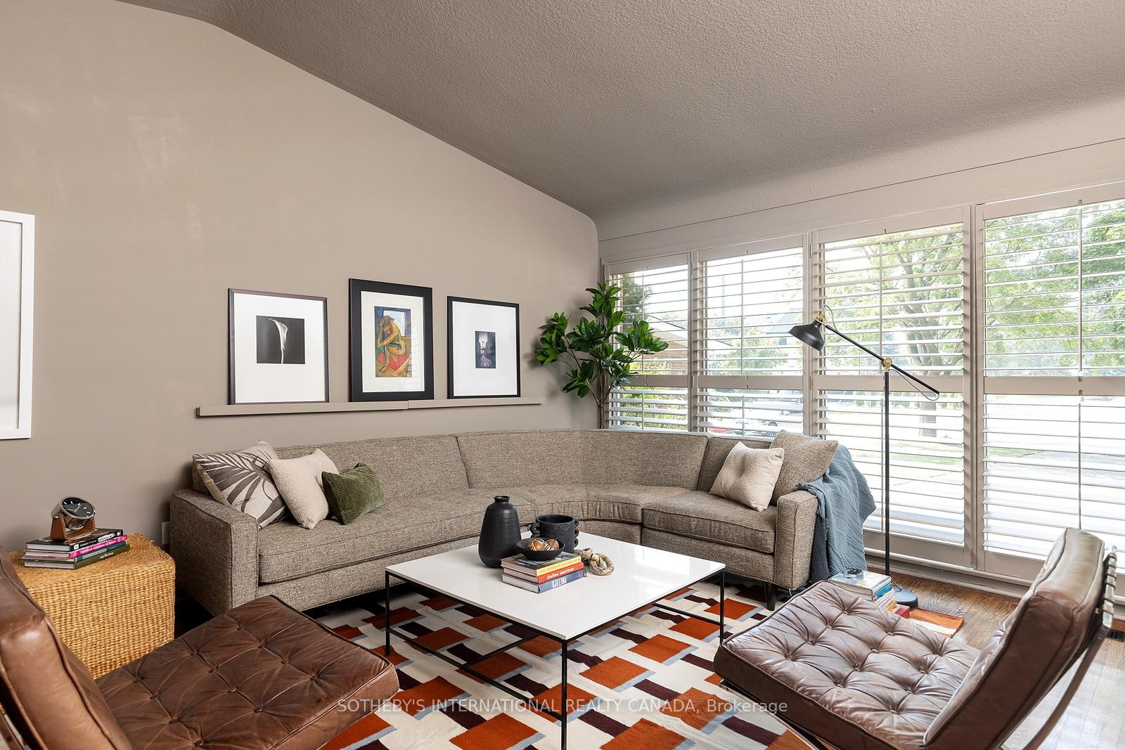 Step inside this sophisticated mid-century modern residence and discover a rare blend of architectural elegance and natural beauty in the heart of the prestigious Parkwoods neighbourhood. Set on an oversized, ravine-like, pie-shaped lot, this stylish side split spans nearly 2,000 SQ FT, thoughtfully updated while retaining much of its timeless character. Floor-to-ceiling windows bathe the interiors in natural light, complementing grand living spaces with vaulted ceilings, striking brick and stone-surround fireplaces, a modernized kitchen featuring top-of-the-line appliances with a waterfall centre island ideal for entertaining. The kitchen, formal living, and dining rooms flow seamlessly onto wraparound terraces, creating an effortless connection between indoor comfort and outdoor leisure. The upper level features 2 spacious bedrooms and a beautifully updated 4-piece bathroom with quartz counters, Italian tile, and custom cabinetry. The oversized primary retreat features a generous seating area, custom-built-ins, and picture windows that frame views of the lush, private backyard. The ground floor offers exceptional versatility, with a gas fireplace, a wall of built-ins, an office nook, and a walk-out to the scenic gardens perfect as a family room, private 3rd bedroom or in-law suite. A 4th bedroom, full bathroom, and laundry with ample storage complete the lower level. Outside, be swept away by the abundance of mature trees, stone steps, and cascading gardens that lead to a picturesque pool--your Muskoka-like escape in the city. A 2-car garage and private drive provide ample parking, adding to the homes unparalleled curb appeal. All this in a highly coveted neighbourhood, steps from reputable schools, including Victoria Park Collegiate's acclaimed IB program. Minutes to the Don Valley Parkway and Highway 401, residents enjoy quick access to downtown and the GTA. An exceptional option for those seeking more space, privacy, & sophistication just beyond the city core.