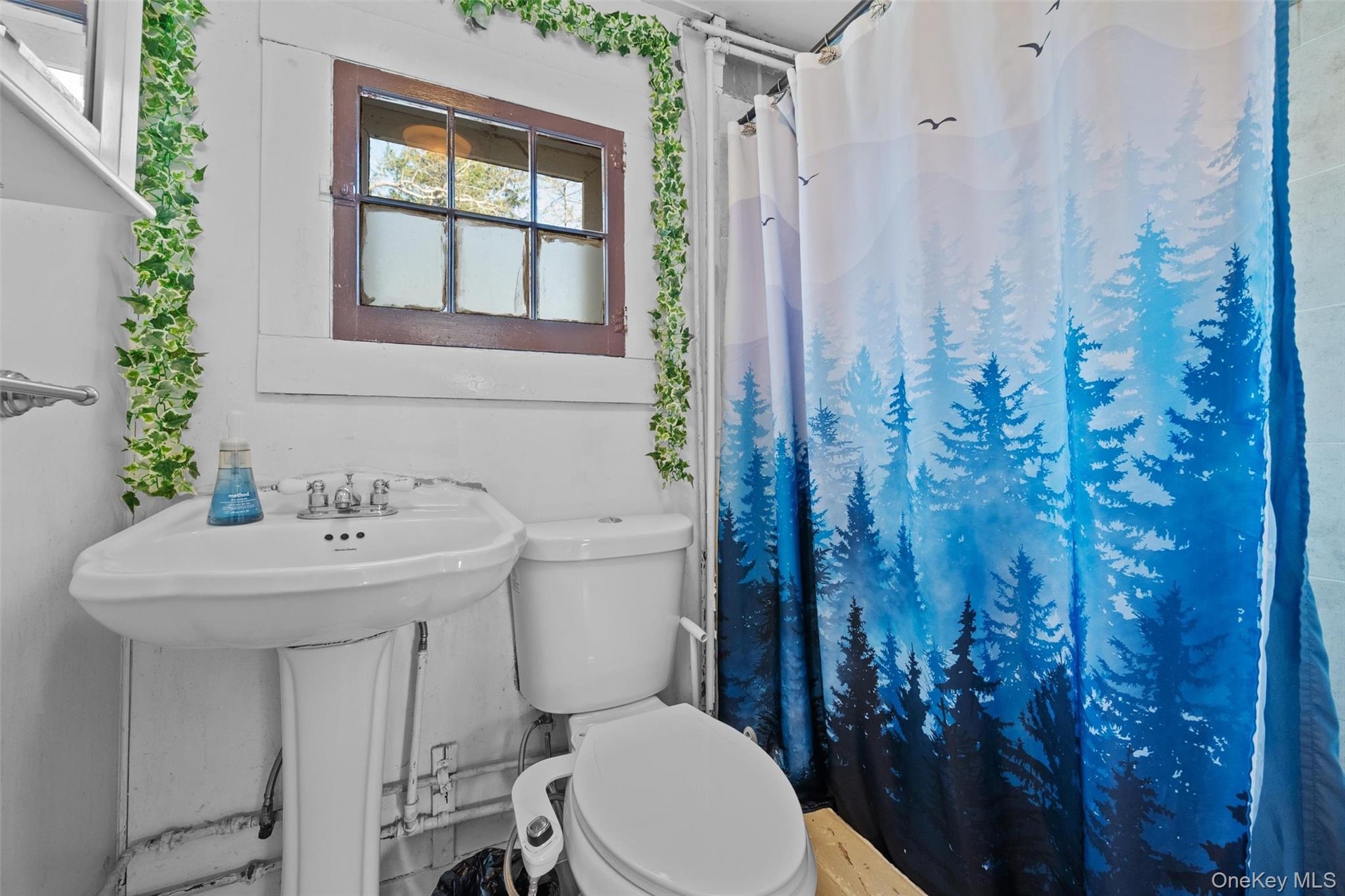 - Bathroom with toilet, a sink, and a shower