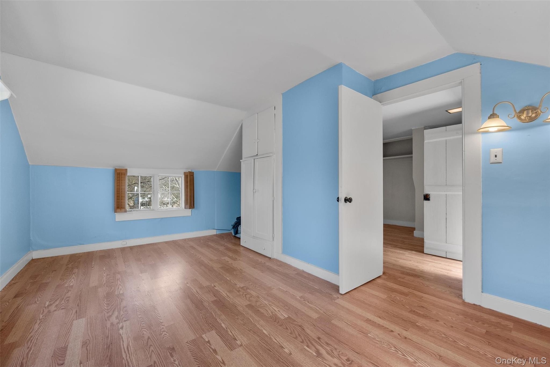 - Bedroom with baseboards, vaulted ceiling, and light wood-type flooring