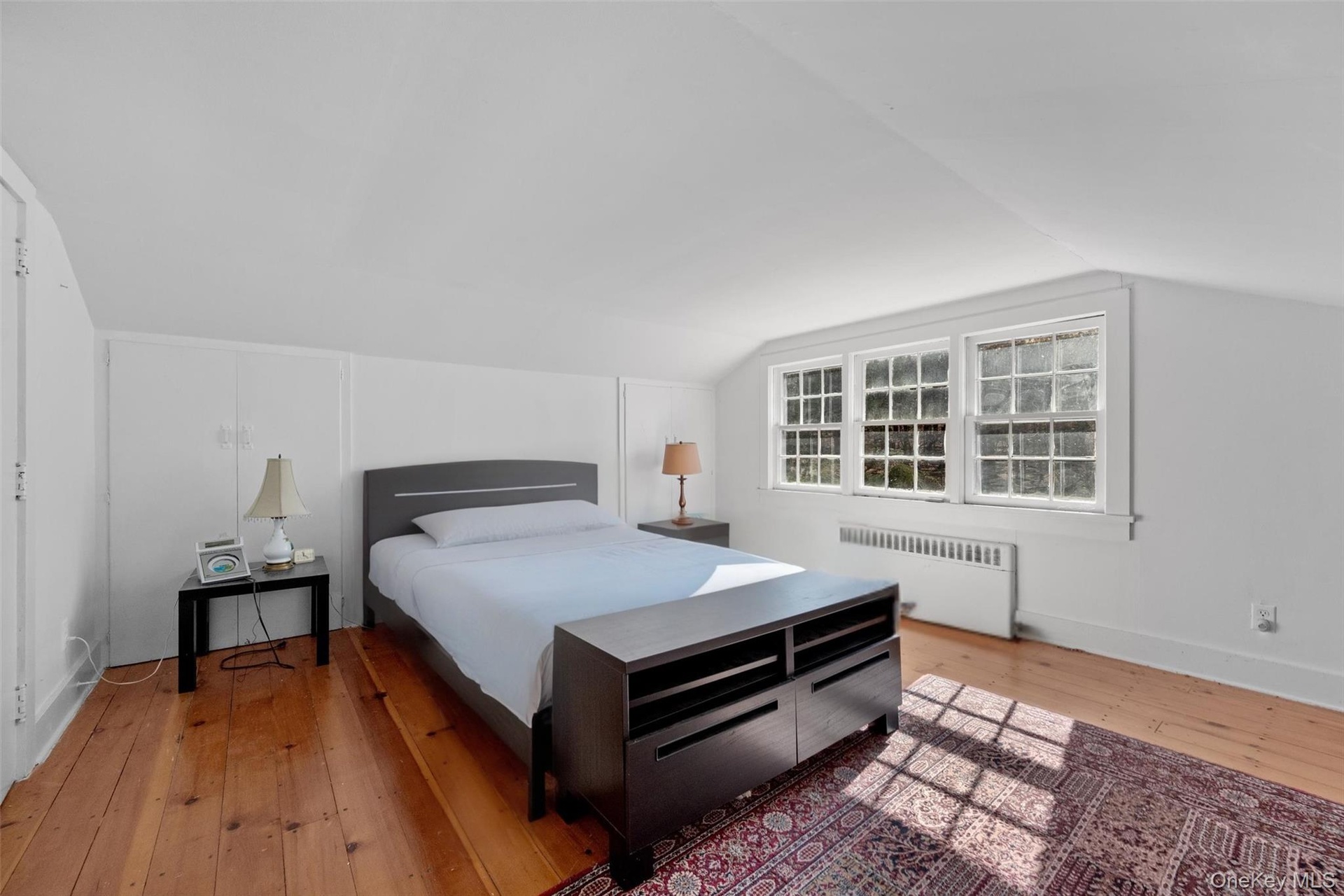 - Bedroom with radiator heating unit, hardwood / wood-style floors, baseboards, and vaulted ceiling *Photo has been virtually altered