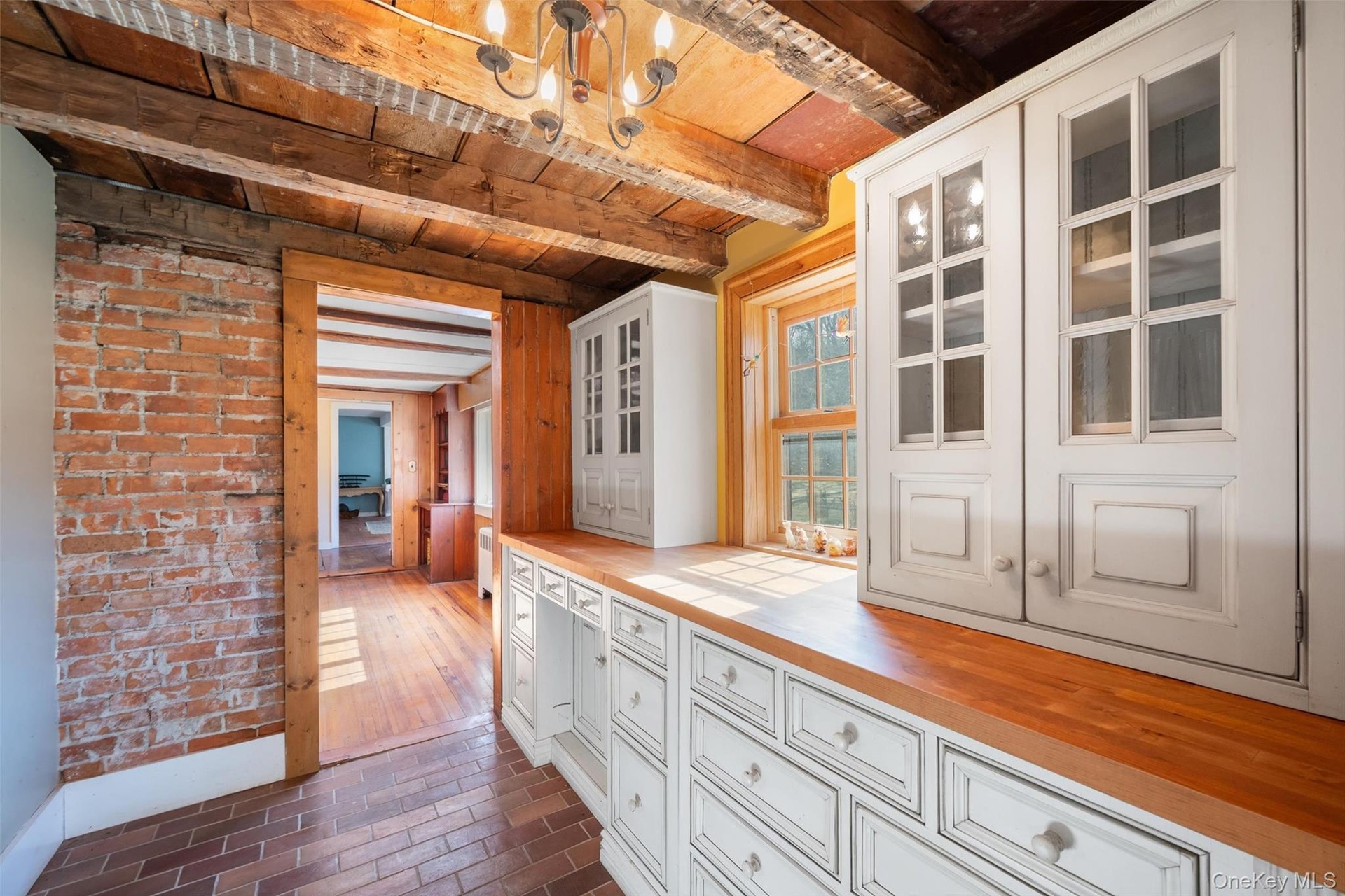 - Corridor with a chandelier, wood ceiling, beam ceiling, brick floor, and brick wall