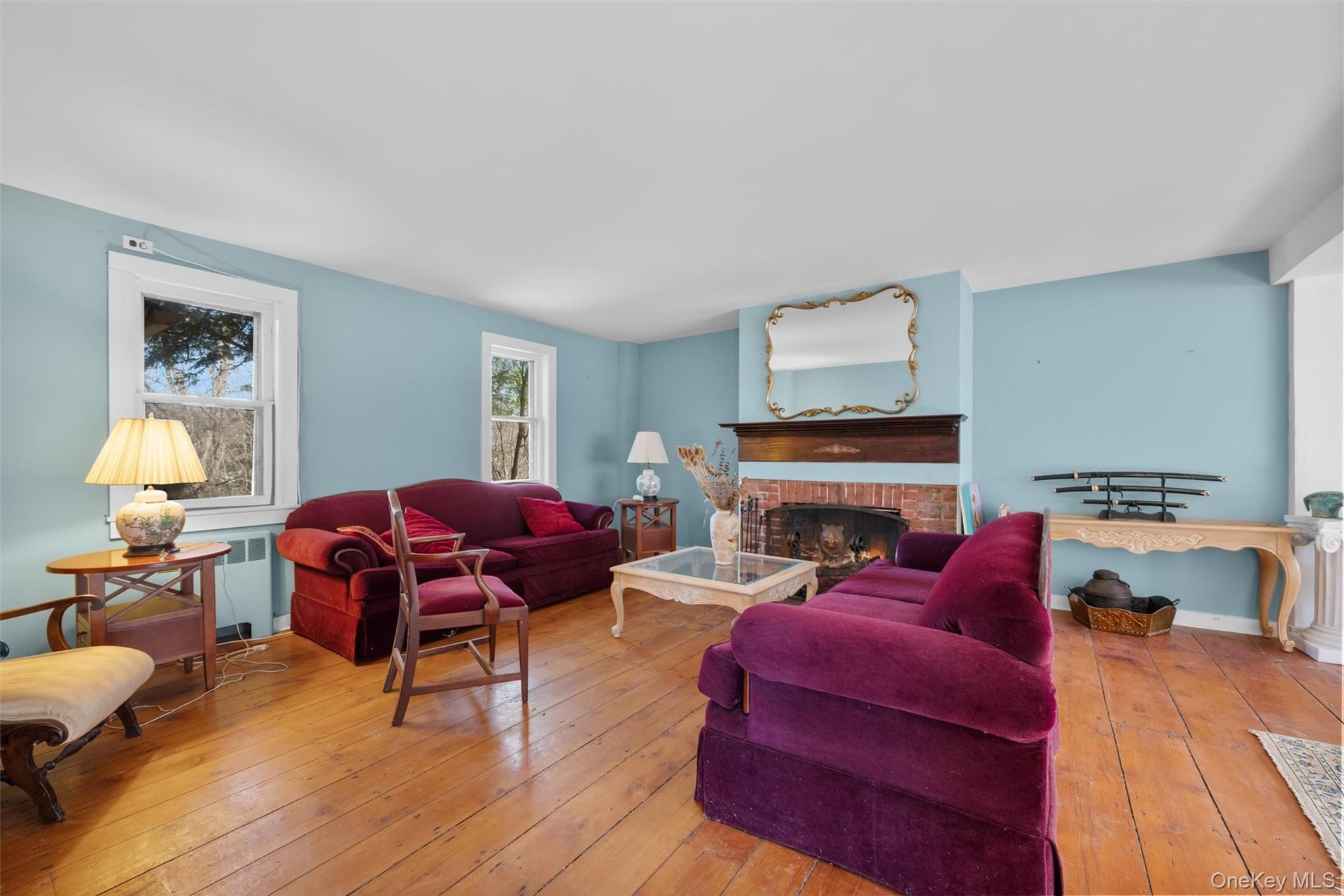 - Living room with hardwood flooring, radiator, and a fireplace