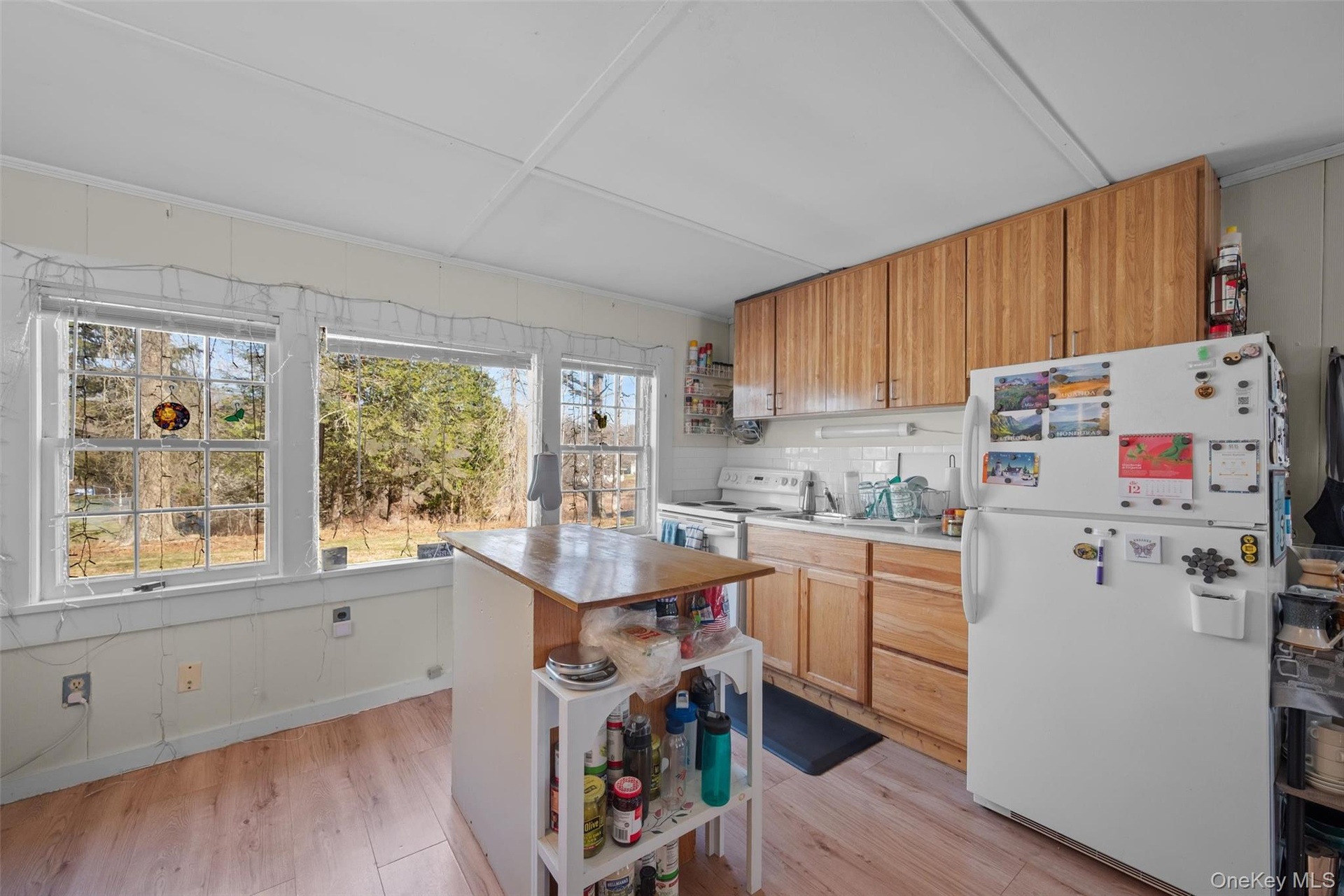 - Kitchen with open floor plan, white appliances, wooden counters, light wood finished floors, and visible vents