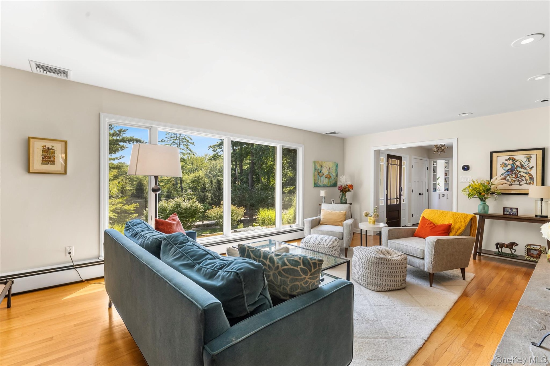 - Living room featuring light wood finished floors, a baseboard heating unit, and recessed lighting