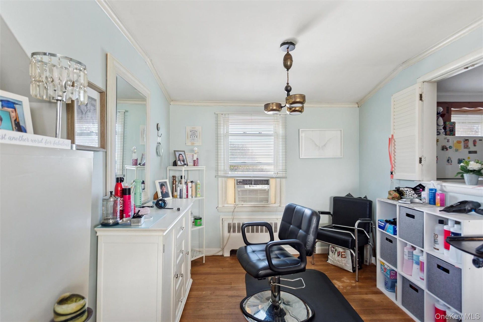 - Dining room with crown molding, radiator heating unit, light wood finished floors, and cooling unit