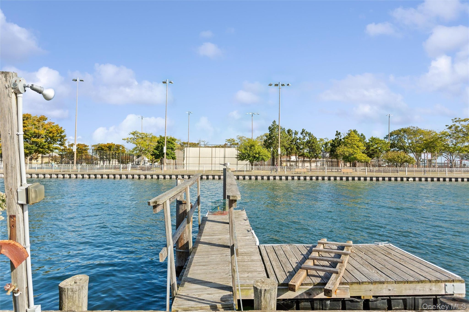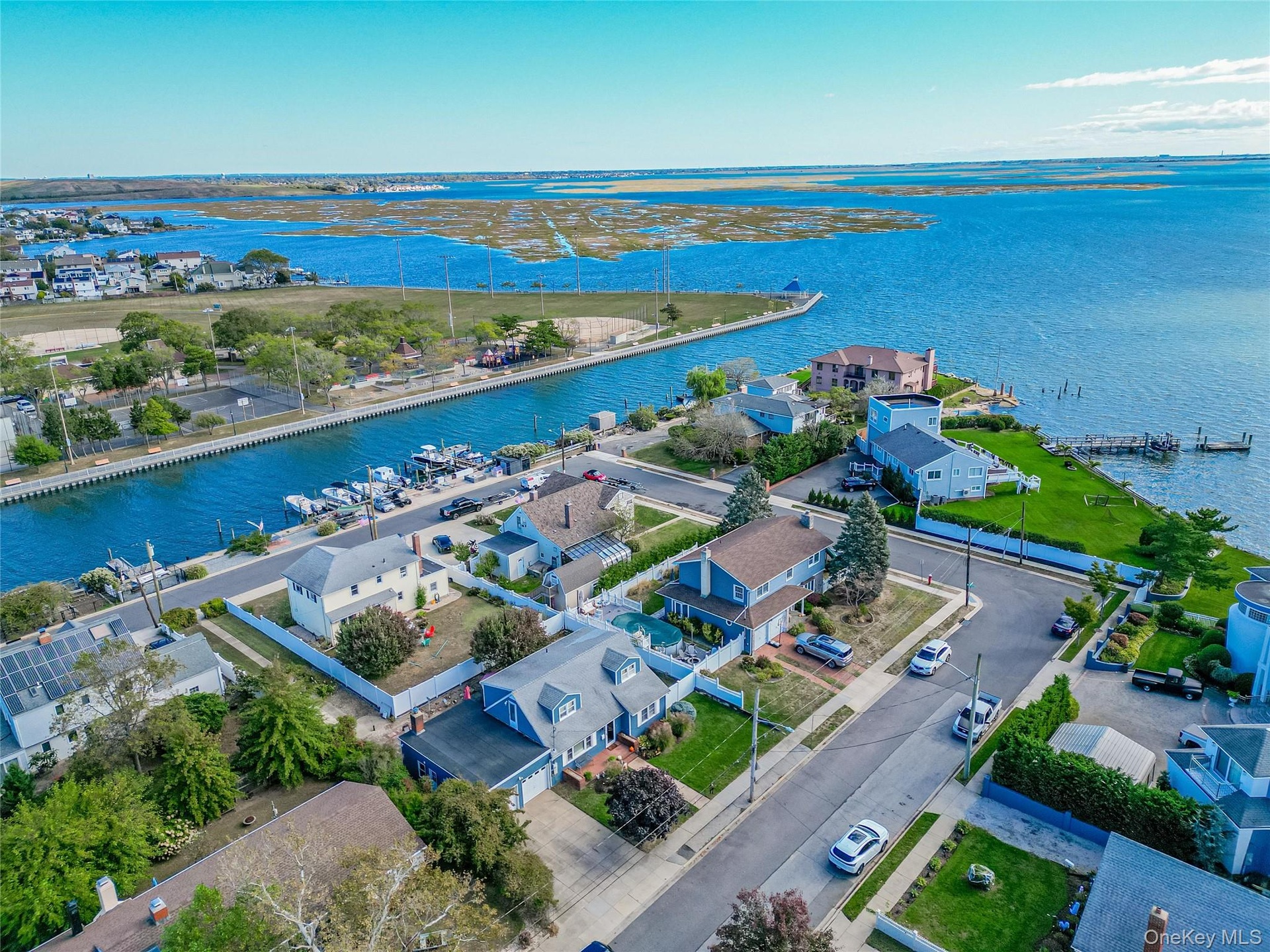 - Aerial perspective of suburban area featuring a large body of water and a notable bridge