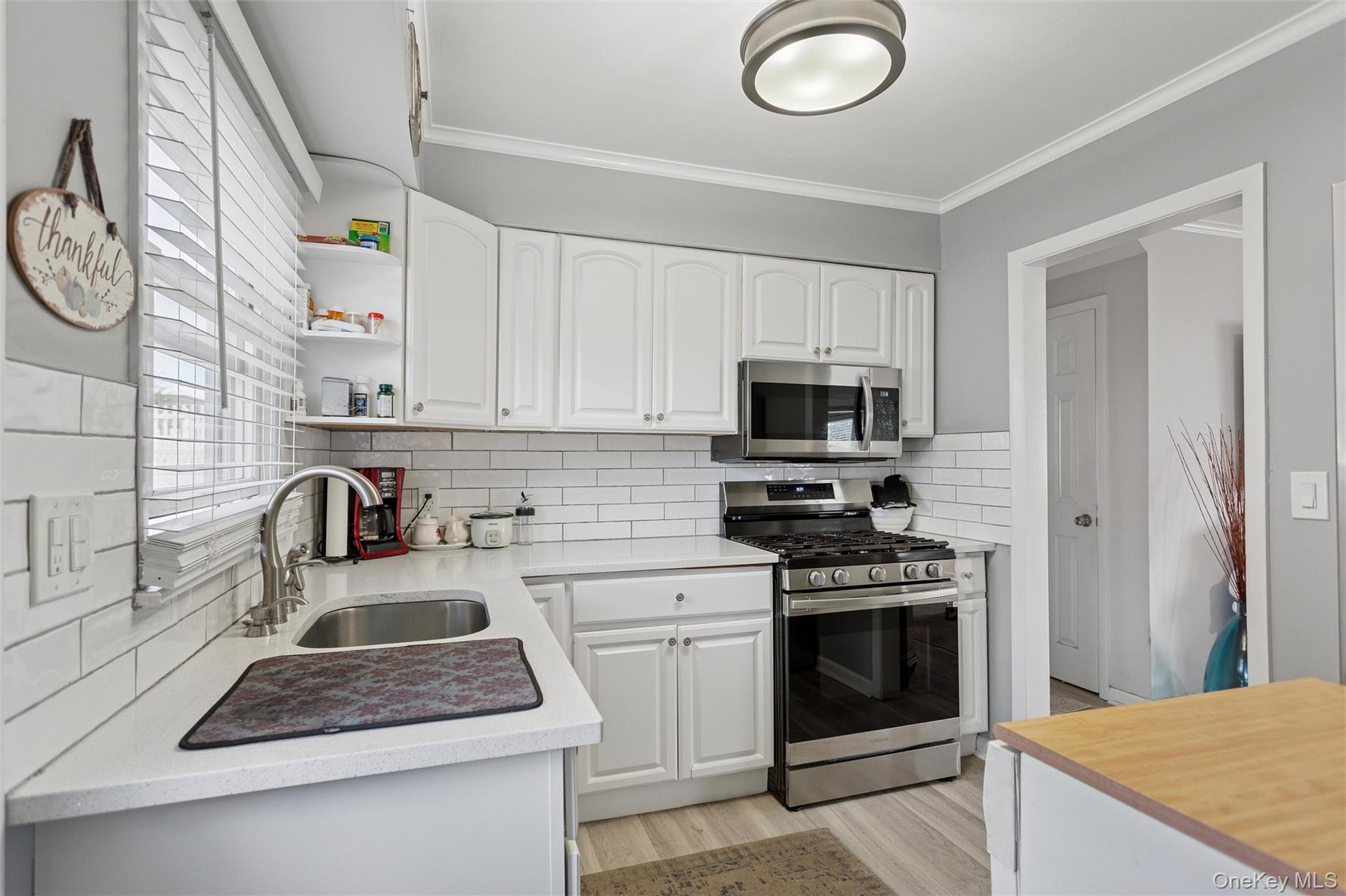 - Kitchen with appliances with stainless steel finishes, white cabinetry, backsplash, ornamental molding, and open shelves