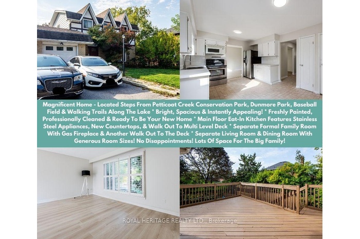 Magnificent Home - Located Steps From Petticoat Creek Conservation Park, Dunmore Park, Baseball Field & Walking Trails Along The Lake * Bright, Spacious & Instantly Appealing! * Freshly Painted, Professionally Cleaned & Ready To Be Your New Home * Main Floor Eat-In Kitchen Features Stainless Steel Appliances, New Countertops, & Walk Out To Multi Level Deck * Separate Formal Family Room (Hardwood Flooring) With Gas Fireplace & Another Walk Out To The Deck * Laminate Flooring Throughout Separate Living Room & Dining Room With Generous Room Sizes! Living Room Has A Beautiful View Overlooking The Front Yard- No Disappointments! Lots Of Space For The Big Family! 3 Spacious Bedrooms * Primary Bedroom Includes A 3PC Ensuite & Wall To Wall Closet With 2 Large Windows * 2 Full Washrooms on 2nd Floor * An Entertainer's Delight With The Beautiful Inground Pool! * Outside Is Your Own Private Oasis! Lounge On The Deck & Take In The Natural Views *BONUS * Separate/ Private Laundry Room On Main Floor- No Sharing Laundry!*. Doesn't Get Better Than This! Basement Not Included. 1 Garage & 1 Driveway Spot. Walking Distance To The Scenic Bridge, Fairport Beach P.S. & Transit, Mins To 401 & 407, Pickering Town Centre, Restaurants & Groceries!! *Tenant to be responsible for snow removal/ grass cutting/ pool maintenance*