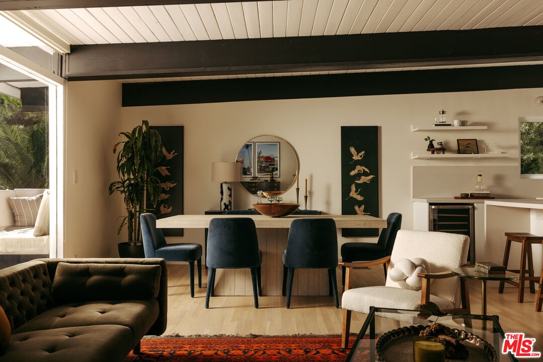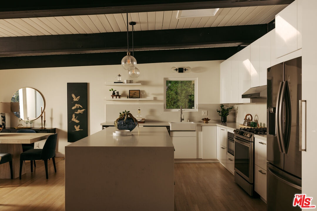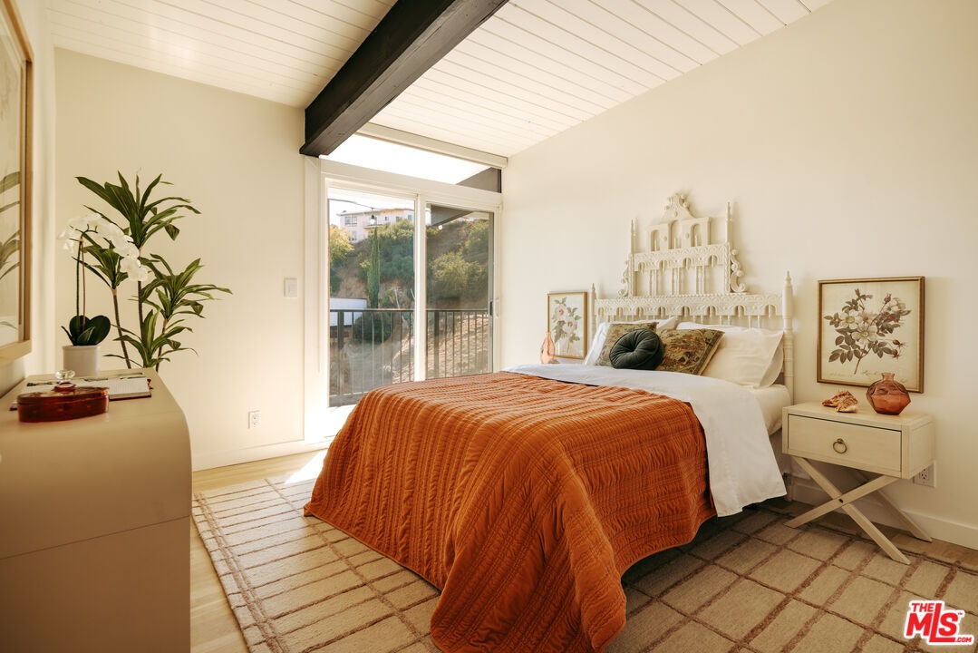 Perched among the winding roads of Beachwood Canyon, this 2-bed, 2-bath post-and-beam dream retreat is cinematic LA living at its best, beautifully balancing between vintage charm and modern elegance. Step through the iconic red double doors into a sun-drenched space where floor-to-ceiling glass frames breathtaking canyon and city views alike. Outside, a sixty-foot deck stretches the length of the home, turning sunset viewing into a nightly event. An ode to the golden era of Hollywood, the living space is anchored by a dramatic black lava-stone fireplace, surrounded by warm original hardwood floors, exposed beams, and abundant light. The open layout flows into a newly remodeled chef's kitchen with quartz countertops, custom cabinetry, stainless steel appliances, and an oversized island perfect for dinner parties, deep talks, or dirty martinis. The primary suite opens right onto the deck for coffee-at-dawn or wine-at-dusk moments. Both bathrooms are reimagined with floating vanities and modern finishes. Bonus points include a Level 2 Tesla charger, central HVAC, and an oversized steam shower. The second bedroom easily moonlights as a guest room, office, or podcast studio. Outside your door, this corner of Beachwood Canyon feels like its own little world, complete with a cafe, market, and post office. It's character, calm, and city-light magic with just enough wink and wonder to remind you why everyone falls in love with this town.