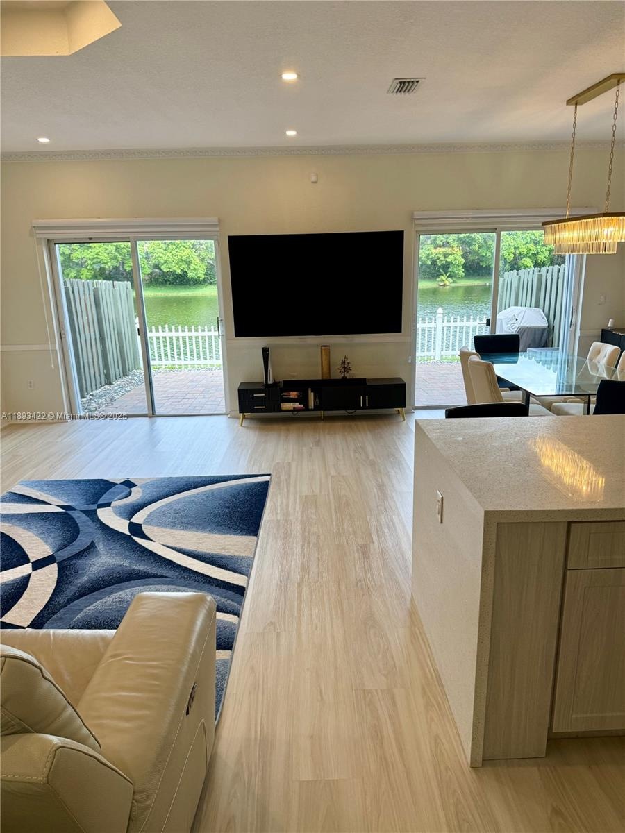 Discover this one-of-a-kind, fully renovated lakefront home in one of Miramar’s most desirable communities! This 3-bed, 2.5-bath residence offers breathtaking water views, a bright open layout, and NEW stainless-steel appliances. The designer kitchen features quartz countertops, custom cabinetry, and flows into sunlit living areas. Enjoy luxury vinyl flooring, modern bathrooms, and smart-home upgrades including an updated garage door control system. The garage has been converted into a stylish office or flex space, perfect for remote work or creative use. Step outside to a private patio overlooking the tranquil lake—ideal for entertaining or relaxing. Conveniently located near top schools, highways, and shopping. No neighbors in the front or back for privacy. Move-in ready!