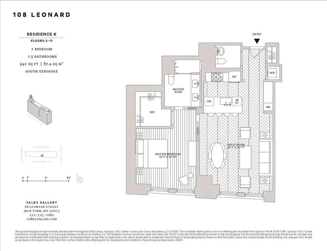 Paying homage to the most coveted elements of an architectural masterpiece at 108 Leonard, ornamental majesty and historic provenance are leveraged anew with fresh modern forms and contemporary design priorities. Noteworthy touches such as Forbes & Lomax switches and outlets, custom curtains, and city quiet windows elevate the living experience in this 944 square foot 1 bedroom, 1.5 bath residence, which features unrivaled quality and composition.