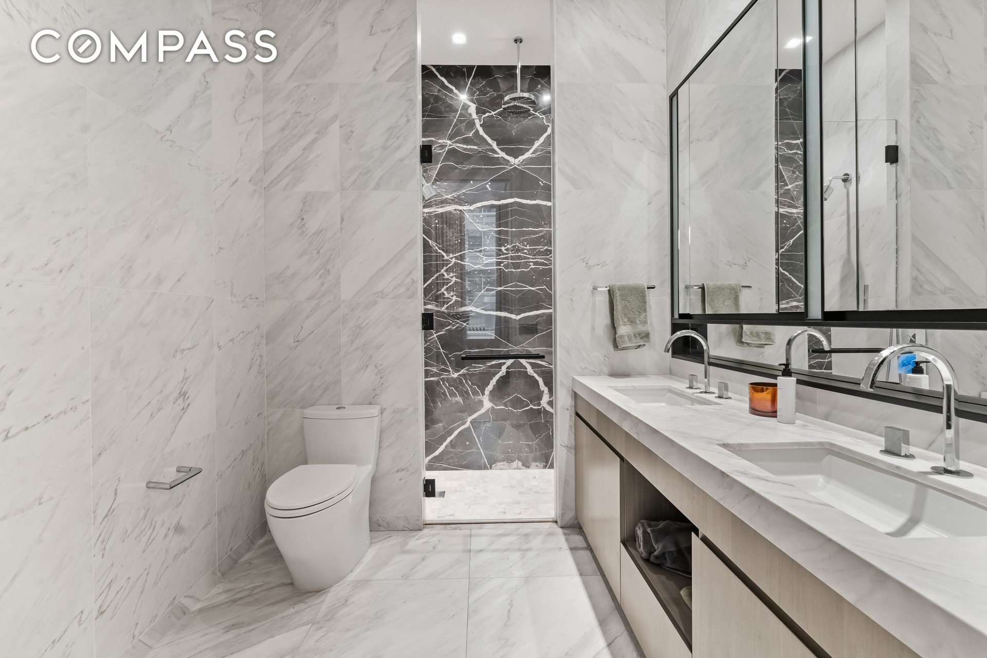 The Master Suite boasts large windows, a massive walk-in closet, and a well-appointed en suite bathroom with high-honed Calacatta Mandria marble floors and walls. Fantini polished chrome fixtures are paired with a custom double vanity and oversized walk-in shower. A striking powder room with a sculptural Nero Marquina marble sink and black metal mirror with integrated lighting is thoughtfully situated off of the entry gallery. A utility closet that conceals a washer and dryer completes this singular offering.