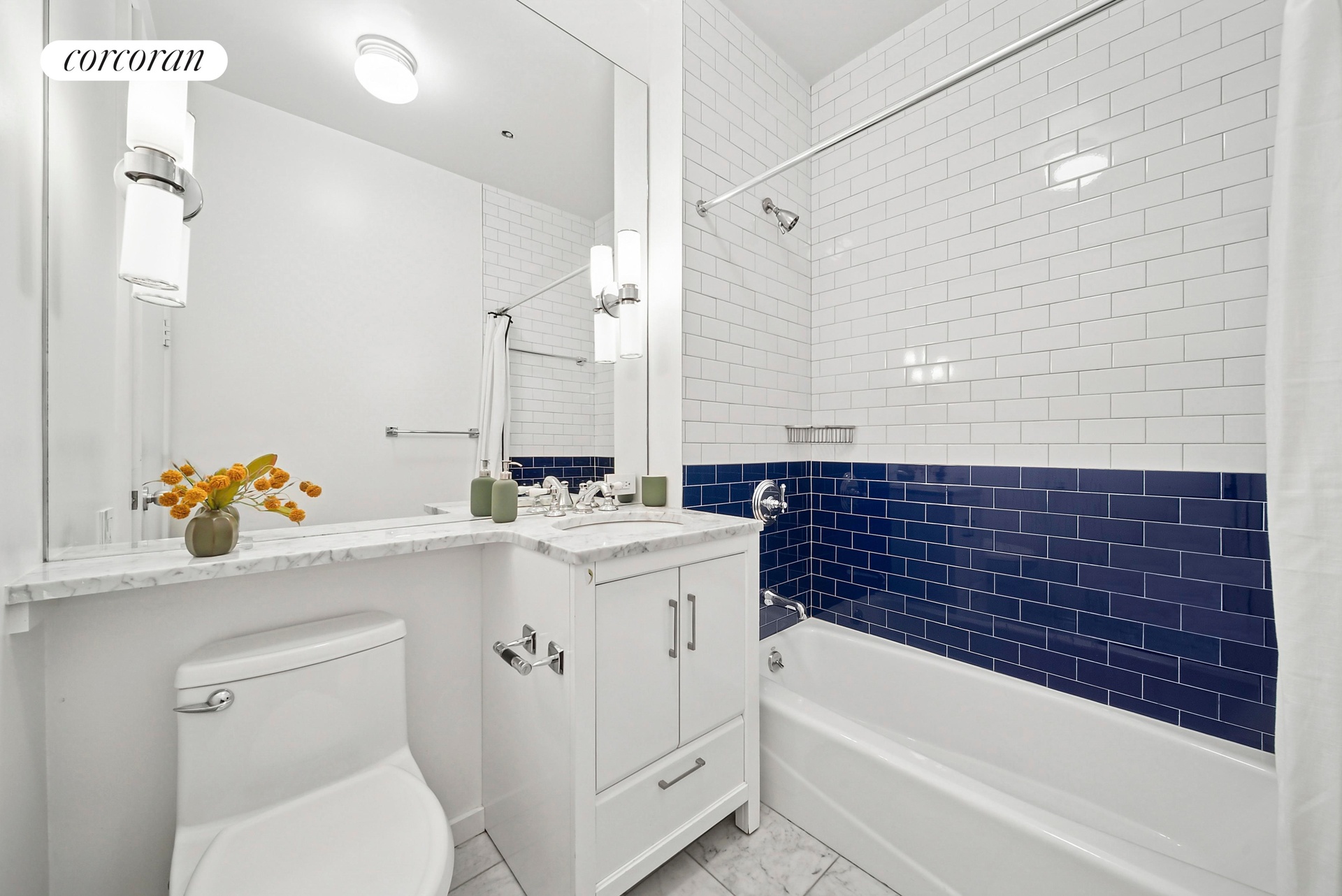 Oversized south-facing windows flood the home with sunlight, creating a warm and inviting backdrop with soaring 10 ft ceilings. The expansive open-concept living and dining area offers ample space to host dinner parties, gather with friends, or simply unwind after a long day. The chef's kitchen seamlessly connects to the space, featuring granite countertops, generous storage, and high-end appliances including a Bosch dishwasher, Bertazzoni refrigerator, Wolf range, and wine fridge. A built-in office nook provides a stylish and functional work-from-home setup.The sun-drenched primary suite faces south and easily accommodates king sized furniture.. Its en-suite bathroom includes a dual vanity and glass-enclosed shower, creating a serene retreat.The secondary bedroom offers a massive walk-in closet and comfortably fits large furnishings. The adjacent full bath features a deep soaking tub and stylish porcelain subway tile. Additional highlights include in-unit washer/dryer, generous storage throughout and Nest thermostats for comfortable climate control.