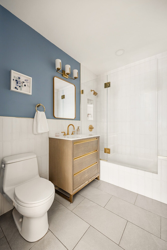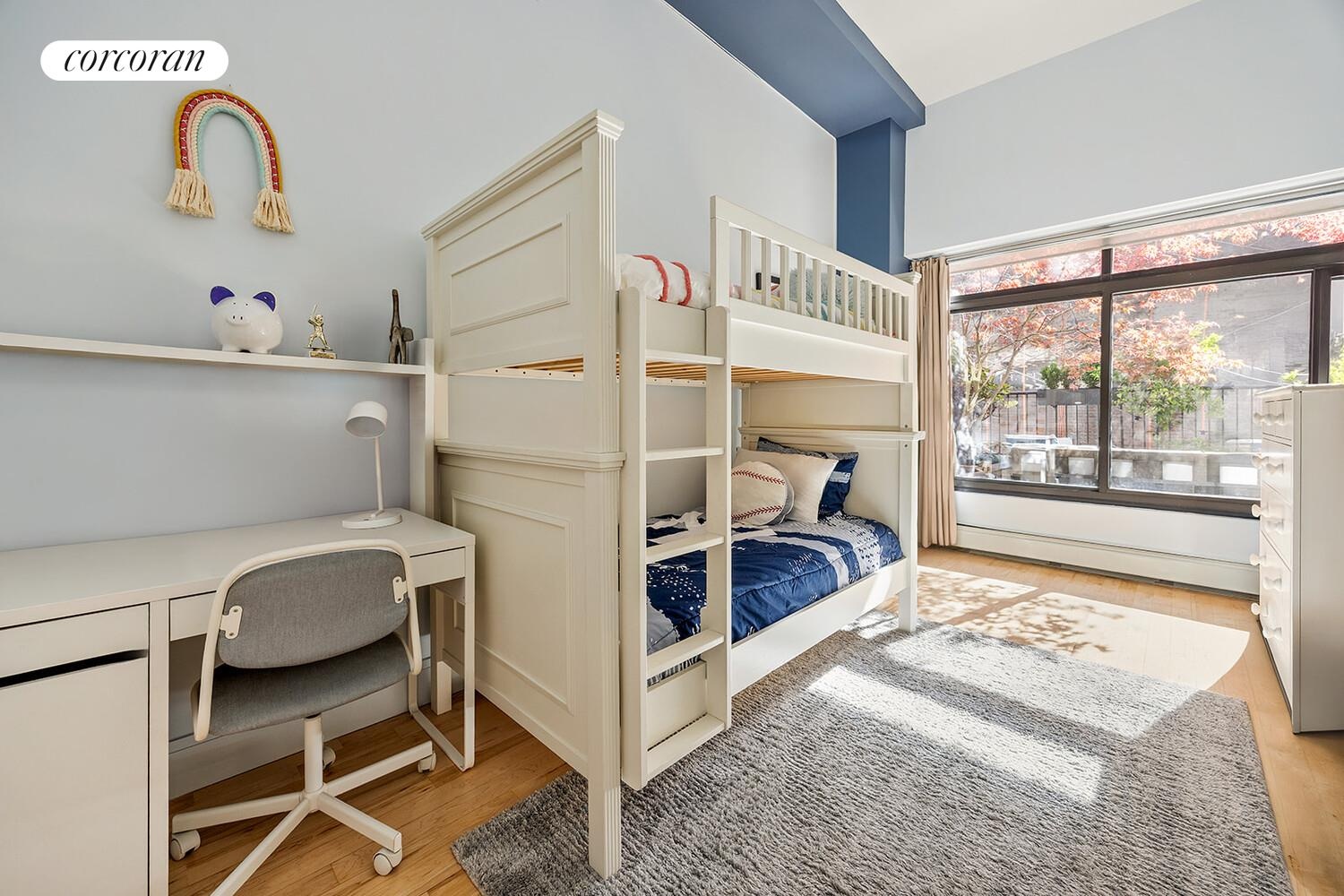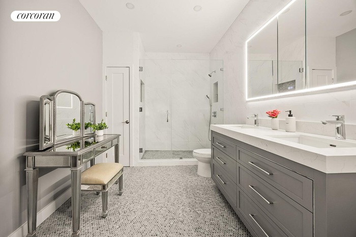 The enormous primary bedroom has a wall of glass windows overlooking the terrace, and plenty of room for a king-size bed plus additional furniture, a home office area and more. It includes a custom built-in wardrobe, a spacious refinished walk-in closet, and a stunning newly-renovated en suite master bathroom with walk-in shower, double sink vanity, lighted medicine cabinets, and linen closet.