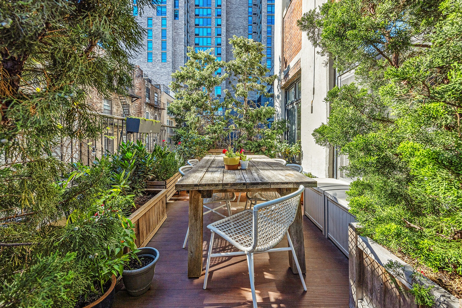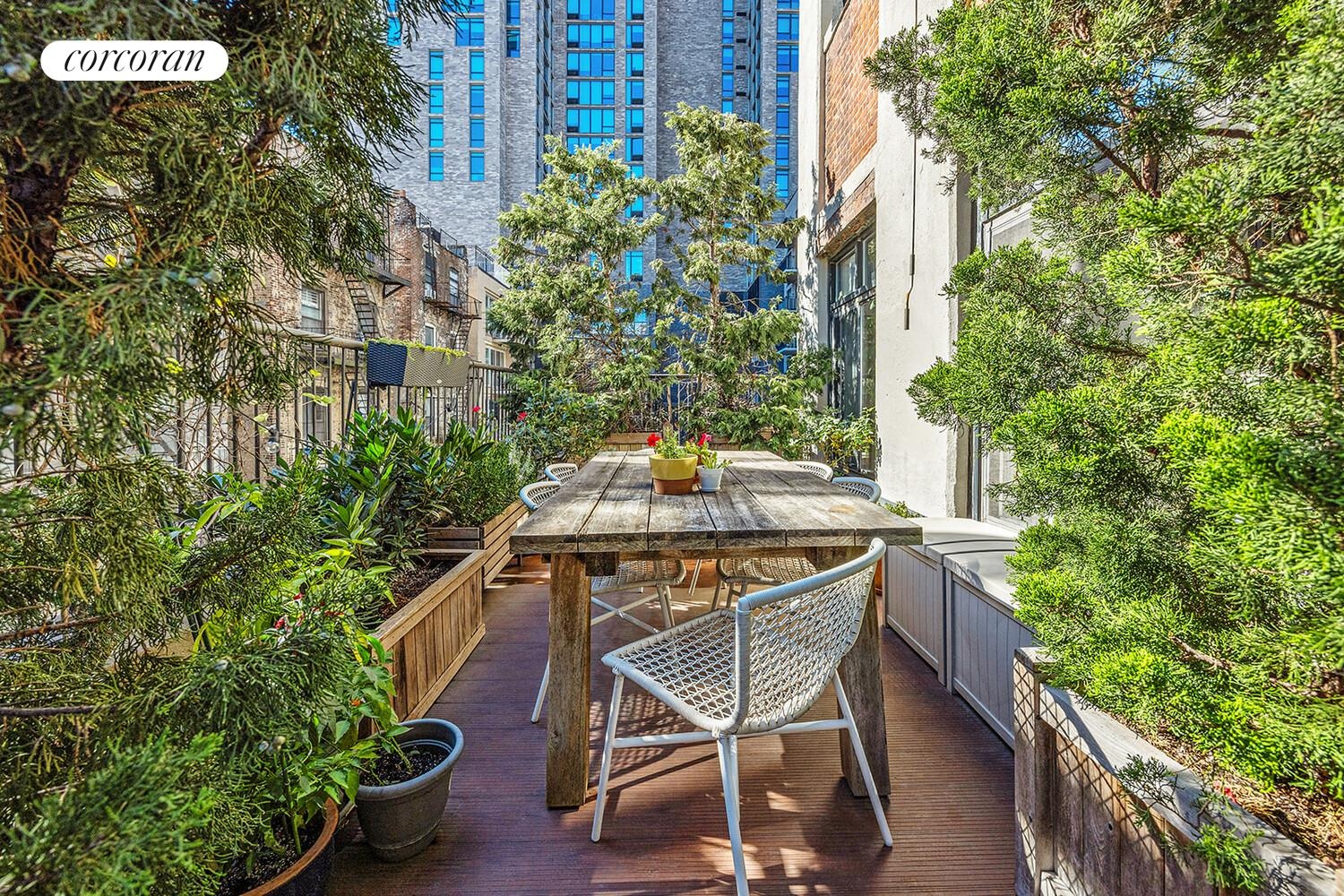 Enjoy generous light-filled interiors and a large private outdoor space in this beautiful 2 bedroom, 2 full bathroom home with soaring 12 foot ceilings. Located in the full-service Newswalk condominium in prime Prospect Heights. Apartment 212 is bright, airy and elegant with hardwood floors and modern finishes. To the left of the entry foyer is an open chef's kitchen appointed with ample cabinets, sleek granite countertops, a center island with seating, chic tiled backsplash, and stainless steel appliances, including a double oven. Off the kitchen is an open dining area that can fit a large table, and an expansive living room. A wall of glass windows has a door to the spacious terrace for lounging, gardening, alfresco dining, and entertaining.