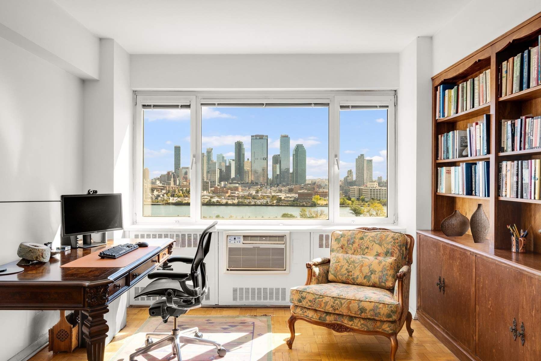 The entry foyer leads to a large gallery with nearby powder room, flowing into expansive corner living and dining rooms, bathed in natural light and sweeping river vistas. The adjacent library/fourth bedroom also showcases the same breathtaking views.