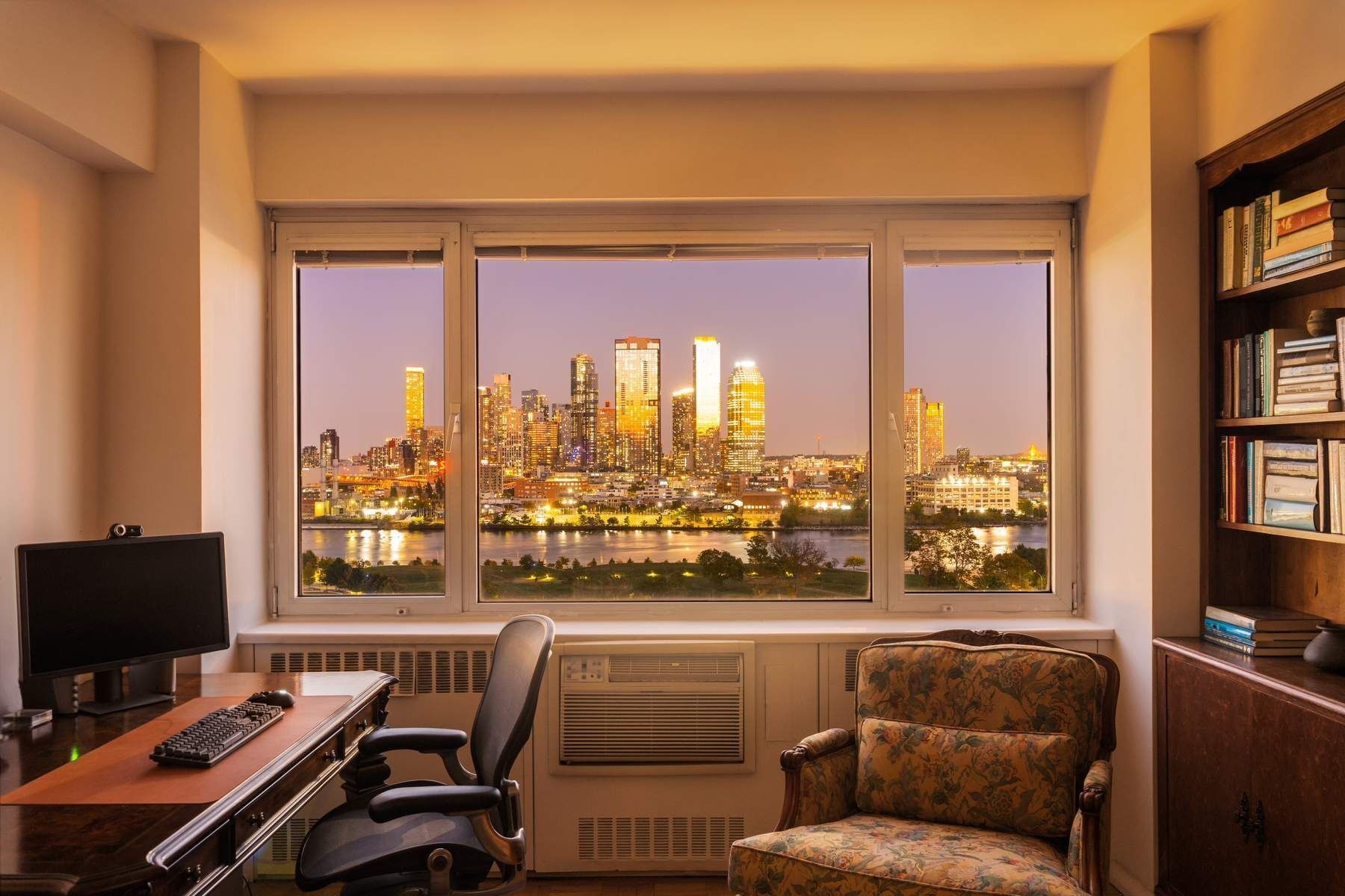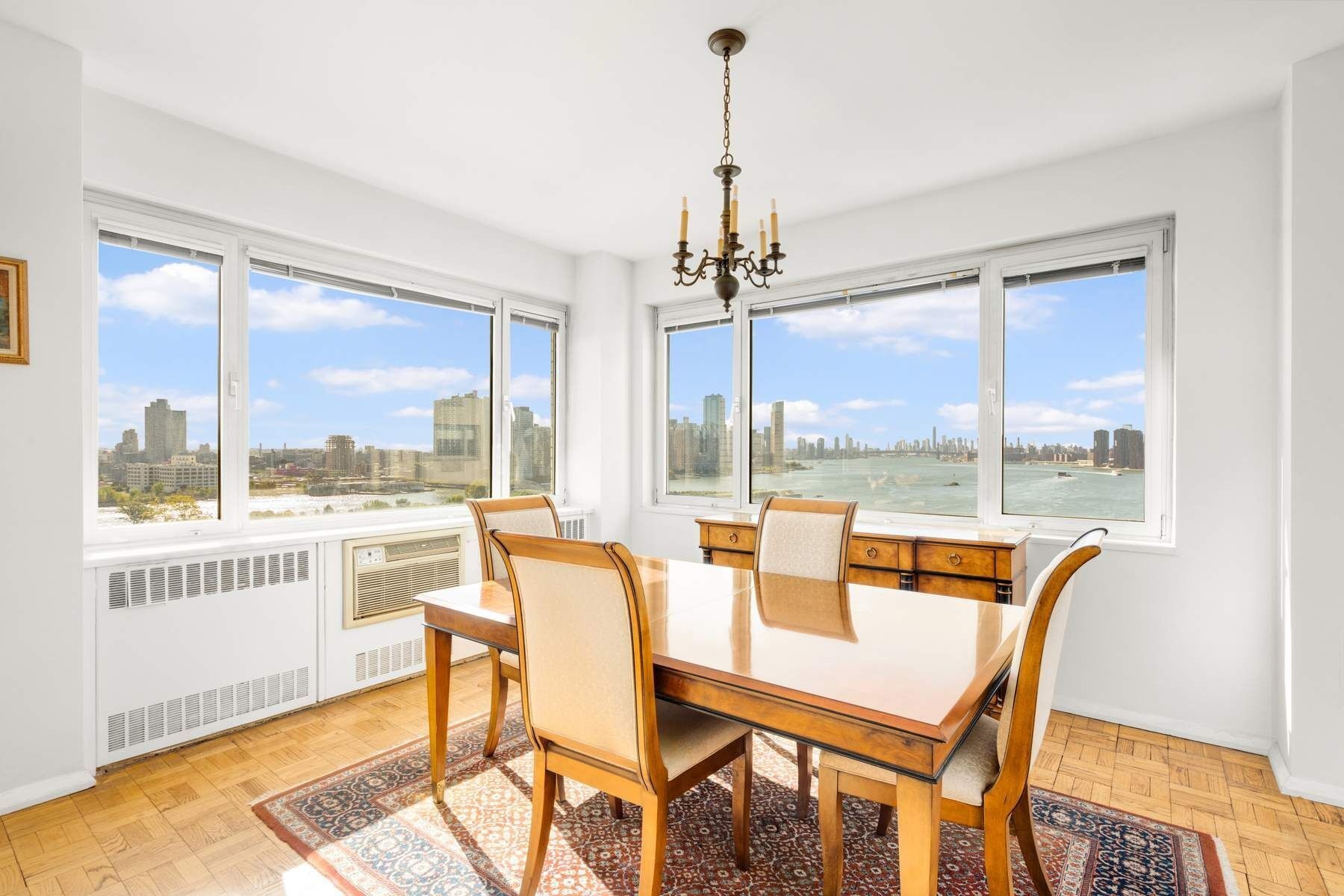 Walls of glass frame panoramic skyline and East River views in this luminous corner four bedroom co-op.