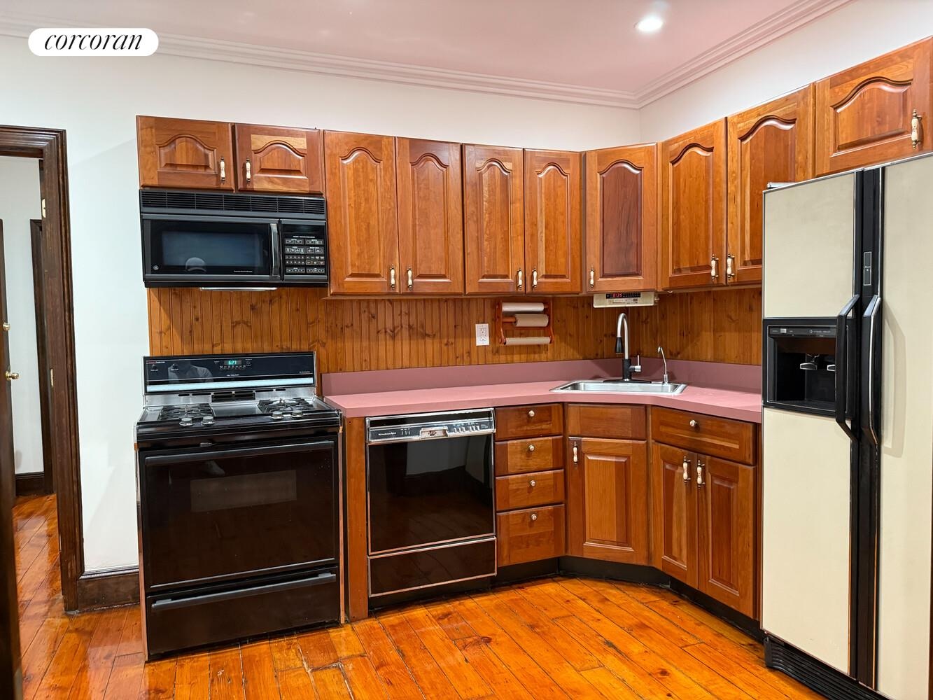 The living room is east-facing, looking out to 6th Ave, with the original French pocket doors separating the kitchen from the living room. The living room also has the original pocket shutters on the windows for privacy. The kitchen is spacious, equipped with a dishwasher, a large refrigerator, and ample room for a kitchen table. Although the kitchen has not been upgraded, it is fully functioning, and it has a great layout.
