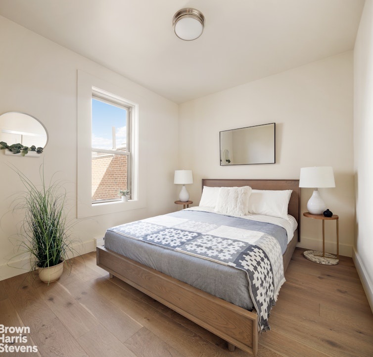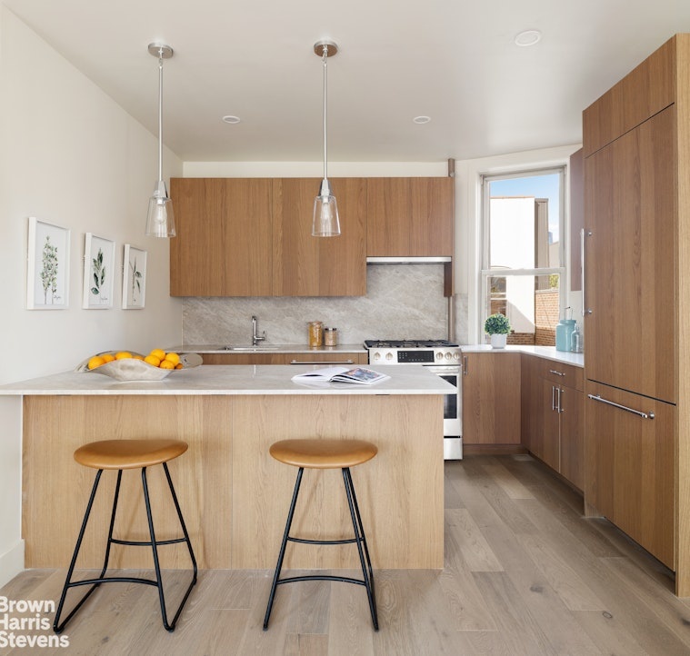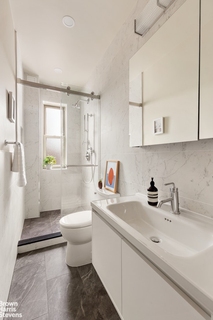 Completely gutted and rebuilt with meticulous attention to detail, the home features a reconfigured layout that maximizes light and functionality, along with new plumbing, full electrical service, and upgraded systems throughout. The kitchen pairs beauty with performance, showcasing Bosch appliances, custom wood veneer cabinetry, and Quartzite Naica stone counters and backsplash. The bathroom was rebuilt with Kohler fixtures and elegant finishes.. Terra Legno engineered wood floors run throughout, complemented by Robert Abbey and Hinkley lighting. An in-unit washer and dryer add modern convenience to this thoughtfully restored pre-war residence.