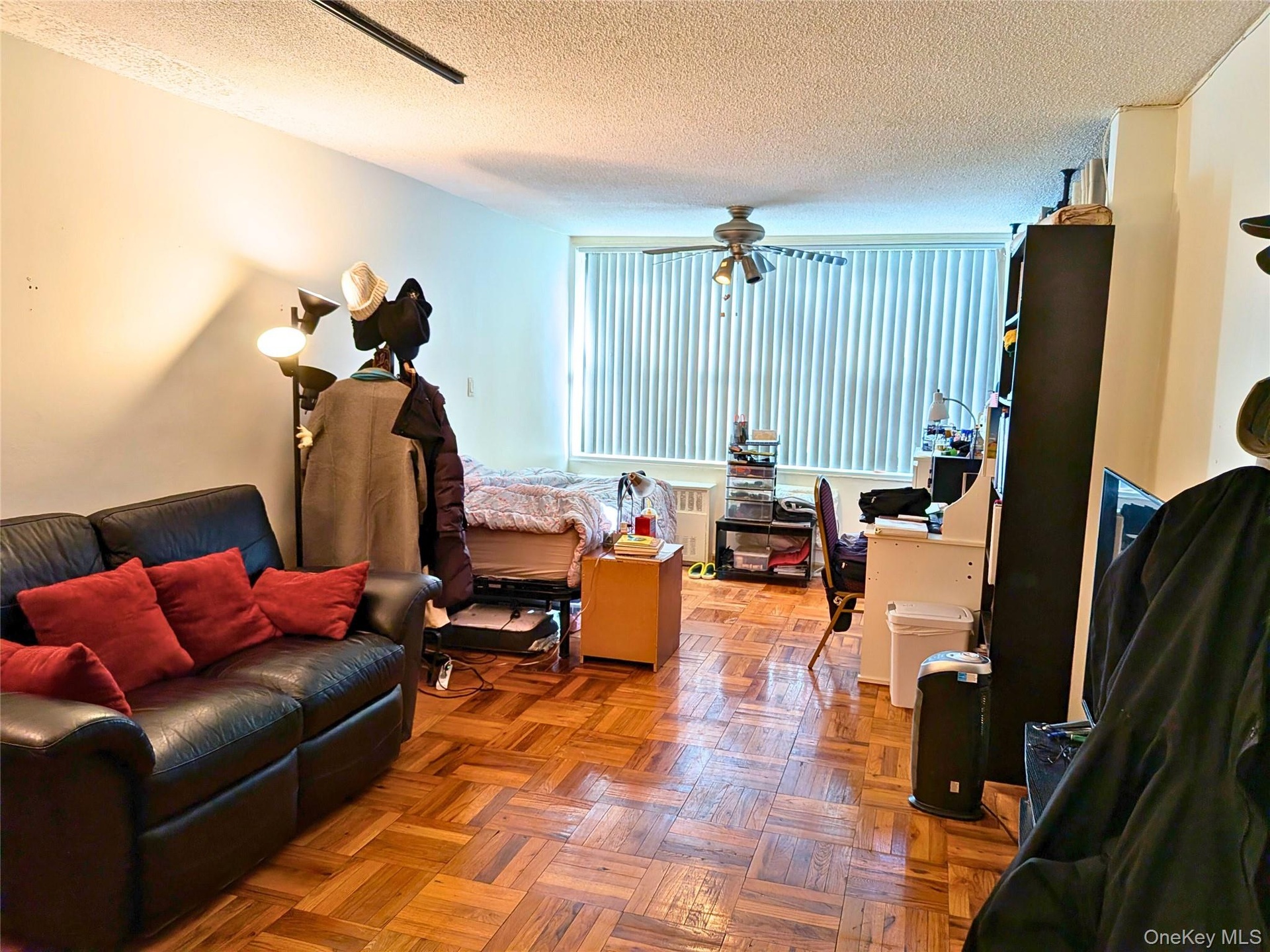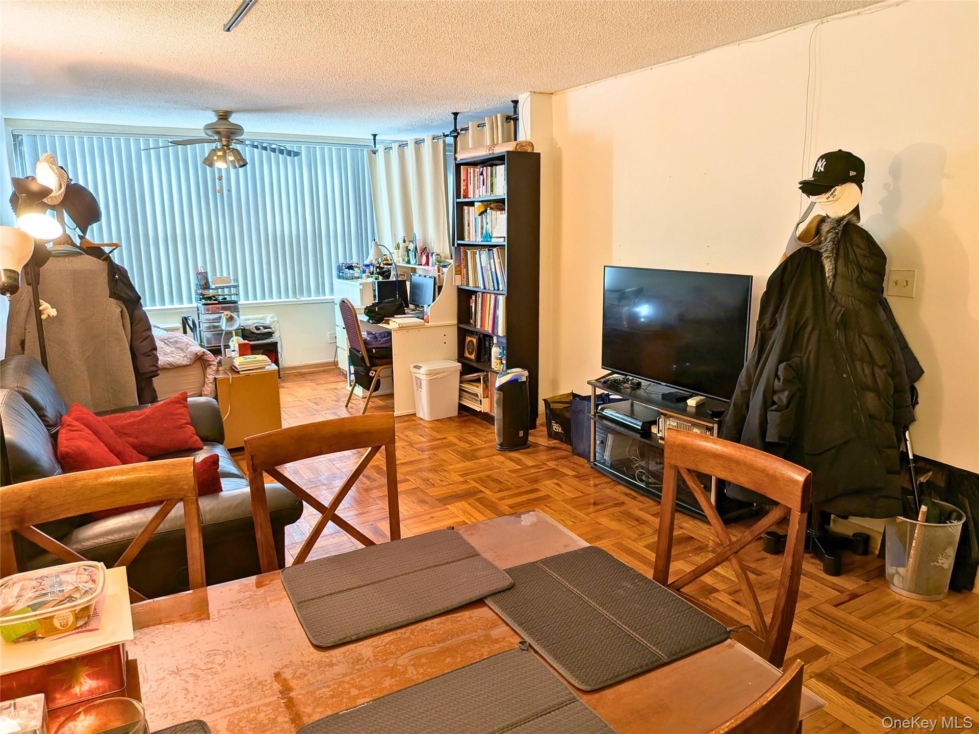 - Living area featuring an office area, a textured ceiling, and a ceiling fan