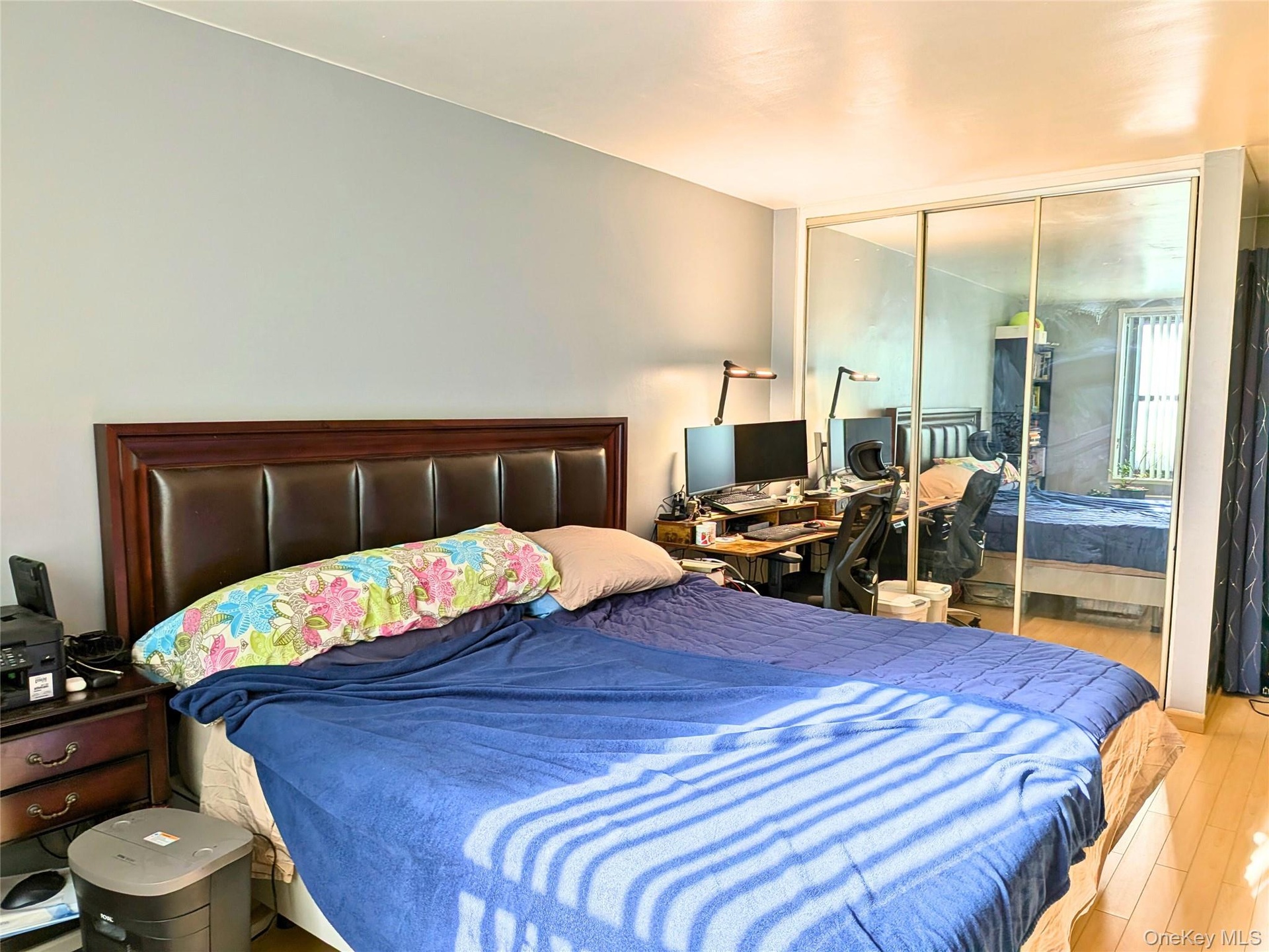 - Bedroom with hardwood / wood-style flooring, a closet, and radiator heating unit