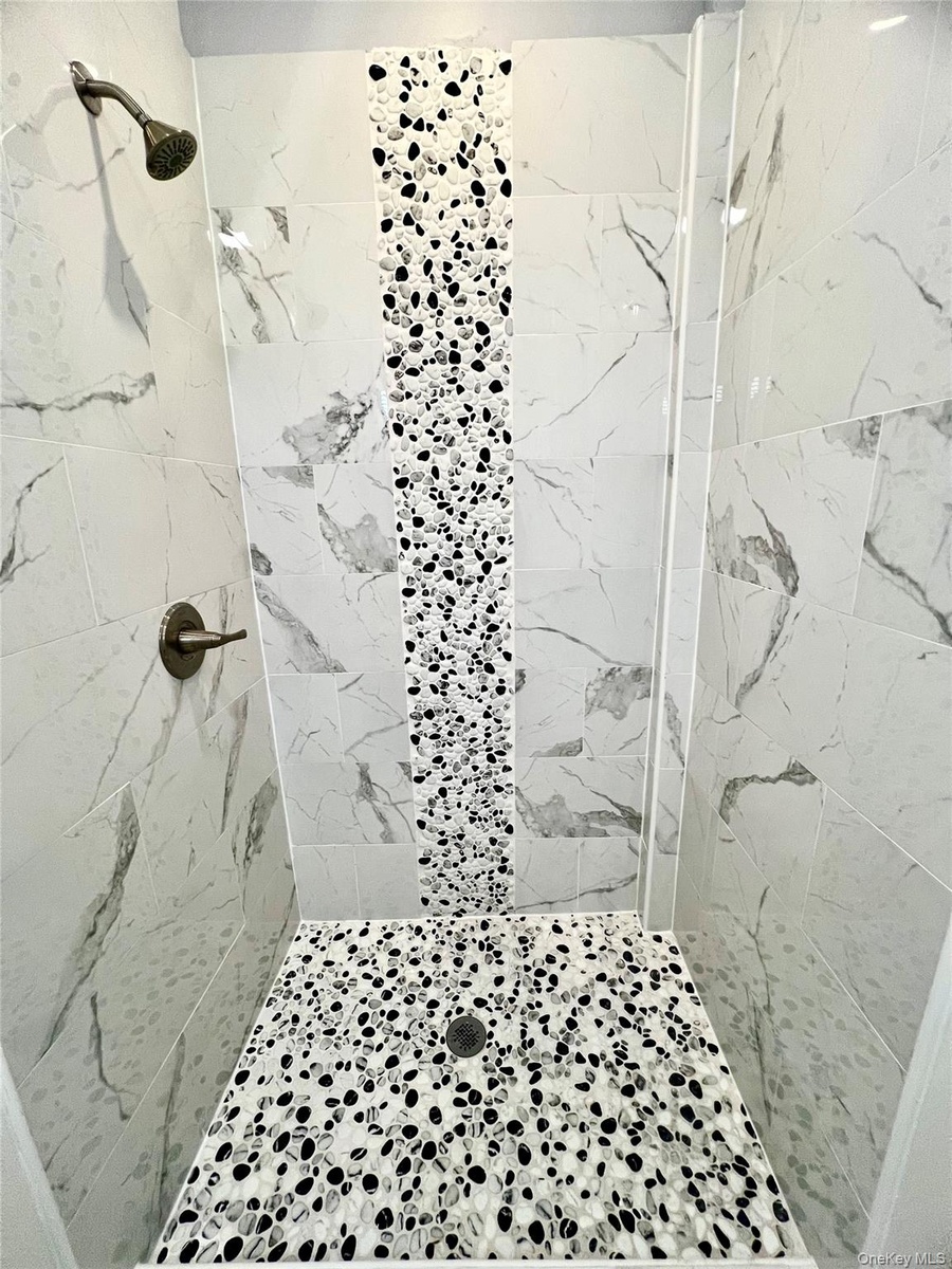 - Full bathroom featuring a marble finish shower