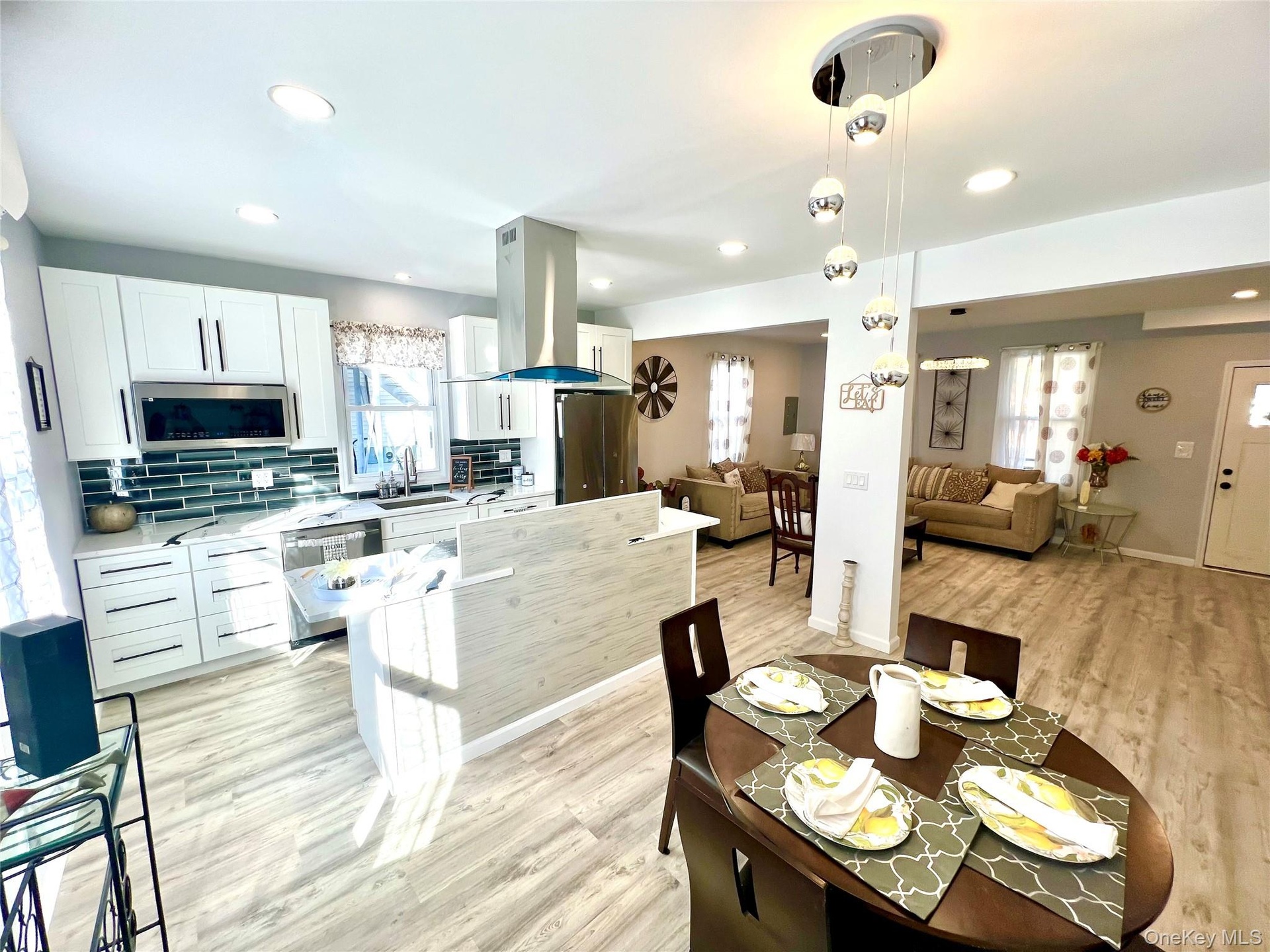 - Dining area featuring light wood-type flooring and recessed lighting