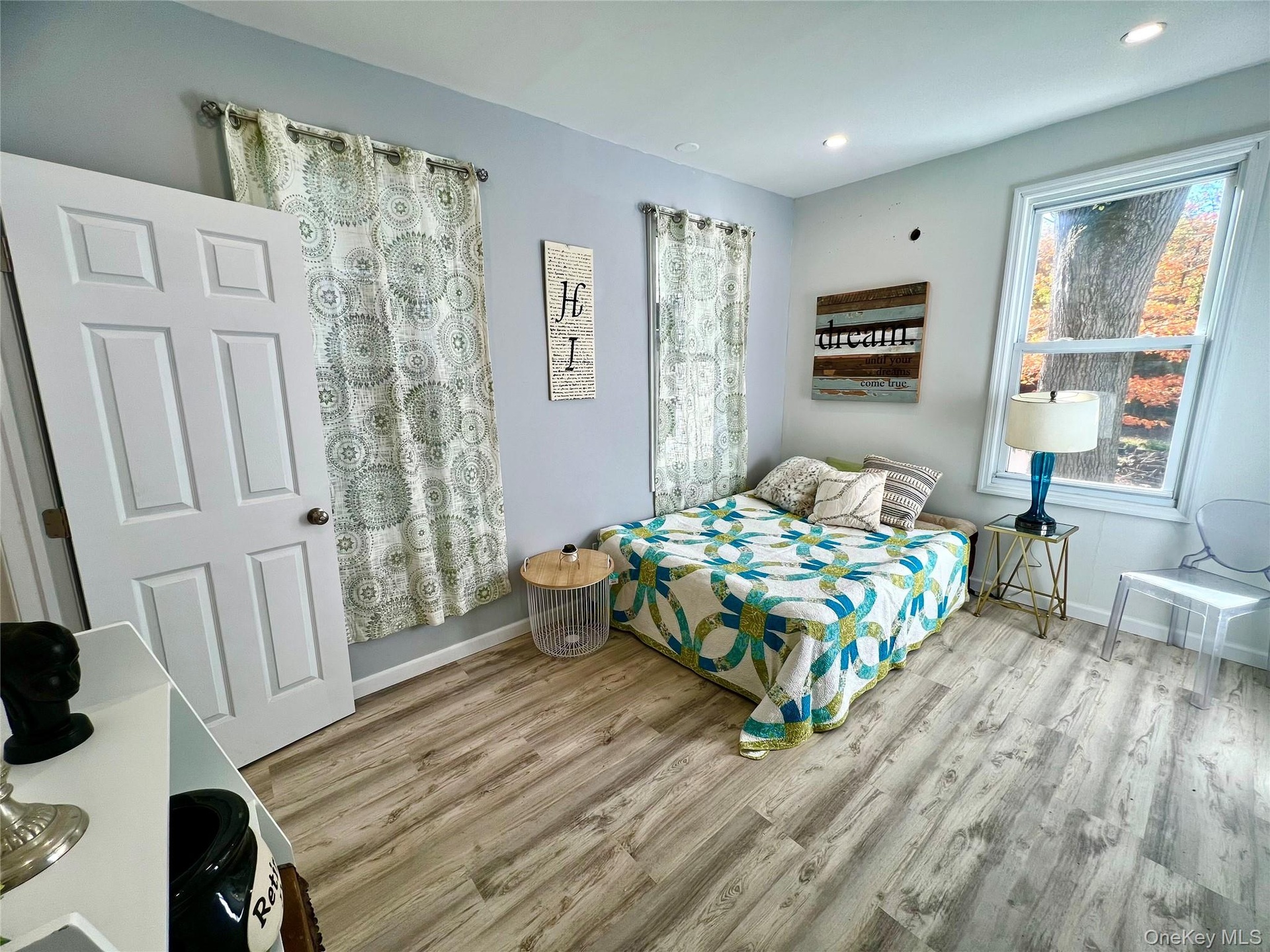 - Bedroom with light wood-style floors and recessed lighting